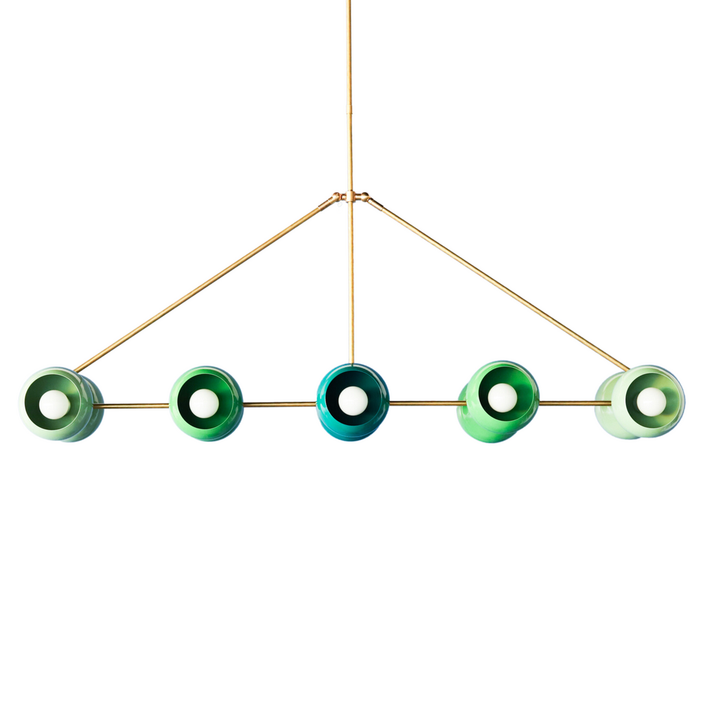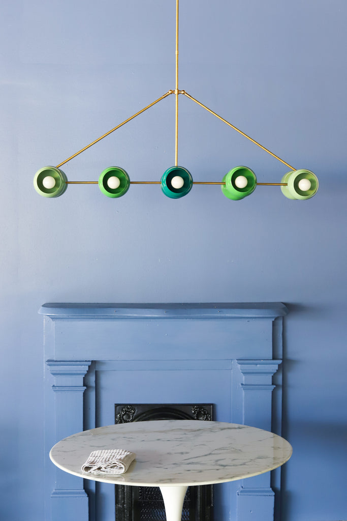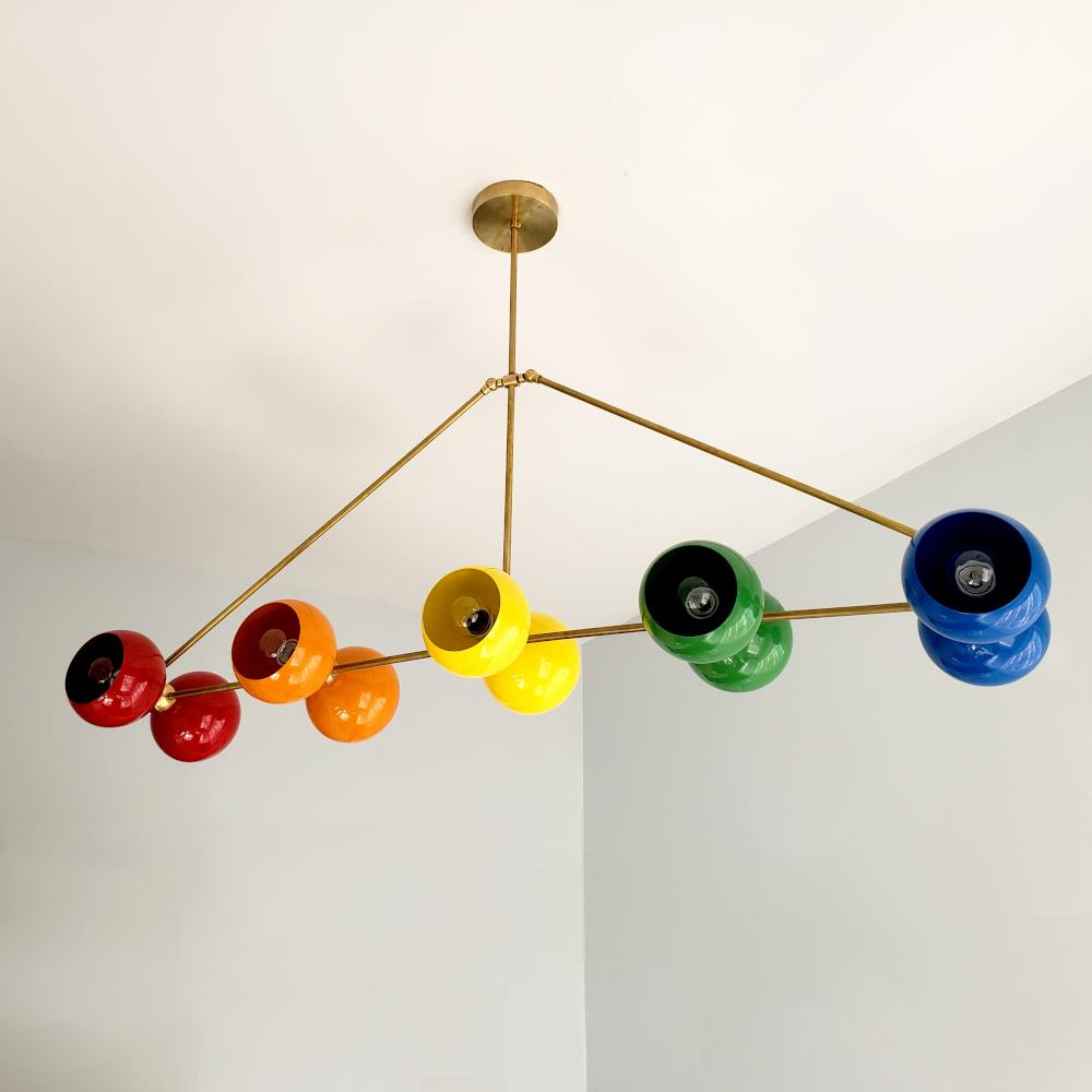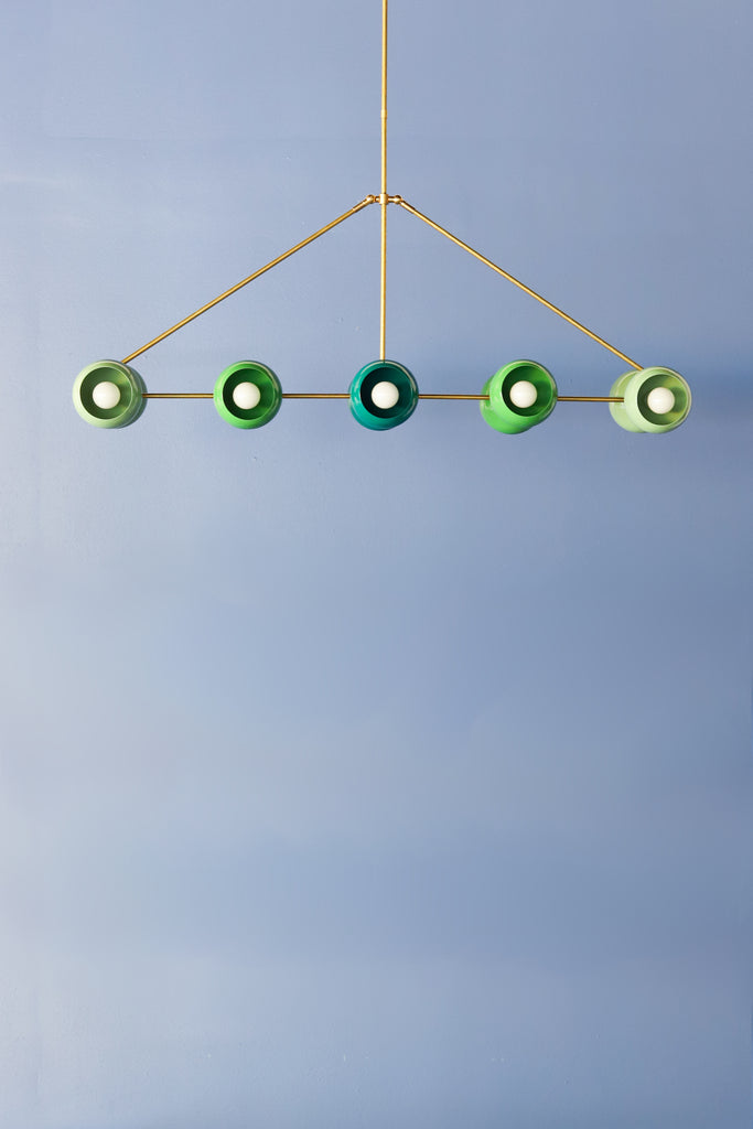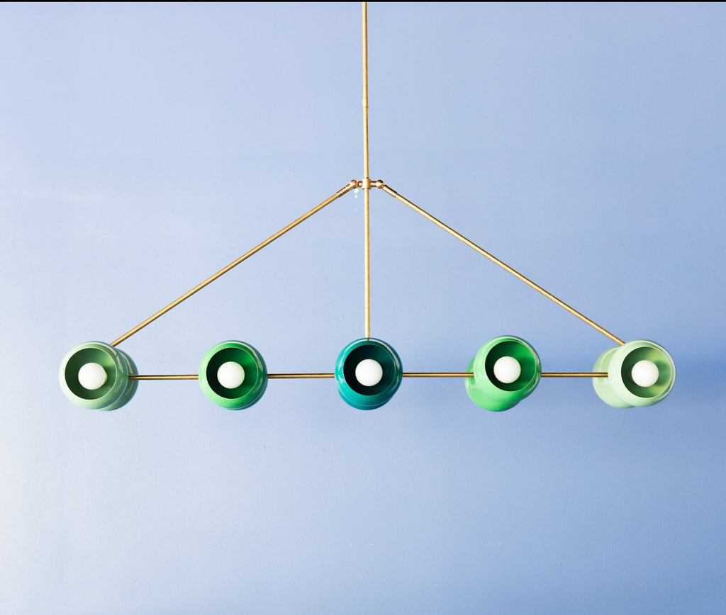 The Tchoup-10 Chandelier is inspired by linear Italian mid-century fixtures and the "hidden shortcut" connecting uptown all the way to downtown New Orleans. The design is updated with its modern finishes and scale. With ten E26 or medium base sockets, this light can be either bright or seductively moody, depending on the bulb chosen. In our black and brass version, we love seeing the contrasting brass interiors of the shades glow when the fixture is turned on.