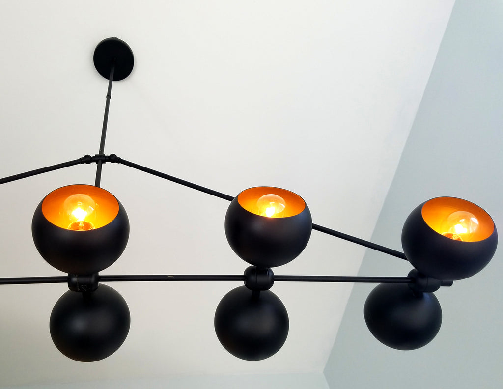The light comes with all mounting hardware. It can be mounted into a preexisting ceiling wire box aka junction box. Max wattage per bulb is 40W. The bulbs used in this photo are E26 G16.5 bulbs in 40W. You can use other bulbs in this fixture. This chandelier, like all of lighting items in the shop is made to order. Please note that the matte black finish takes longer to construct than the raw brass finish by up to three additional weeks. If you have a specific deadline, please let me know.