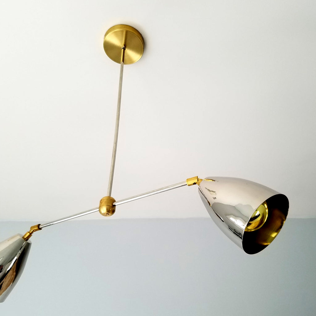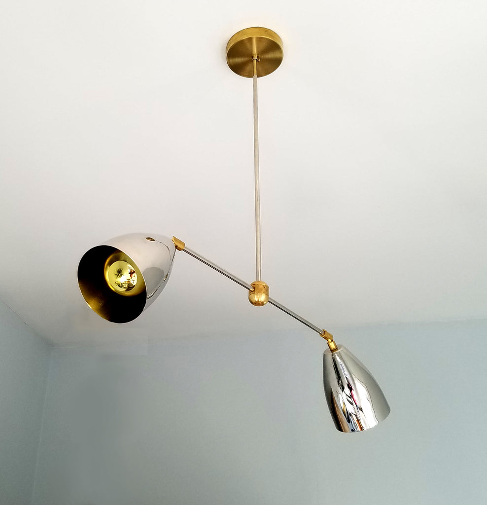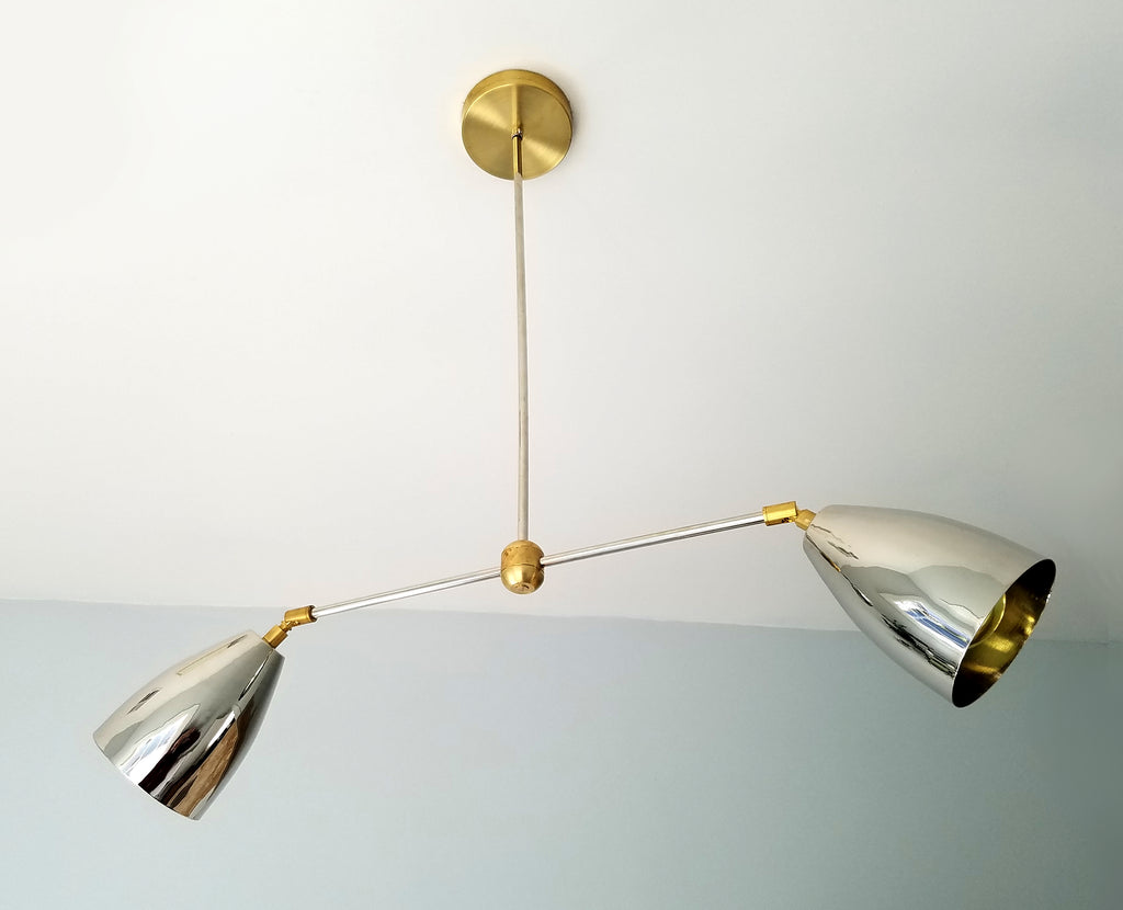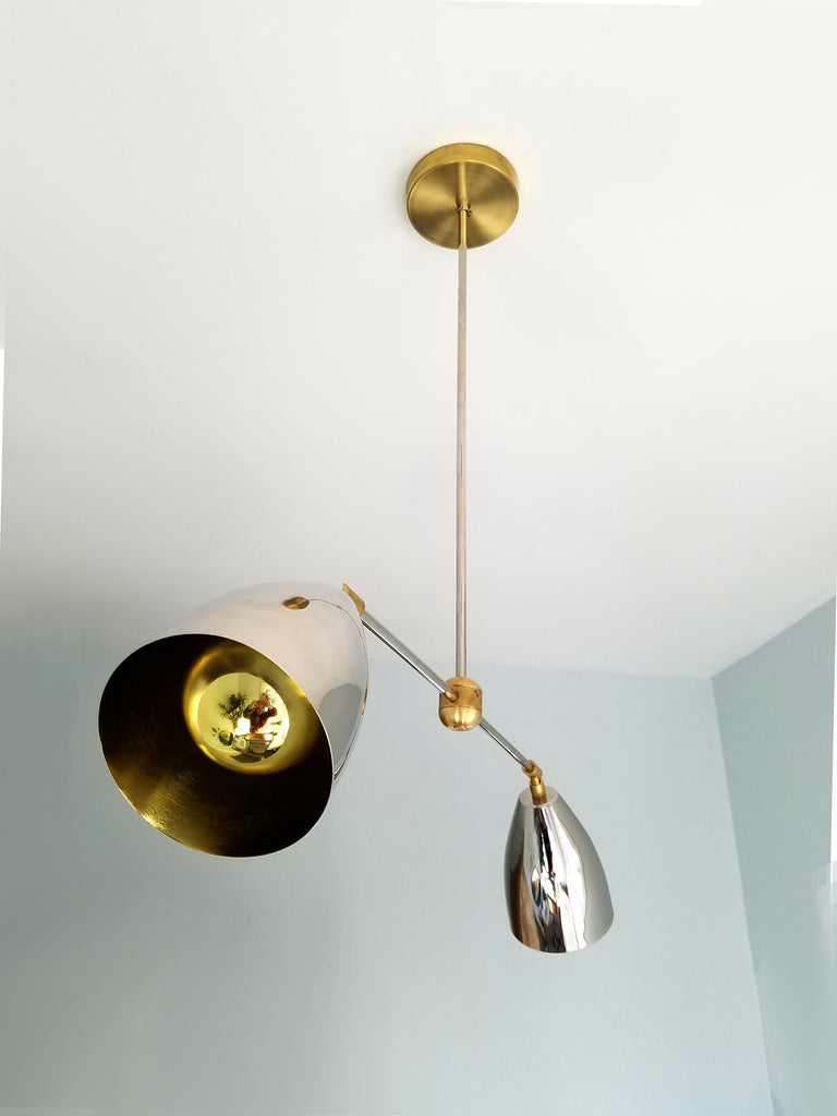 The Drew chandelier is inspired by Italian mid-century fixtures, but is updated with its modern, matte black finish and contrasting raw brass accents. With two E26, or standard sized sockets, this light can be either bright or seductively moody, depending on the bulb chosen. Because each cone has an adjustable hinge, the fixture can even be used to spotlight particular features in a room.