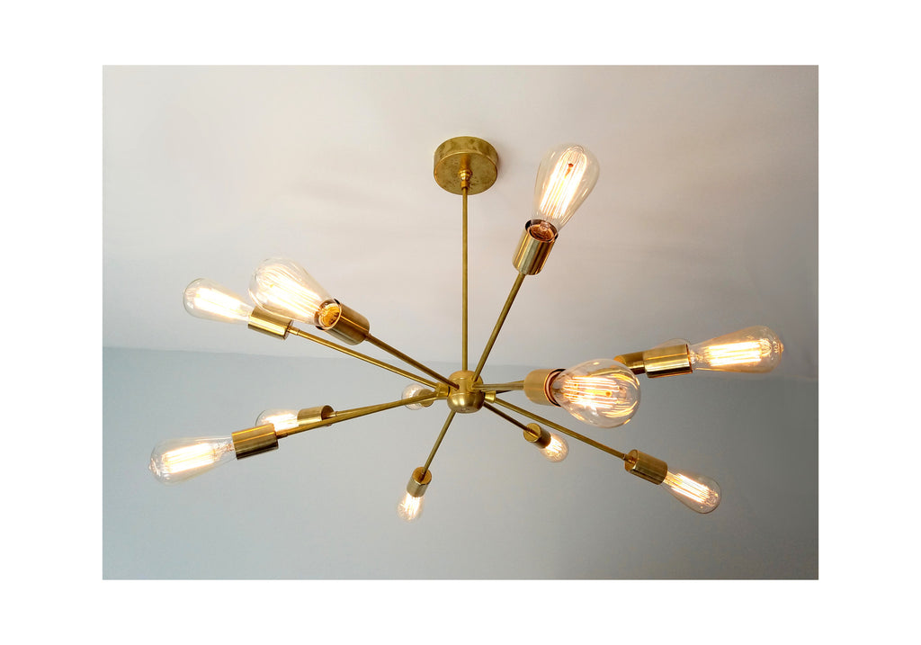 Like most of Sazerac Stitches' fixtures, the Elsie chandelier comes in three finishes: (1) raw brass, (2) chrome, and (3) matte black. This fixture has 12 medium base/E26 sockets. You can use up to 60W bulbs per socket, though I recommend using energy saving alternatives whenever possible. Arm and downrod lengths may be customized to suit your space; message me for additional information.