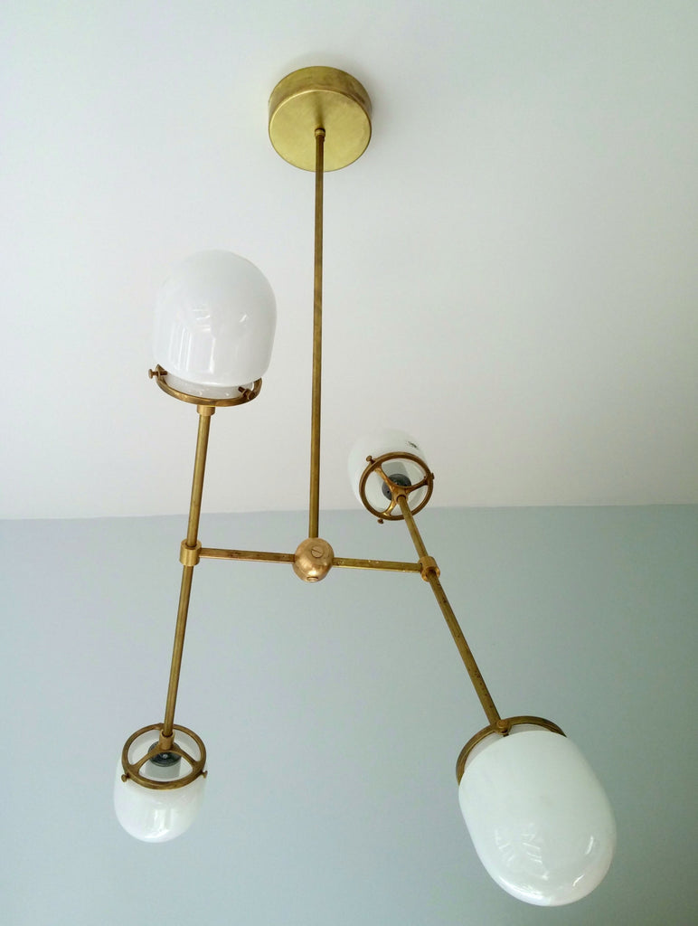 The light can be adjusted in order to be wider, narrower, etc, though it looks as if it will move at any second. It is construction of four E26 sockets with opaque glass shades. There are two finish options: chrome or raw brass. The glass shades may be clear or opaque, let me know your preference in the "note to seller" section.