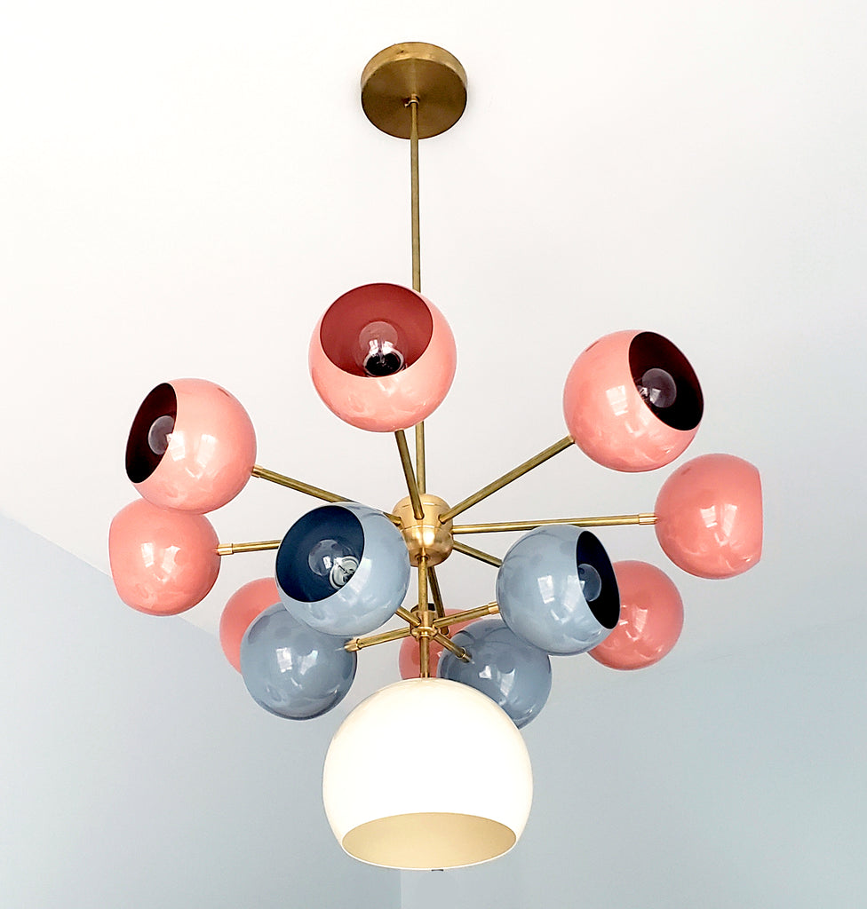 The Solaris Chandelier is a playful three-tiered chandelier with Mid Century Modern vibes.  This chandelier goes great with our other Loa fixtures including our sconces.  Designed to be a statement piece in a large living or dining room, the shade colors can be changed for customization.  Contact us to learn more.