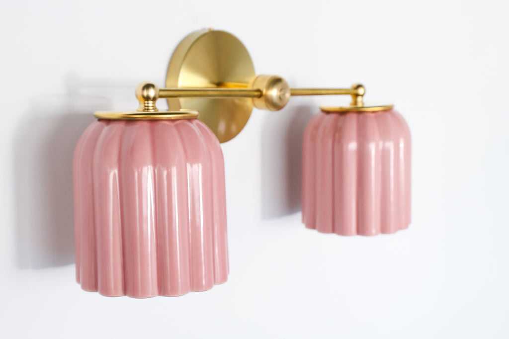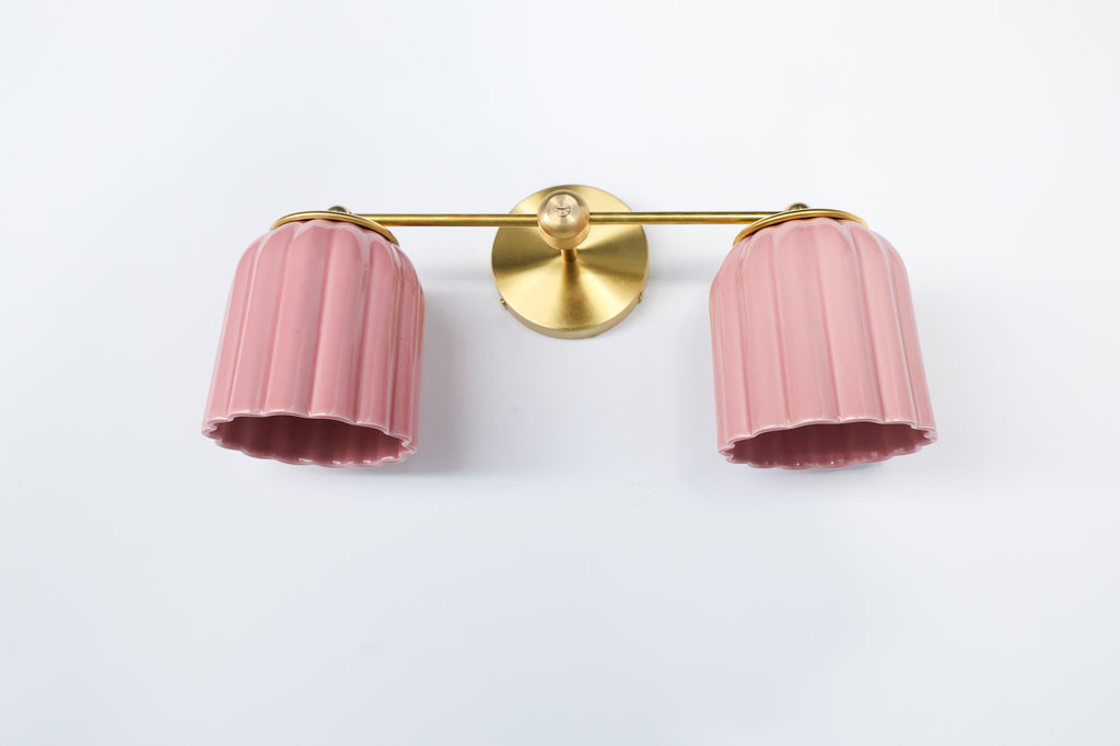 The Marcella Double Sconce is a sculptural ceramic light fixture that blends timeless craftsmanship with modern versatility. Designed by Sazerac Stitches and handmade in Charlotte, NC, each ribbed ceramic shade is produced exclusively for our studio, then hand-assembled with solid brass hardware in our New Orleans workshop.