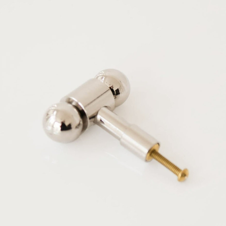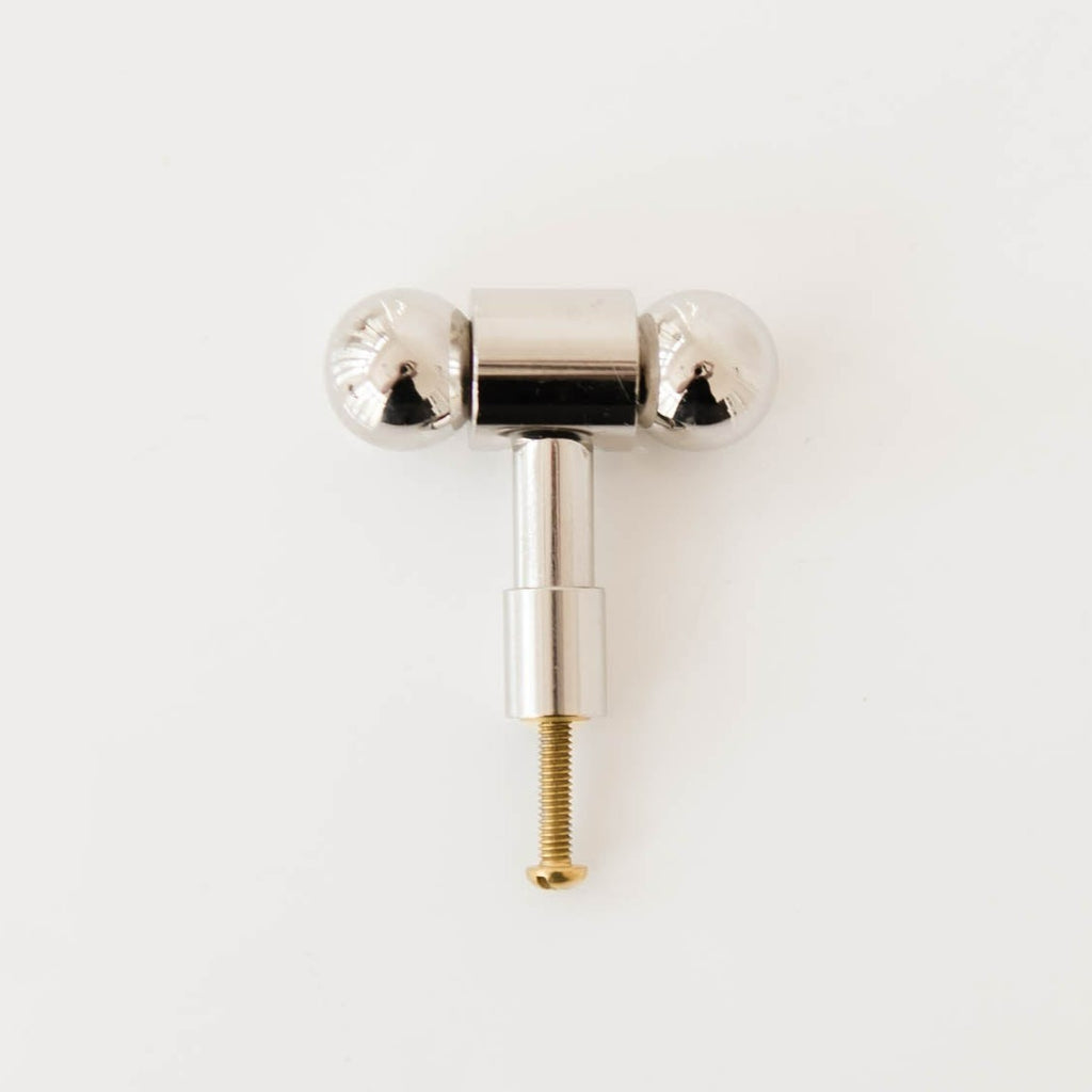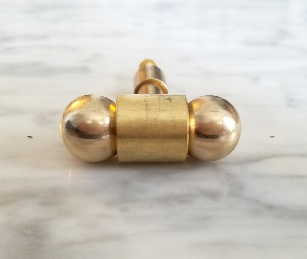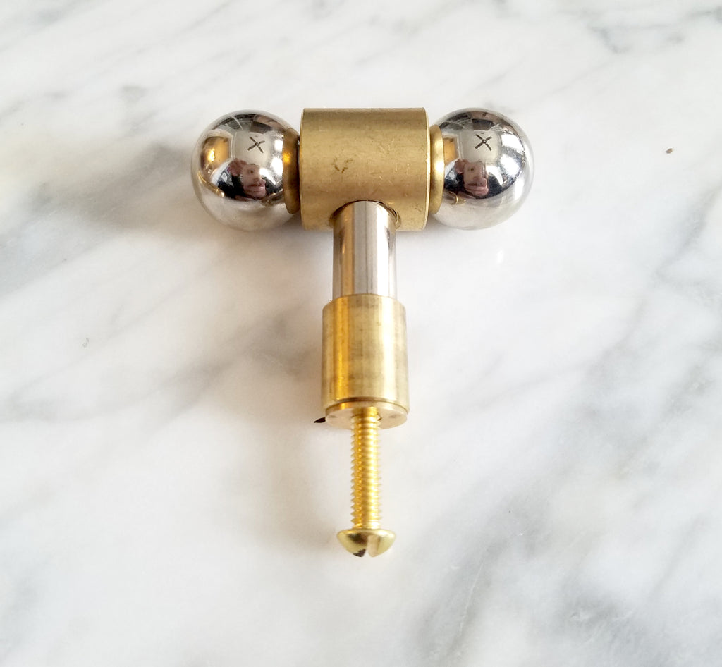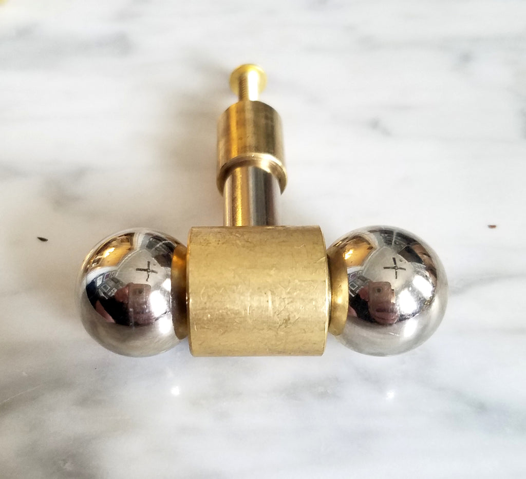 The Milne Knob features a three-piece curvy knob pull in either all brass or brass and chrome.