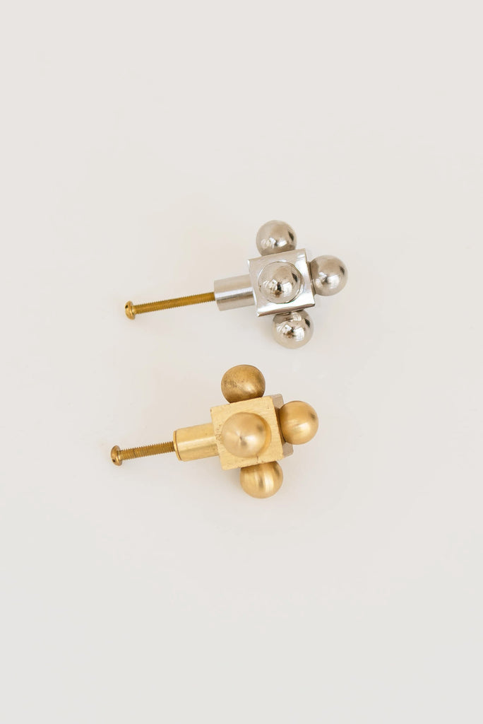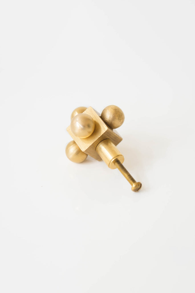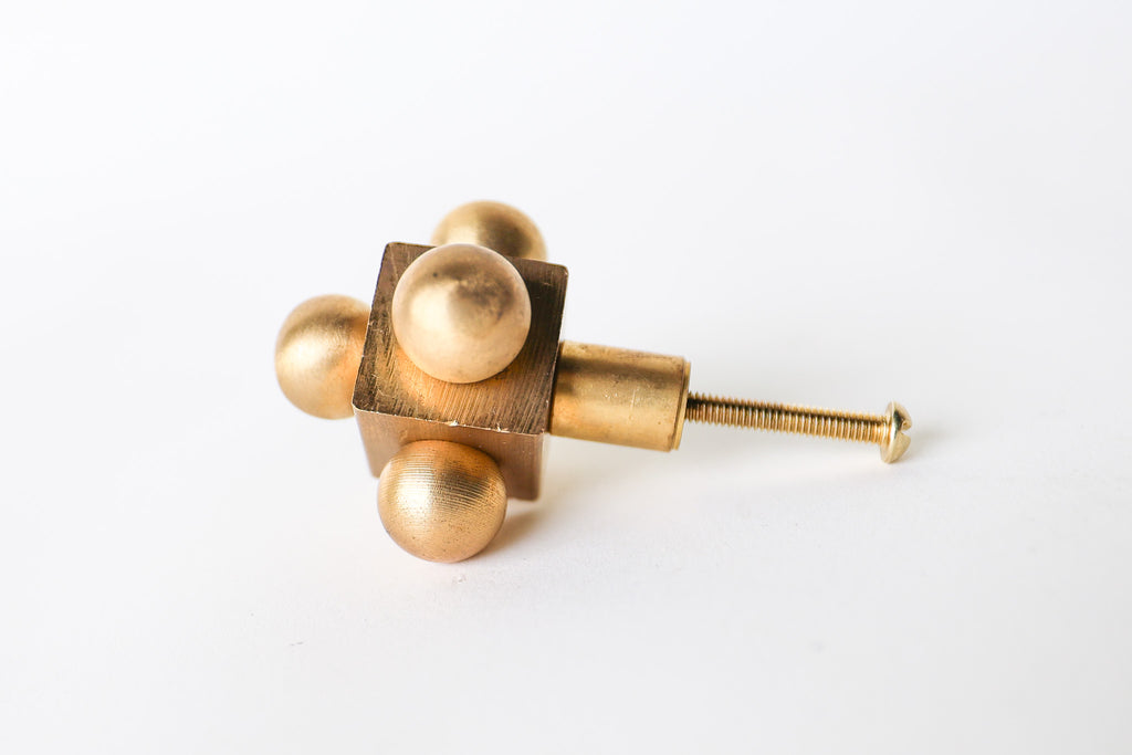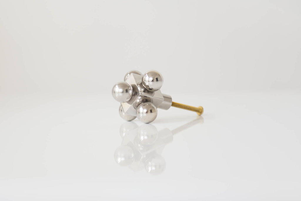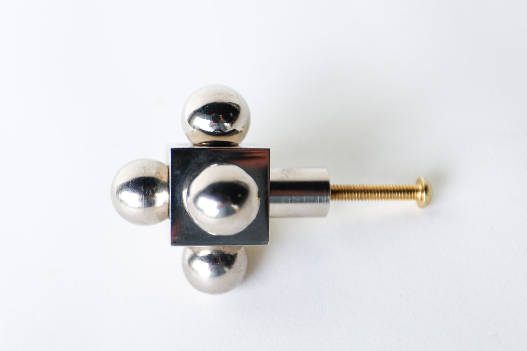 The Mini Ball Cube Knob features a cube-shaped armback with miniature balls. This knob can be made in brass or chrome or a combination of the two.
