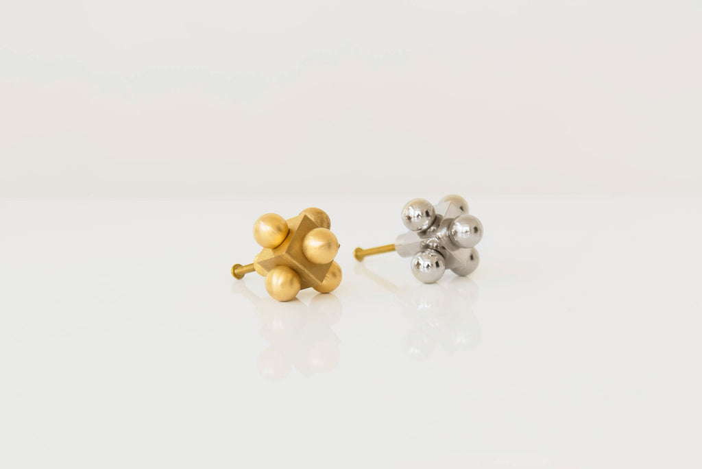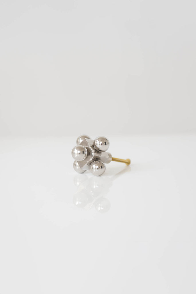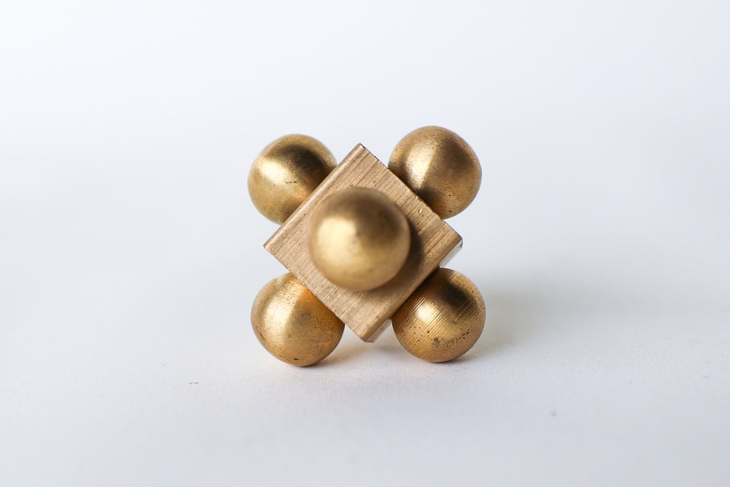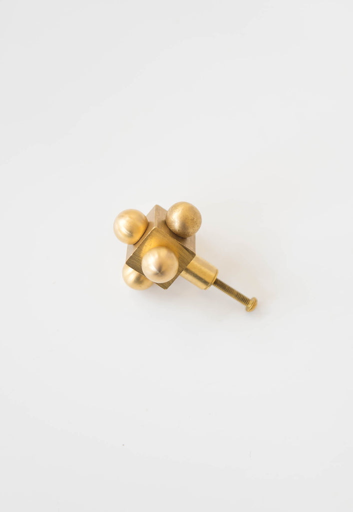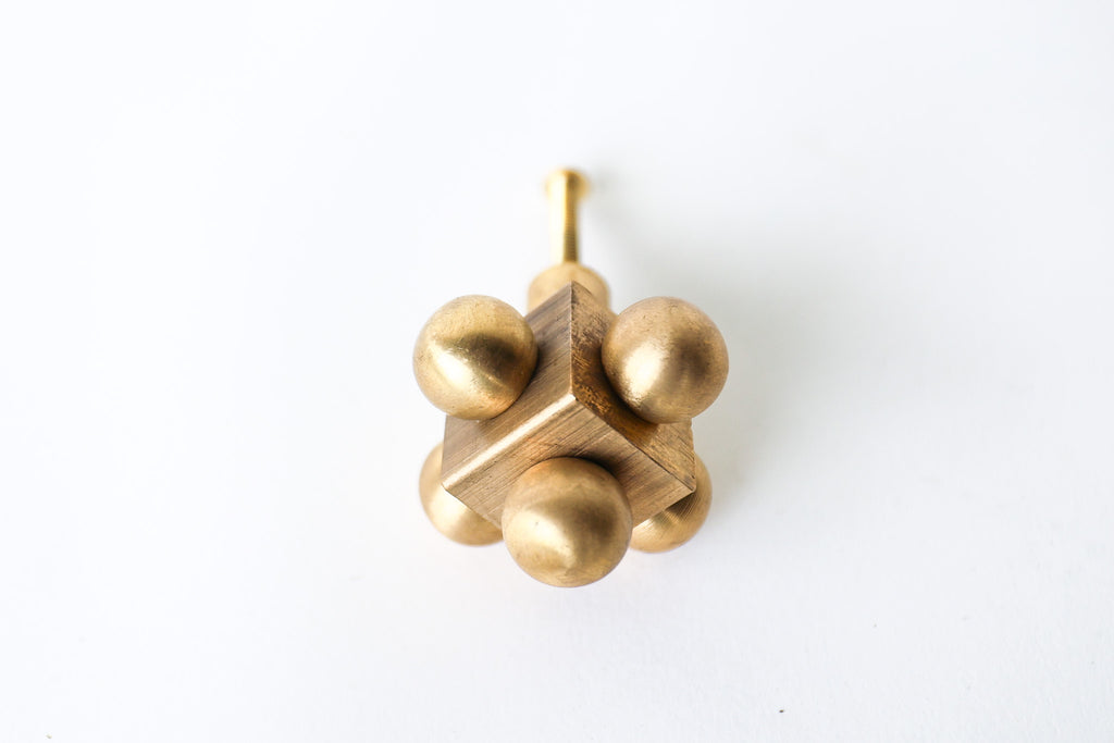 The Mini Ball Cube Knob features a cube-shaped armback with miniature balls. This knob can be made in brass or chrome or a combination of the two.