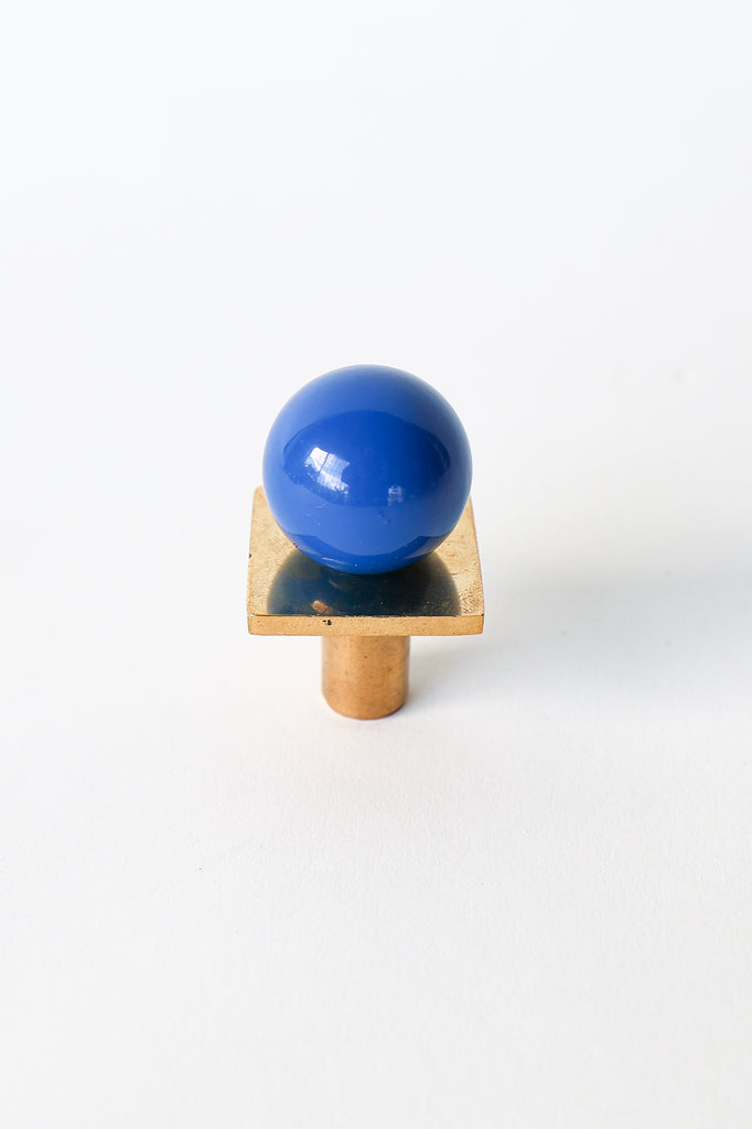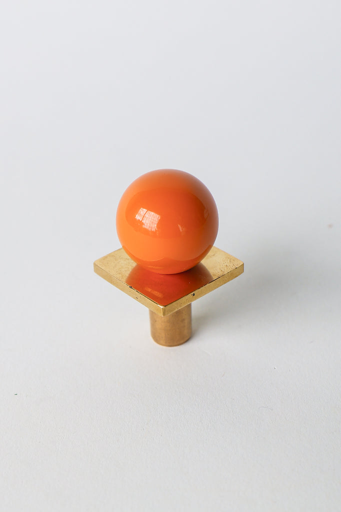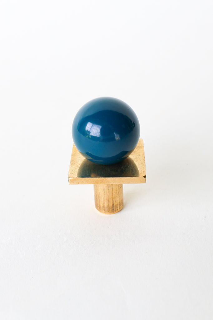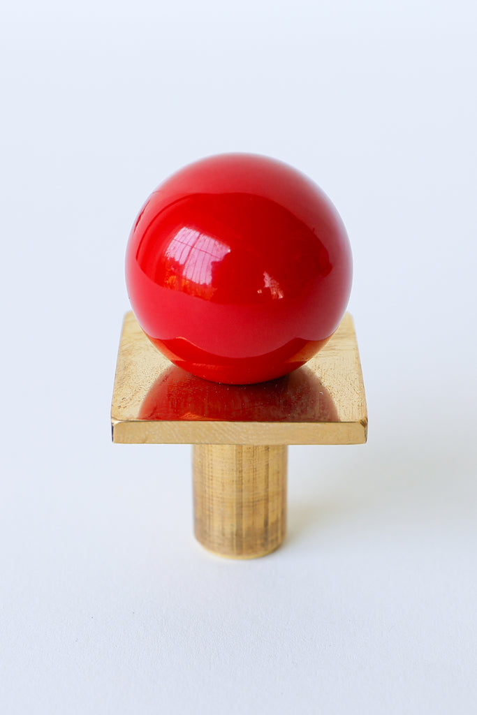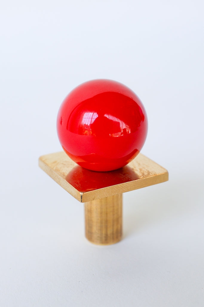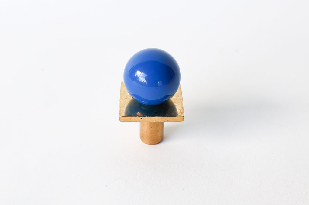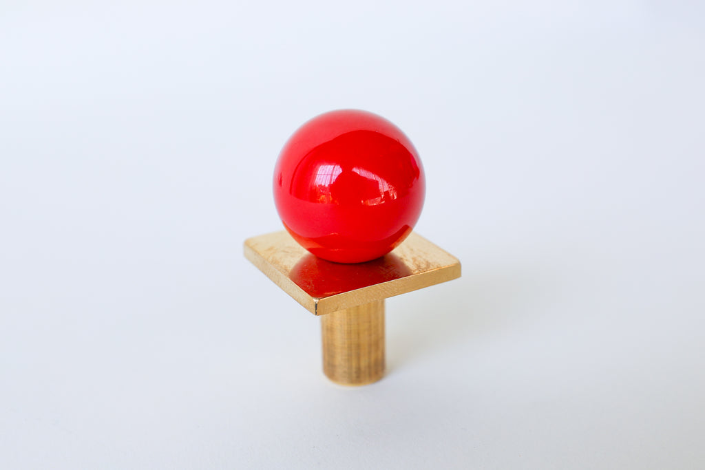 Add a bold pop of color and geometry to your space with our Square Gumball Knob. Featuring a powder-coated steel orb set atop a raw brass square plate and base, this sculptural drawer pull blends playful form with refined materials. It's part of our best-selling Gumball Collection and designed to coordinate seamlessly with all other knobs in the series.