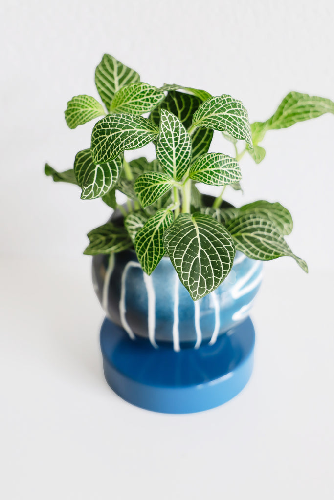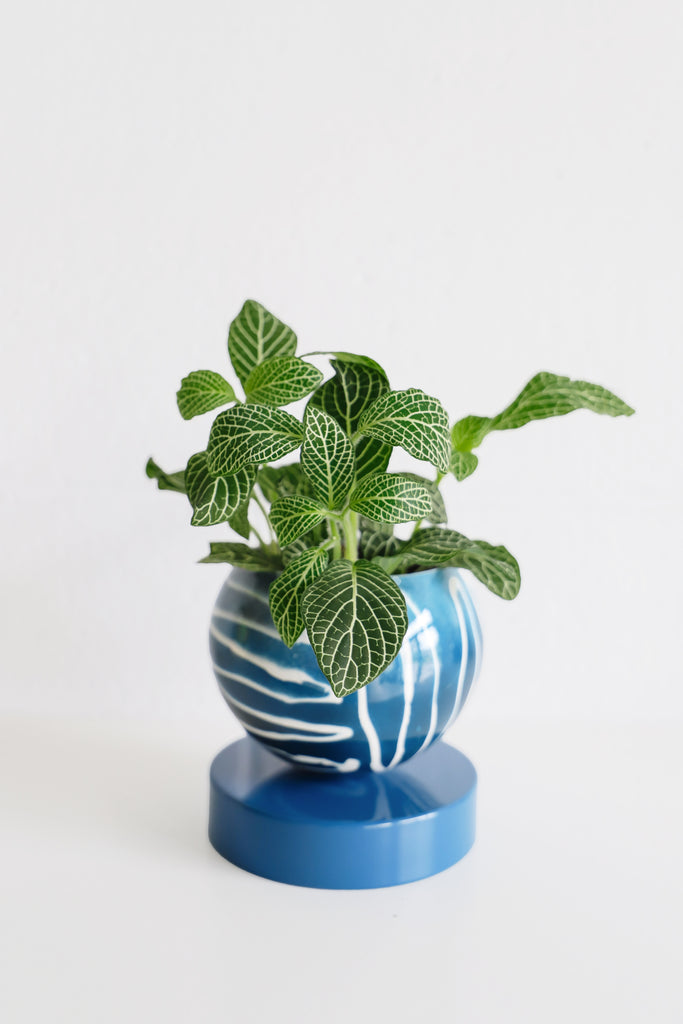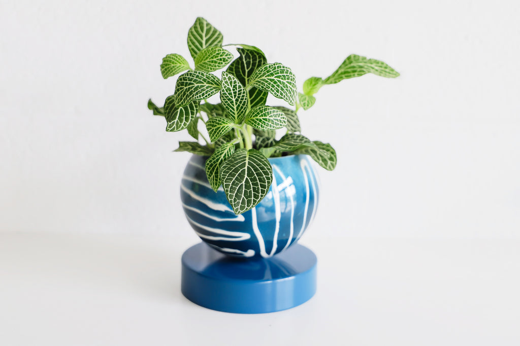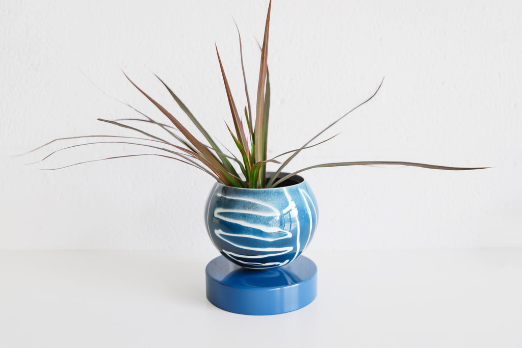 A modern, minimal planter with a handmade batik inspired finish in shades of dark blue and white white on a denim blue base. The handmade finish has been sealed in clear powdercoating. You can style it with a plant or use it as a vase. Due to the unique nature of painting, no two planters are alike.