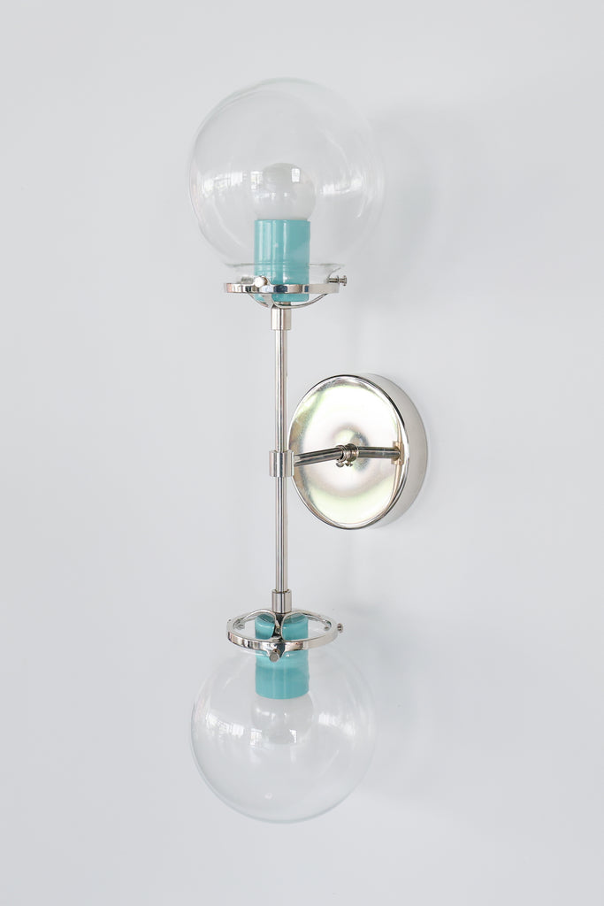By covering the sockets with a powder-coated pop of color, the Cadiz Double Light Sconce embraces modern style but keeps the design fun with its unexpected pop of color. The fixture consists of two E26/medium based socket that is compatible with incandescent, CFL, LED, or edison style bulbs. There are 2 metal finish options available (1) raw brass and (2) chrome. There are also three color pop options: (1) wintergreen mint, (2) chartreuse yellow, and (3) tangerine. Downrod length can be adjusted (either lengthened or shortened) to fit your space. Contact Sazerac Stitches for details.