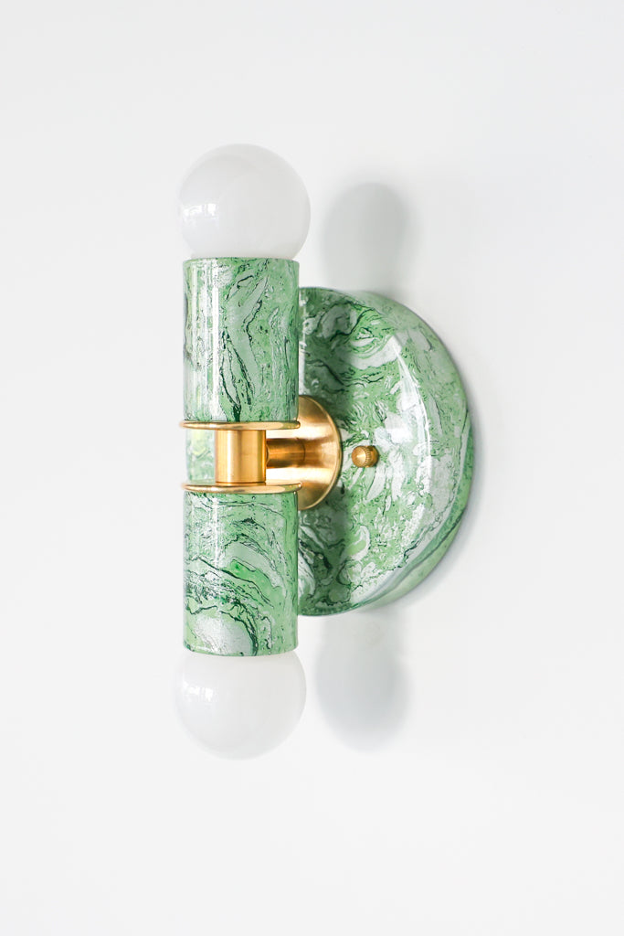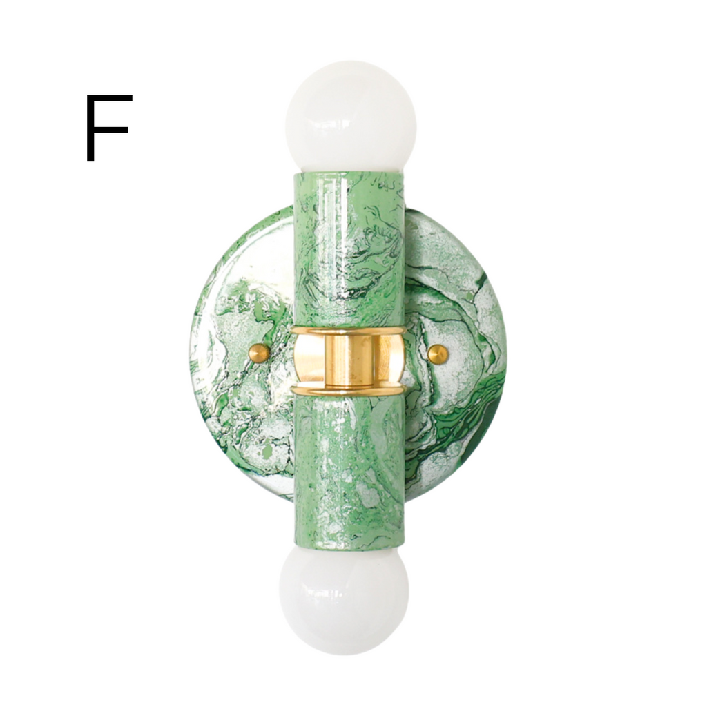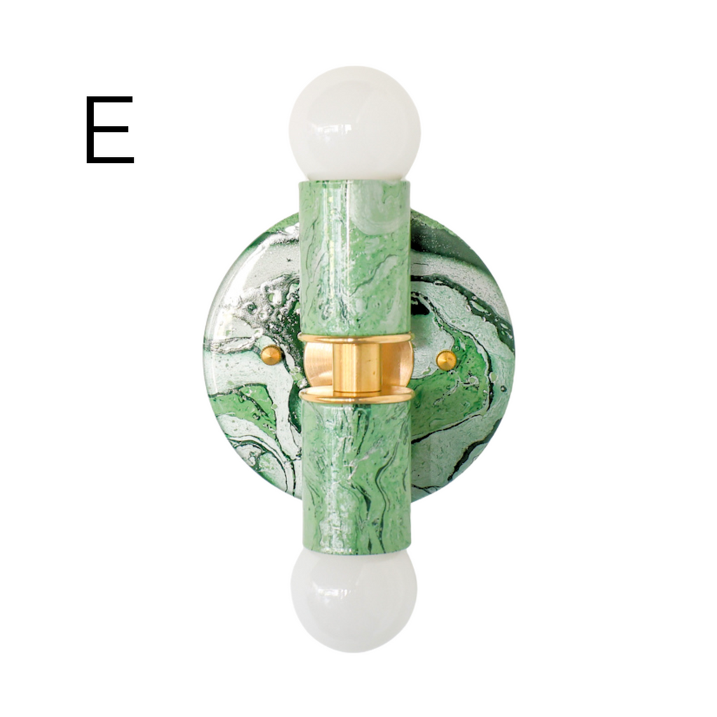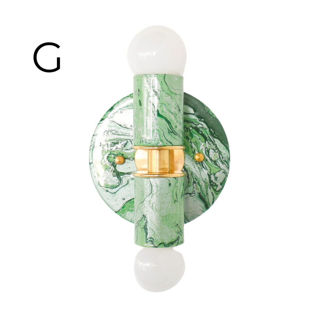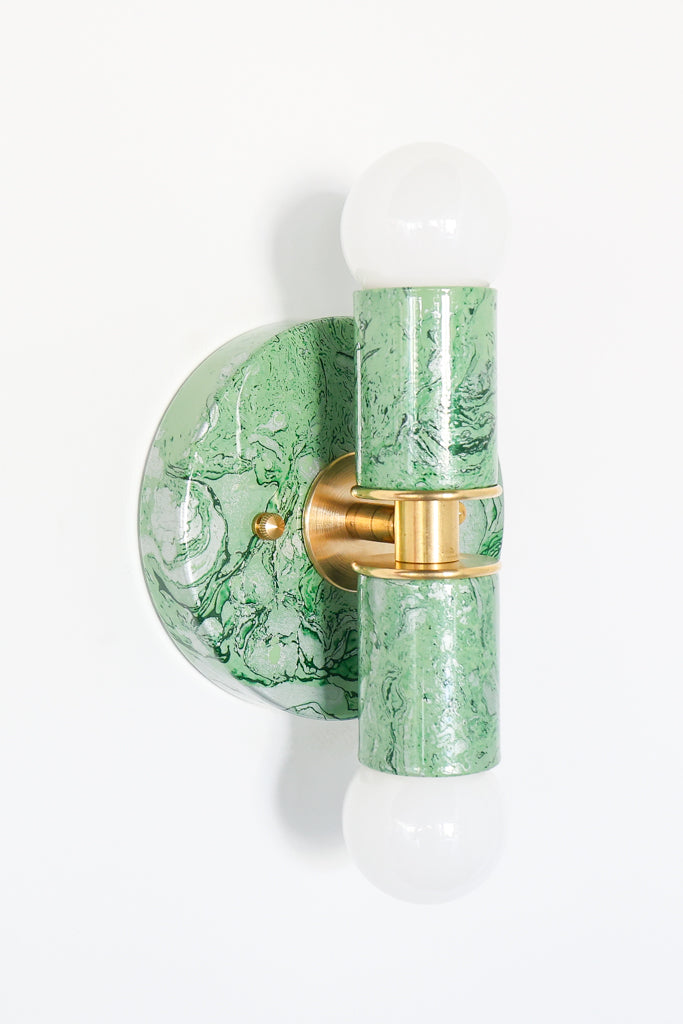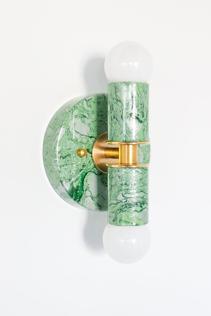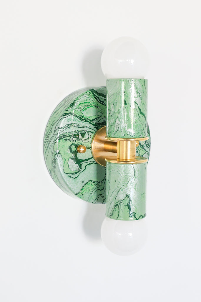 Color is the star of the show in the Thalia Sconce. Named after a Greek Muse, the Thalia sconce is saturated in color with metal accents. The two-light sconce or flush mount ceiling light is compact and can be used in small spaces that need high impact design. The fixture can be installed on a wall or ceiling in both horizontal or vertical position. Hardwire installation; however, a plug in option can be added here.