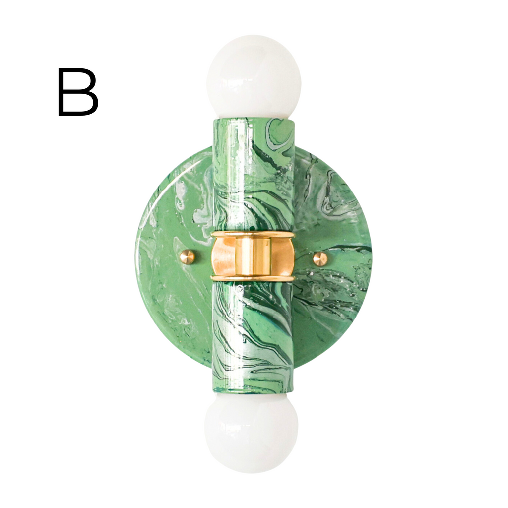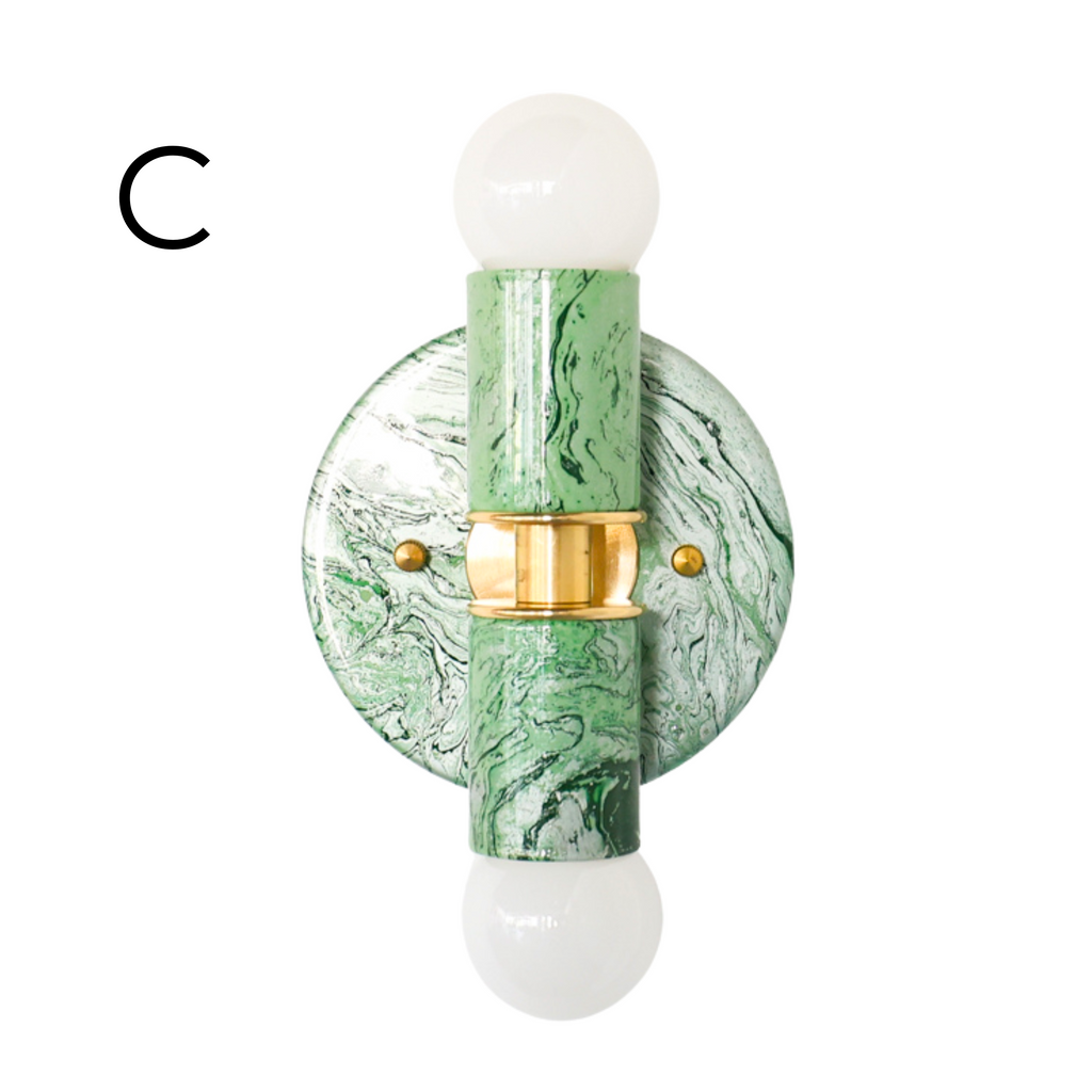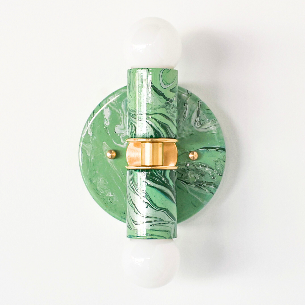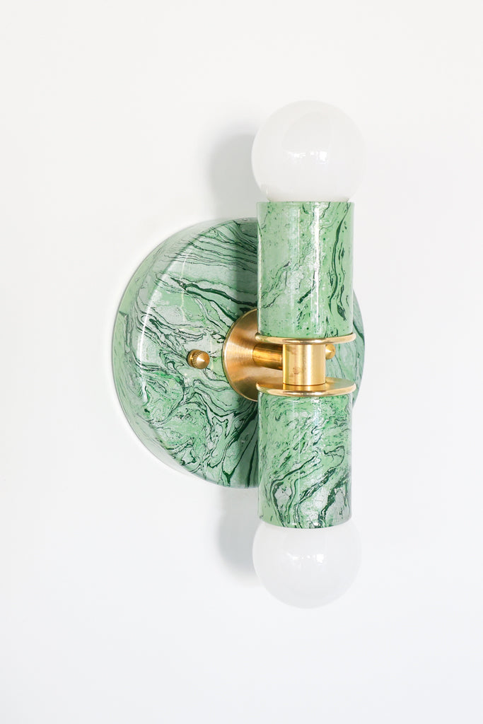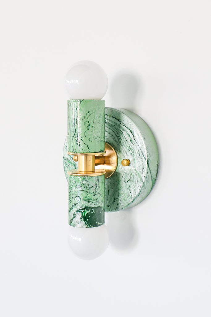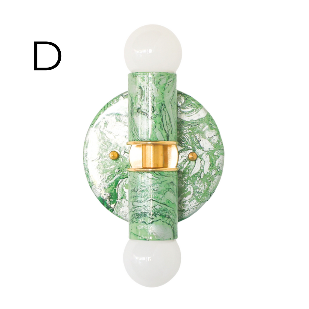 Color is the star of the show in the Thalia Sconce. Named after a Greek Muse, the Thalia sconce is saturated in color with metal accents. The two-light sconce or flush mount ceiling light is compact and can be used in small spaces that need high impact design. The fixture can be installed on a wall or ceiling in both horizontal or vertical position. Hardwire installation; however, a plug in option can be added here.