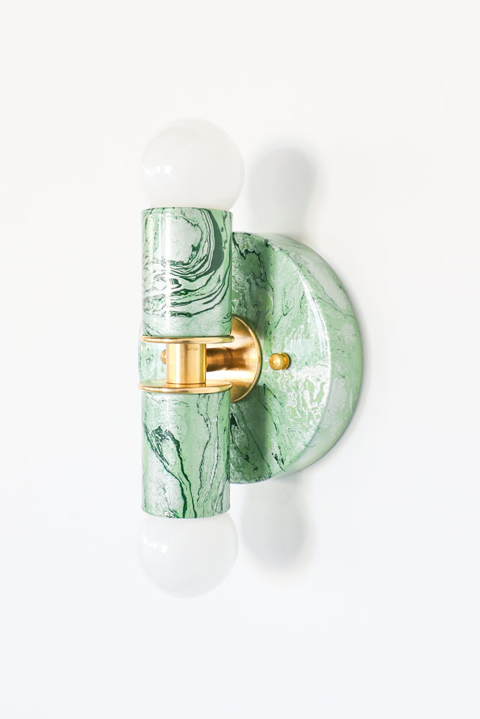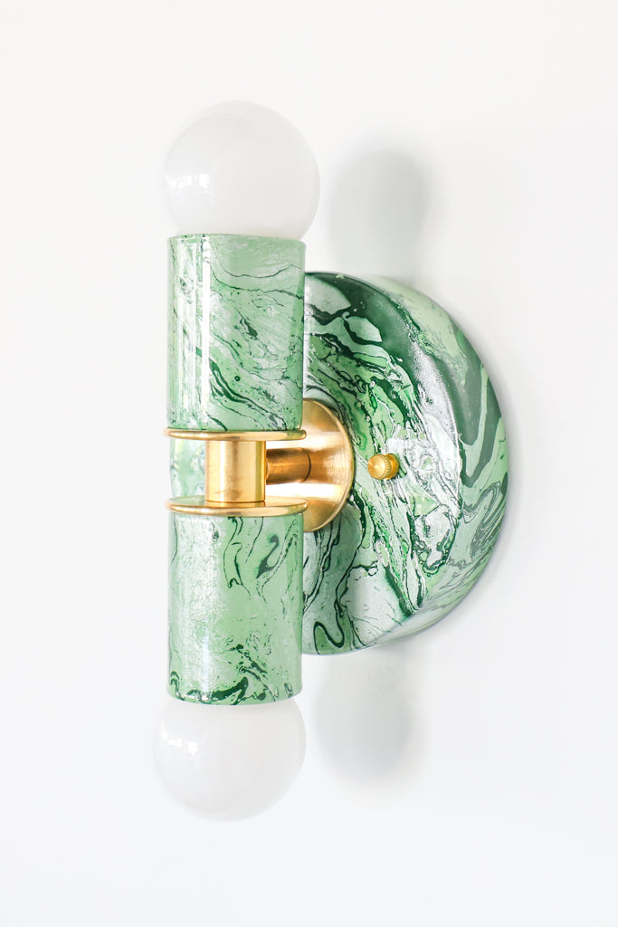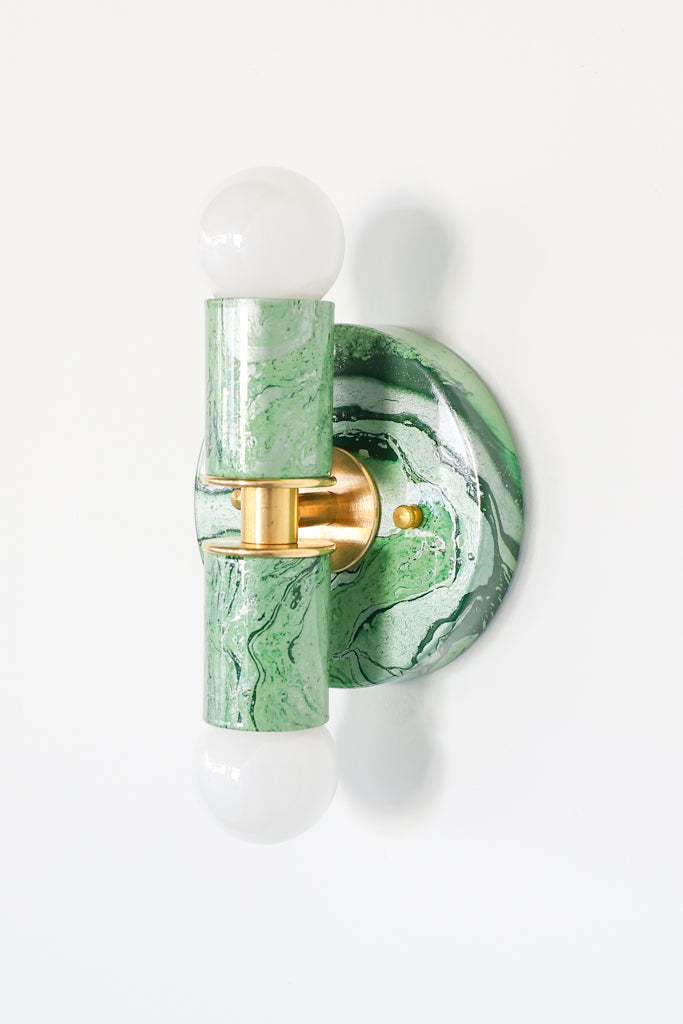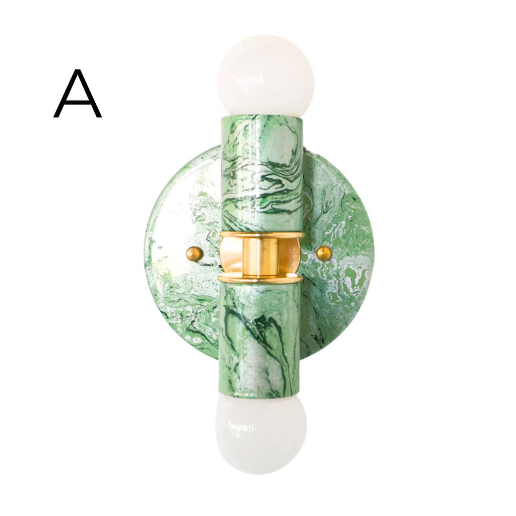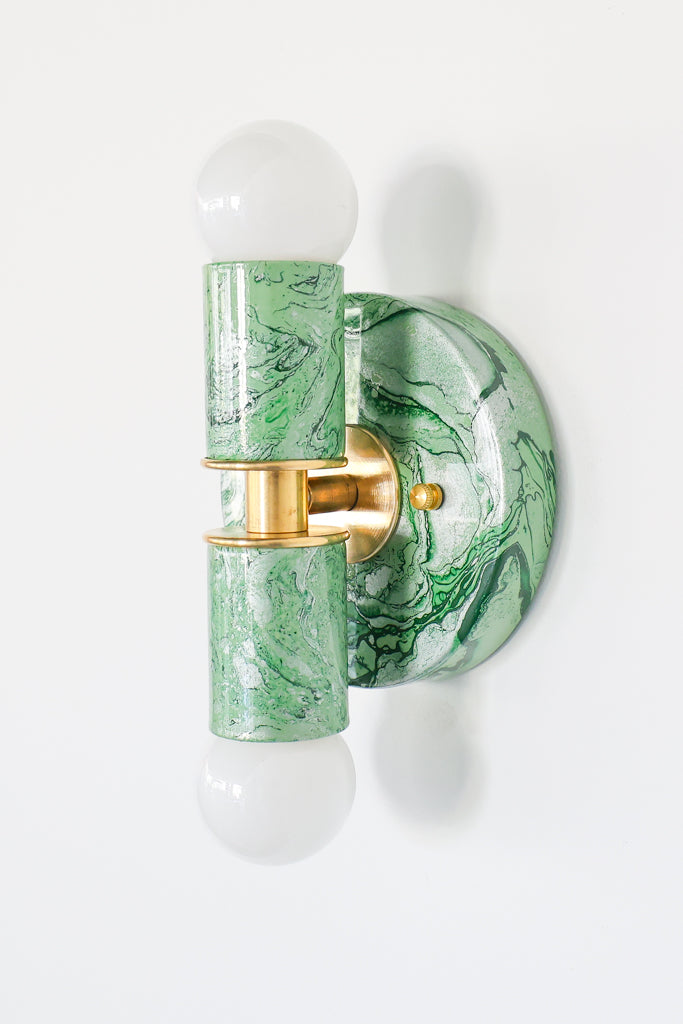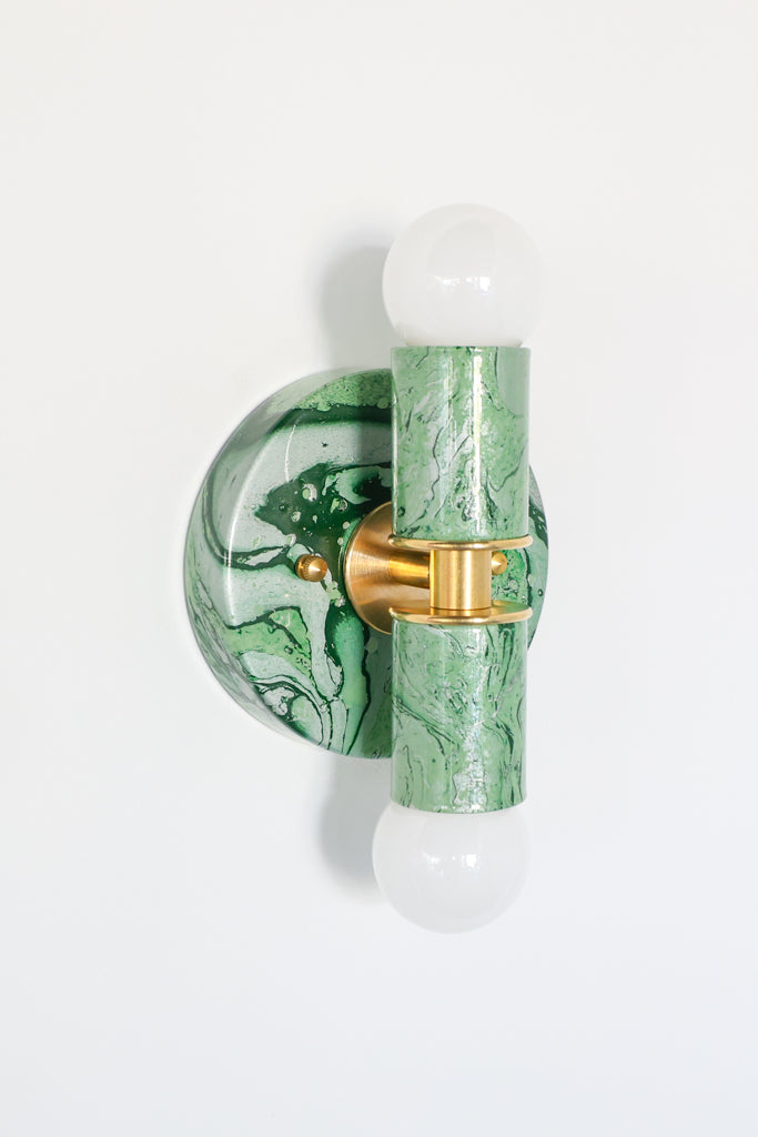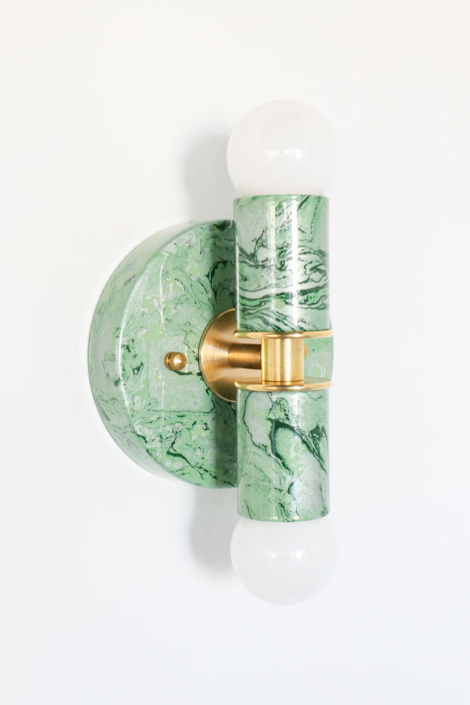 Color is the star of the show in the Thalia Sconce. Named after a Greek Muse, the Thalia sconce is saturated in color with metal accents. The two-light sconce or flush mount ceiling light is compact and can be used in small spaces that need high impact design. The fixture can be installed on a wall or ceiling in both horizontal or vertical position. Hardwire installation; however, a plug in option can be added here.