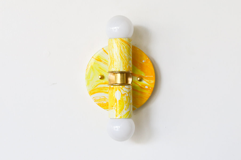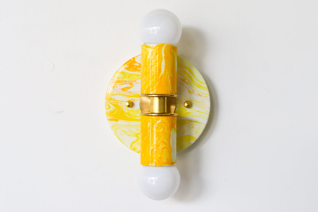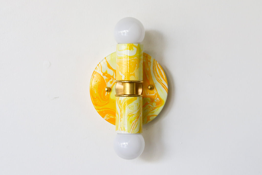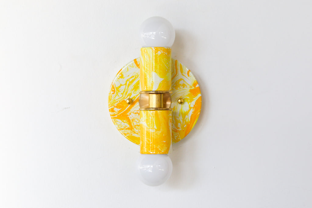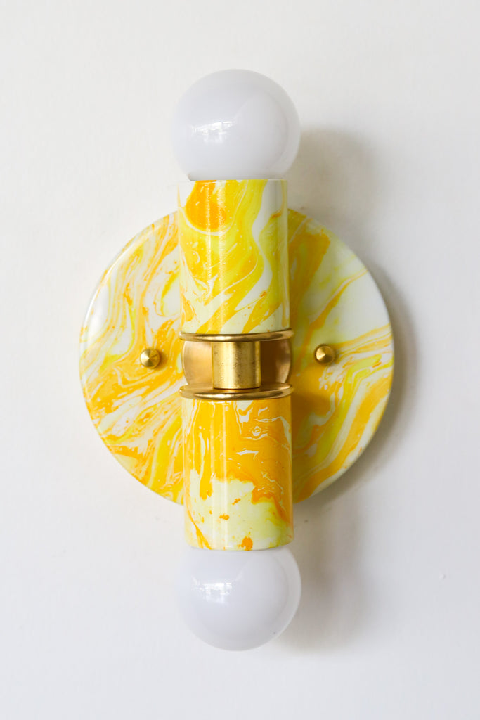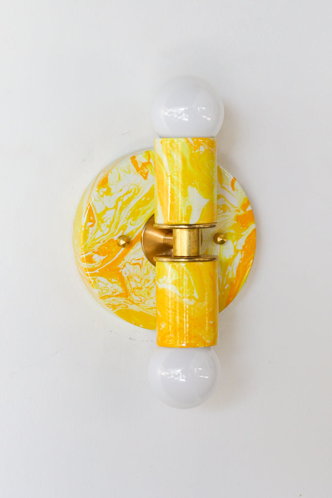 Color is the star of the show in the Thalia Sconce. Named after a Greek Muse, the Thalia sconce is saturated in color with metal accents. The two-light sconce or flush mount ceiling light is compact and can be used in small spaces that need high impact design. The fixture can be installed on a wall or ceiling in both horizontal or vertical position. Hardwire installation; however, a plug in option can be added here.