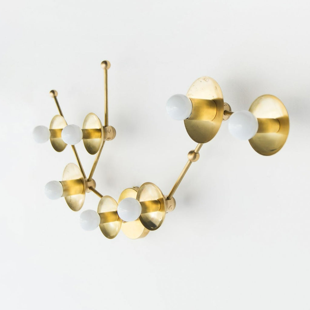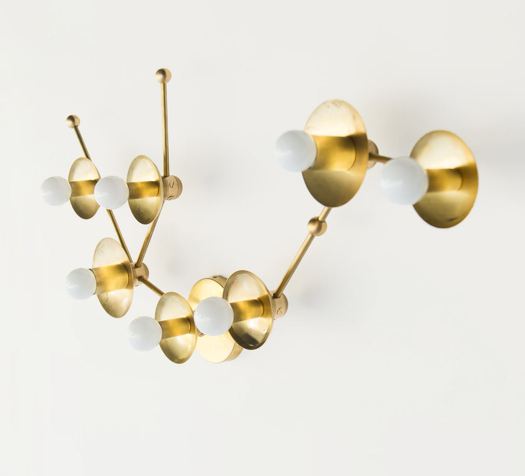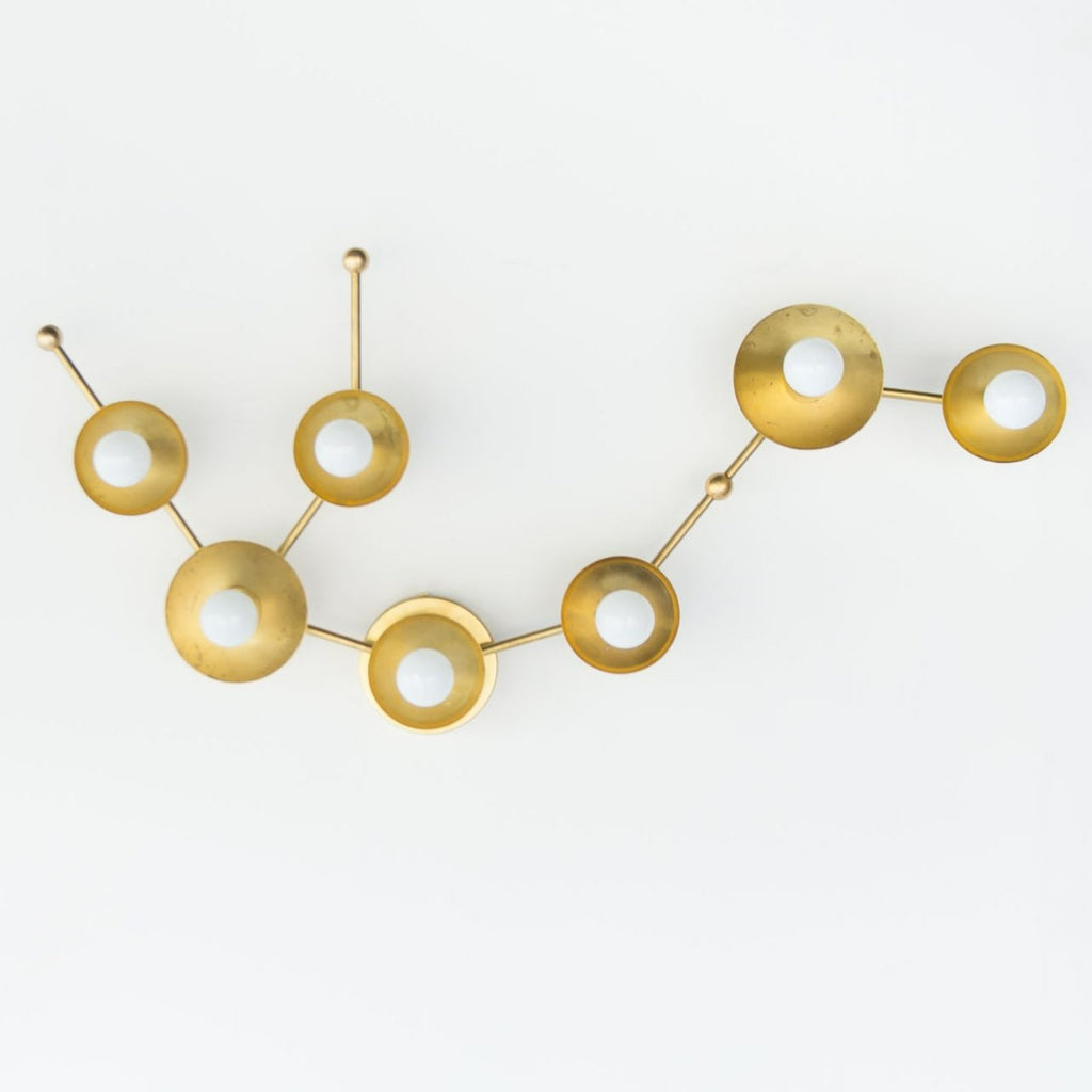 The Aquarius flushmount or sconce is designed to look like the Aquarius astrological constellation. It uses a combination of socket and disc sizes to look like small and large stars. The fixture is made of raw brass, chrome, or powdercoated steel components.