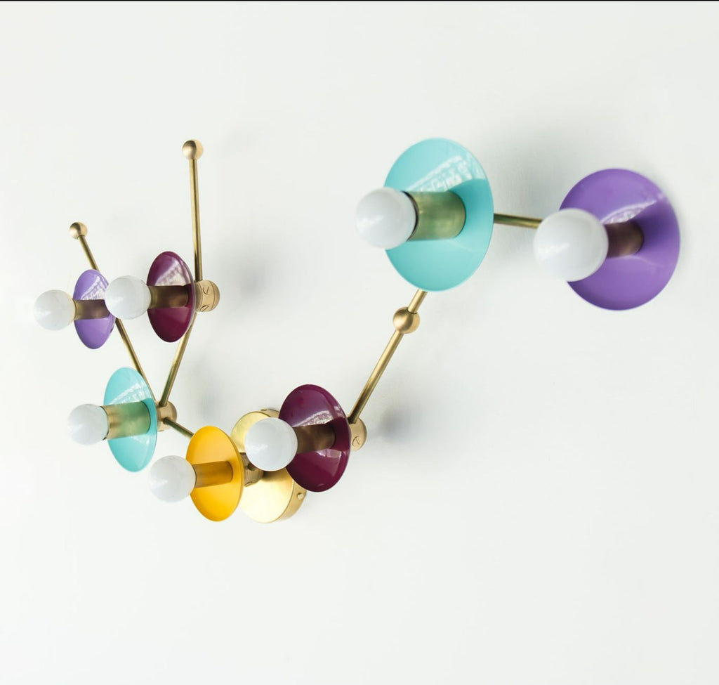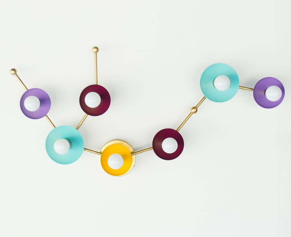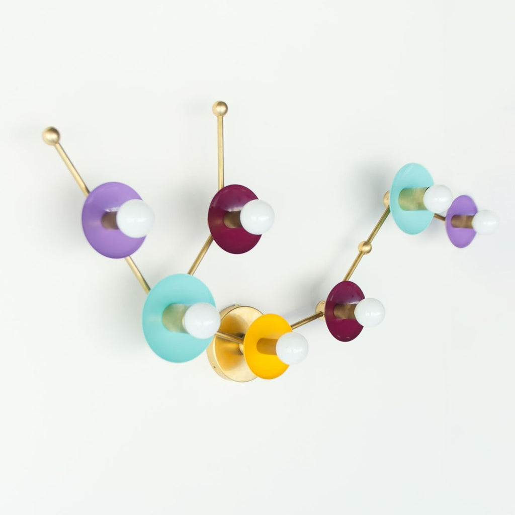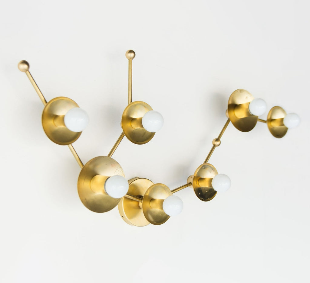The Aquarius flushmount or sconce is designed to look like the Aquarius astrological constellation. It uses a combination of socket and disc sizes to look like small and large stars. The fixture is made of raw brass, chrome, or powdercoated steel components.