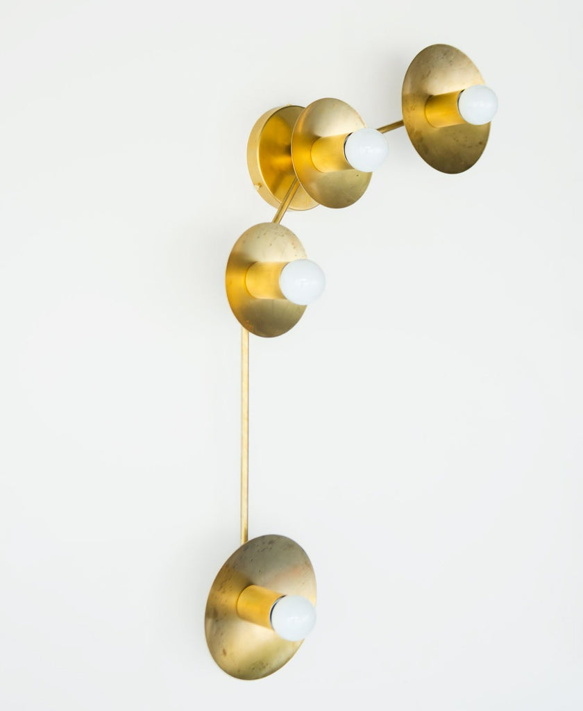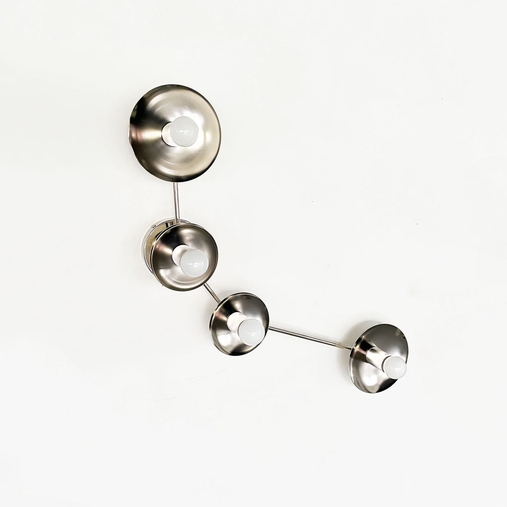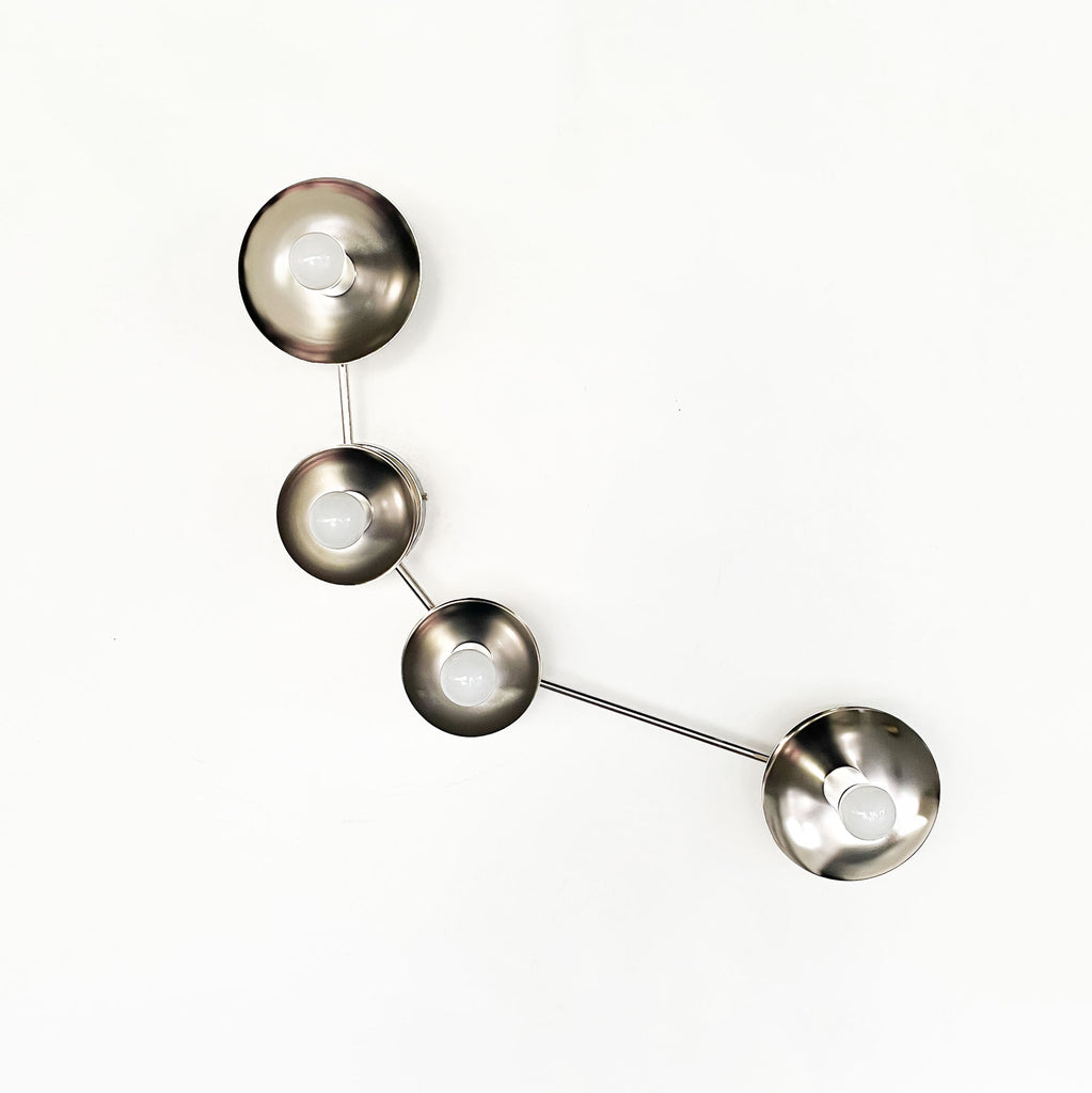 The Aries flushmount or sconce is designed to look like the Aries astrological constellation. It uses a combination of socket and disc sizes, as well as arms with brass balls to look like small and large stars. The fixture is made of raw brass components.