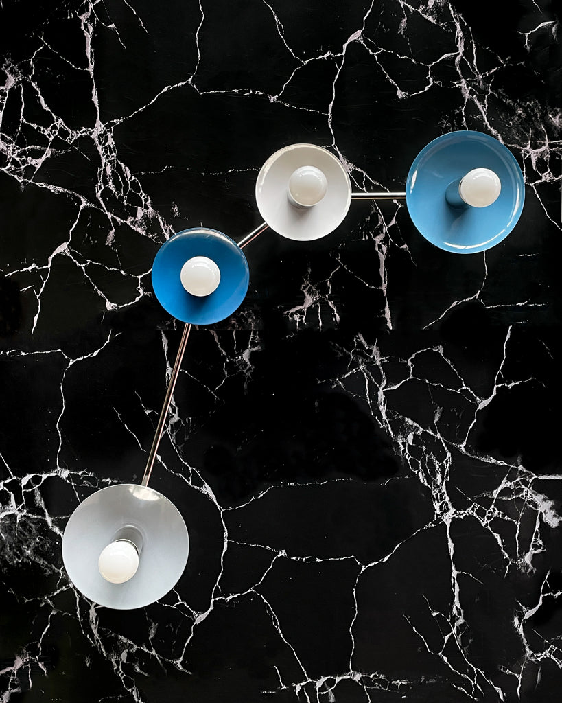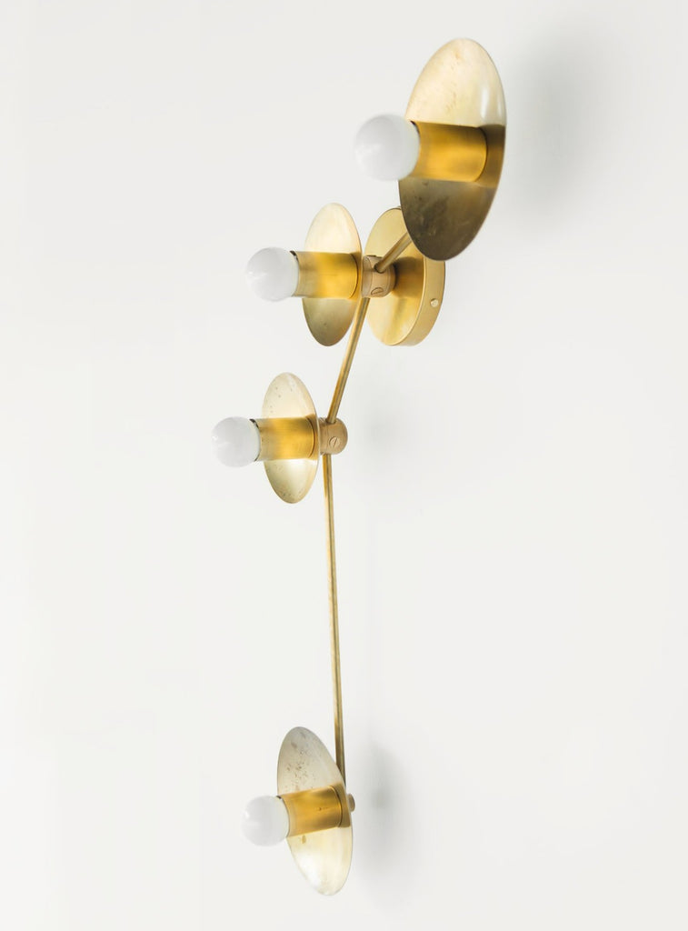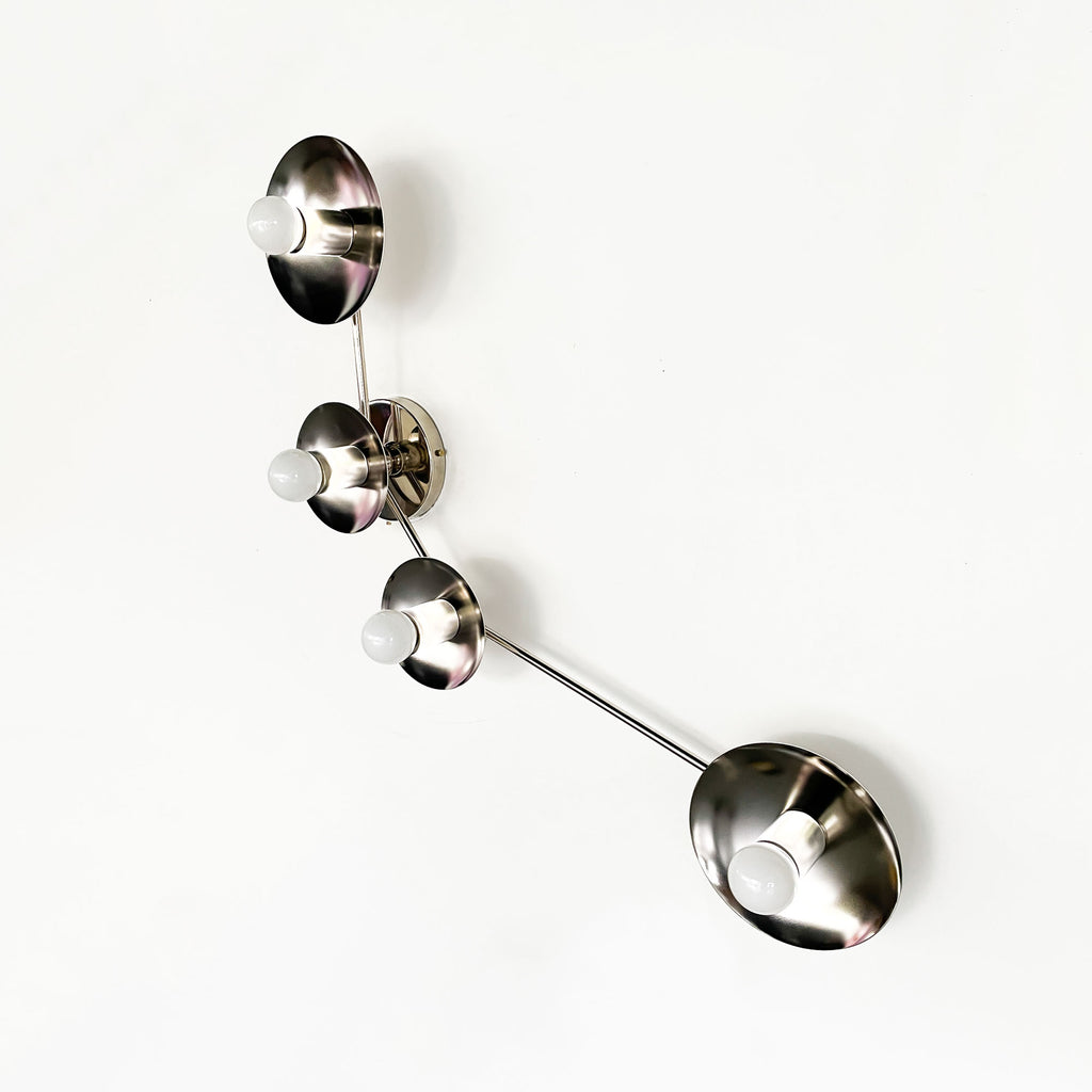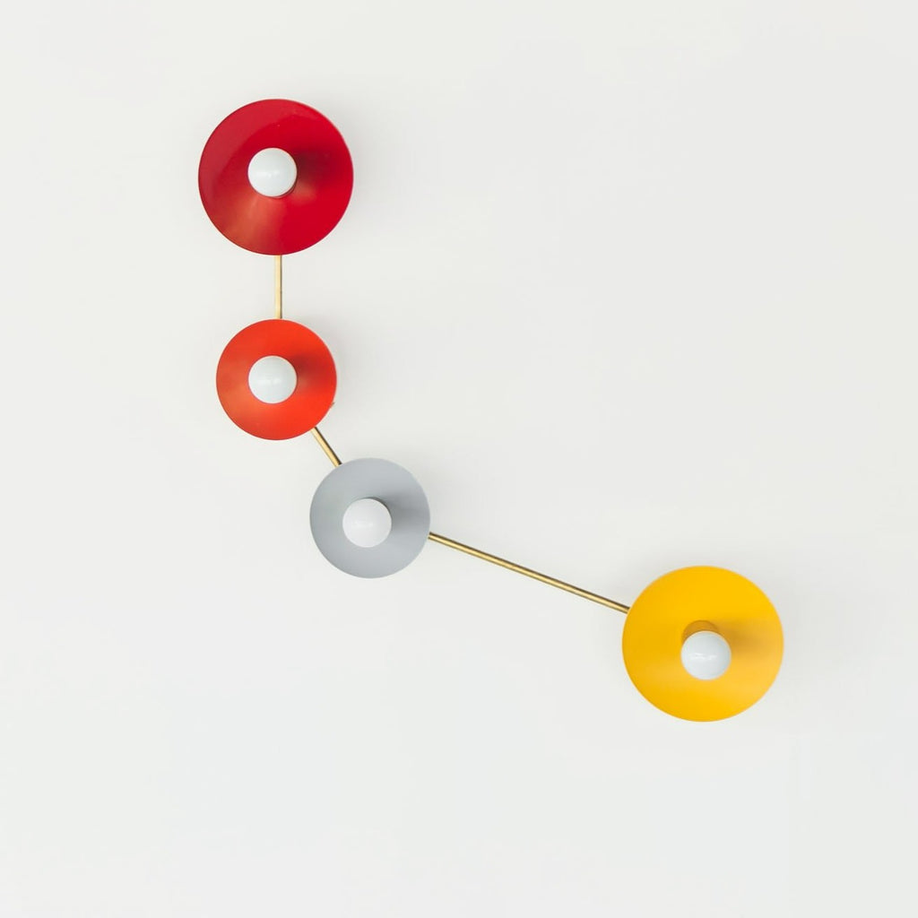 The Aries flushmount or sconce is designed to look like the Aries astrological constellation. It uses a combination of socket and disc sizes, as well as arms with brass balls to look like small and large stars. The fixture is made of raw brass components.