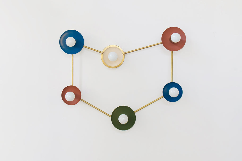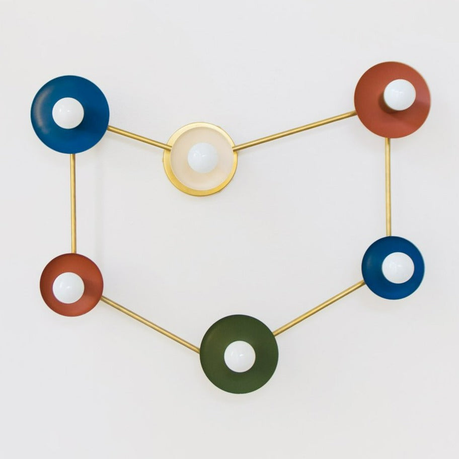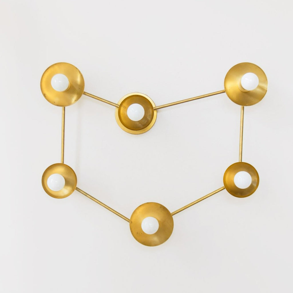The Capricorn flushmount or sconce is designed to look like the Capricorn astrological constellation. It uses a combination of socket and disc sizes to look like small and large stars. The fixture is made of raw brass, chrome, or powdercoated steel components.