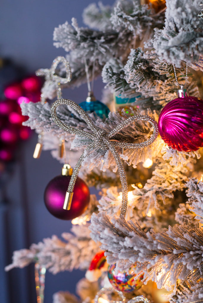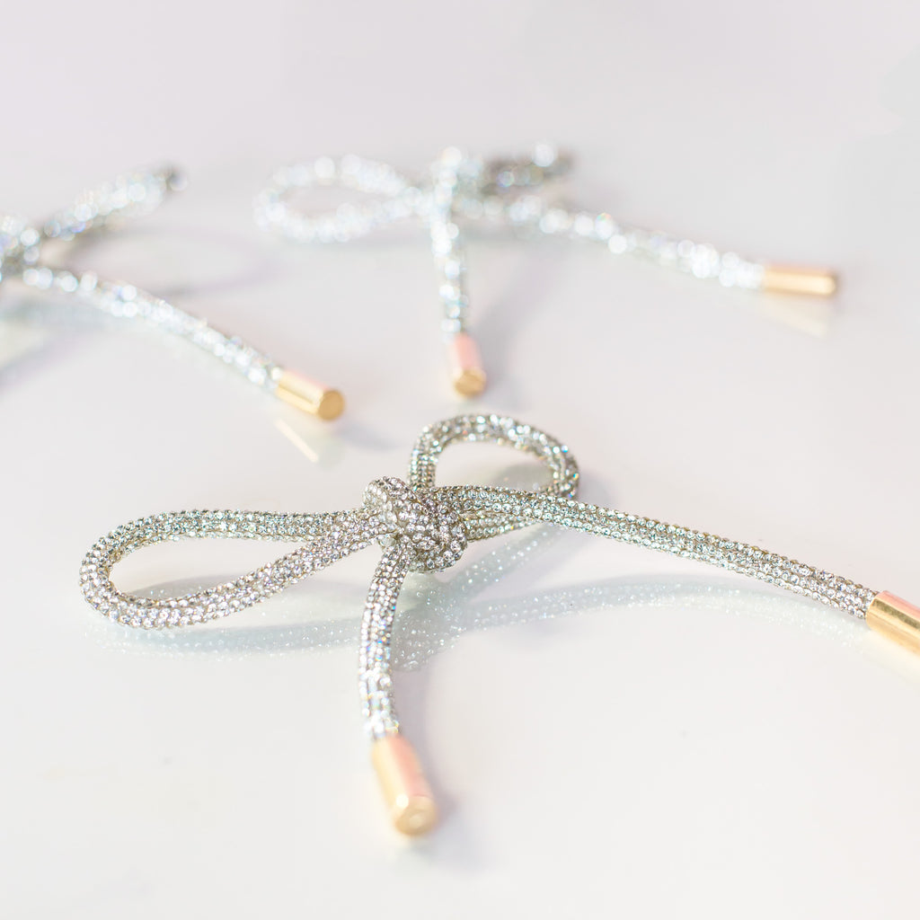 These pretty rhinestone bows are the perfect addition to any tree or package. Each end is capped with a gold-tone metal cap and there is a wire in the back for attachment.