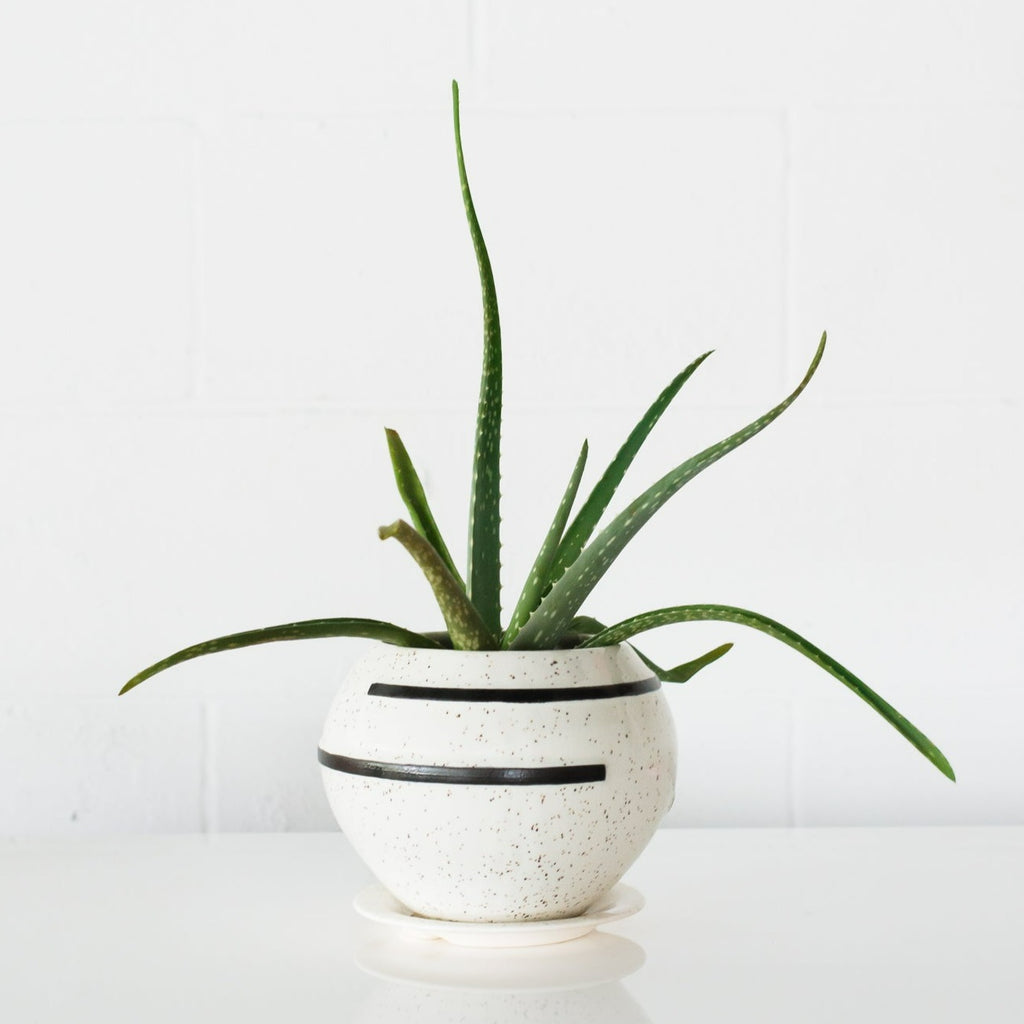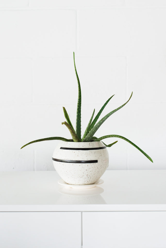 Inspired by the silt texture of the Mississippi in Southern Louisiana, the Delta Sconce combines an earthy glaze with contrasting geometric black lines that partially wrap the shade. Compliments many design types including earthy bohemian, mid-century modern, organic modern, and California cool. This planter has a drainage hole. Speckling will vary piece to piece because of the nature of the ceramic glaze.