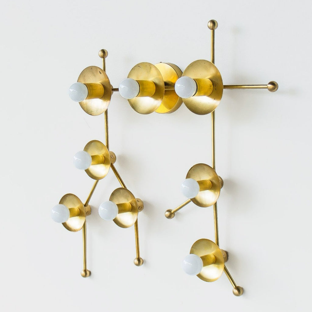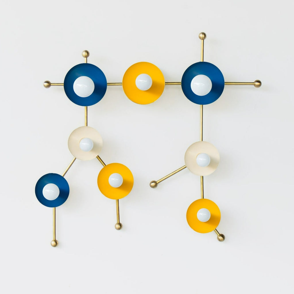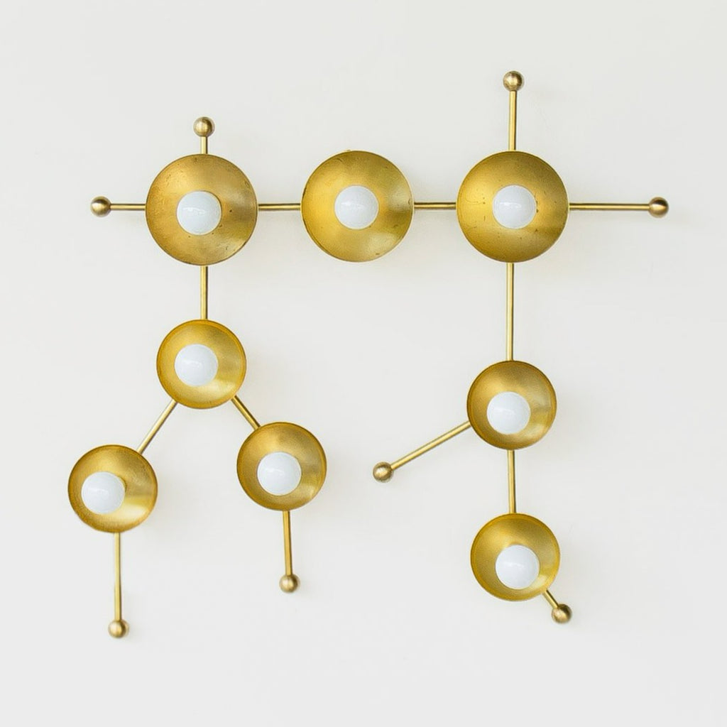 The Gemini One flushmount or sconce is designed to look like part of the Gemini astrological constellation. It uses a combination of socket and disc sizes to look like small and large stars. The fixture is made of raw brass, chrome, or powdercoated steel components.