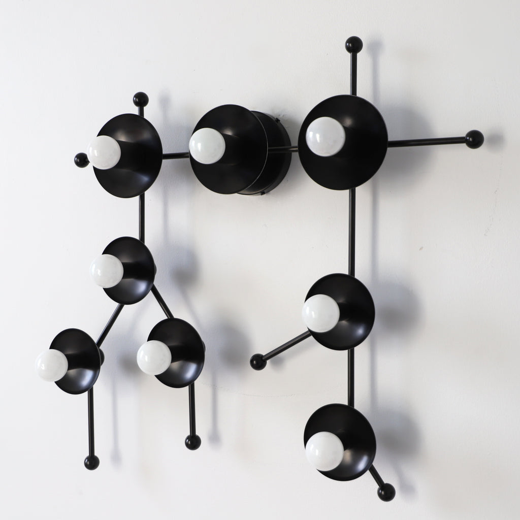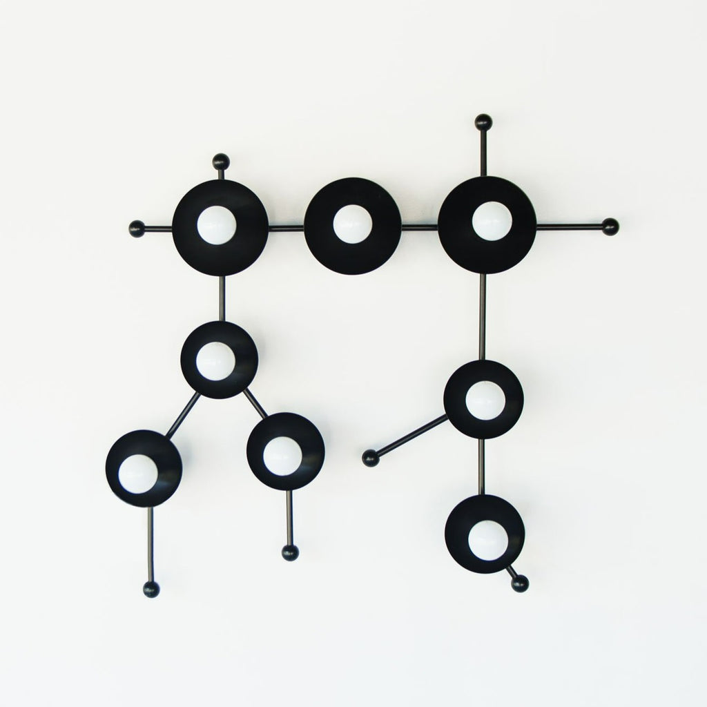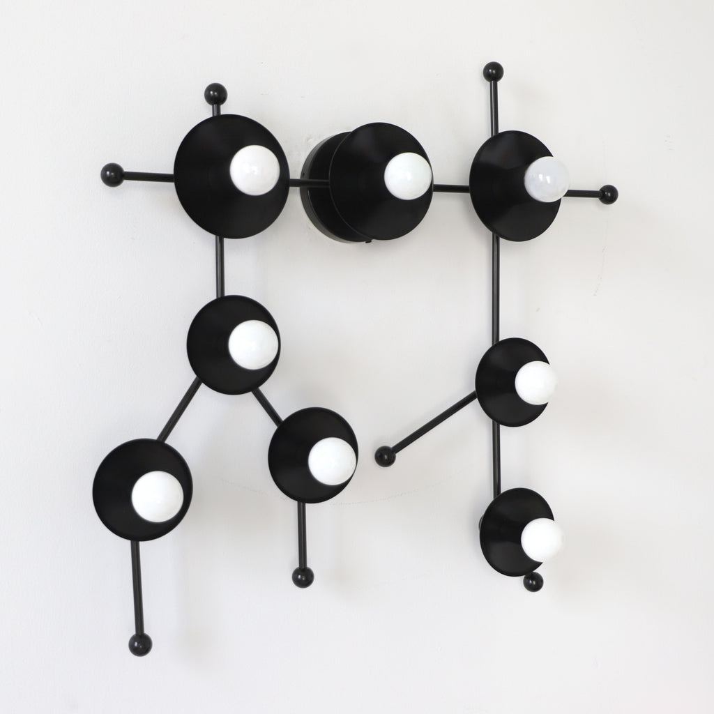 The Gemini One flushmount or sconce is designed to look like part of the Gemini astrological constellation. It uses a combination of socket and disc sizes to look like small and large stars. The fixture is made of raw brass, chrome, or powdercoated steel components.