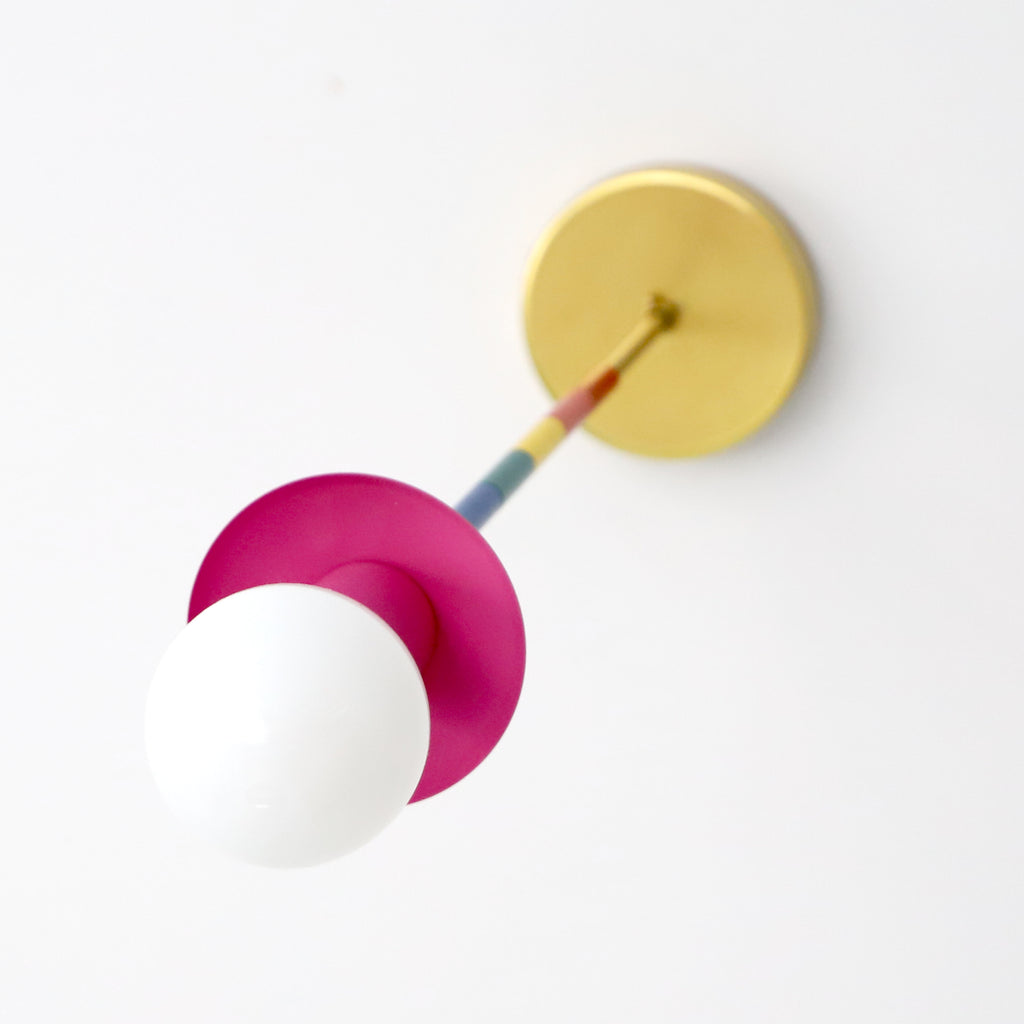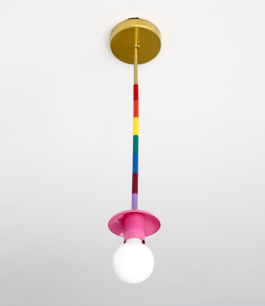 Anything goes with color in the Hendrix Pendant.  Color is laid out in a rainbow colorway.  Multiple downrod lengths are available for this fixture.  Four inches of brass downrod is the minimum length available.