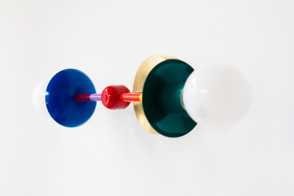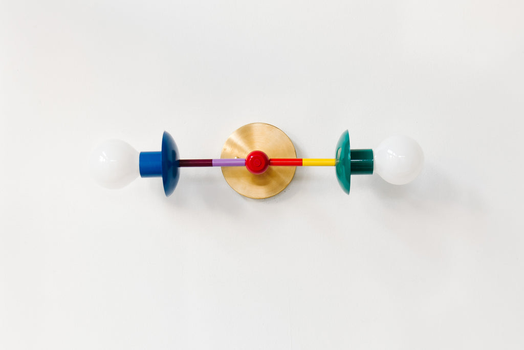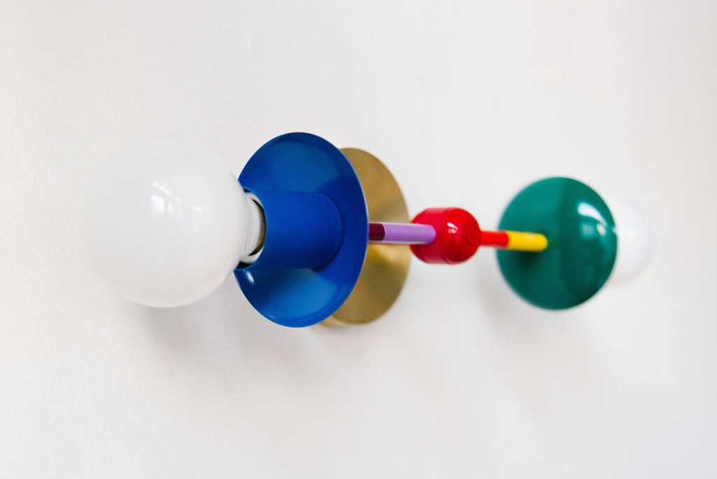 This sconce features the colors (from left to right): mediterranean blue, black cherry, orchid, red, flame, yellow, mermaid green.