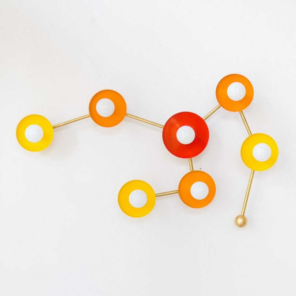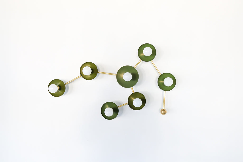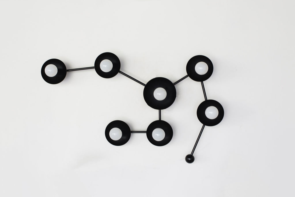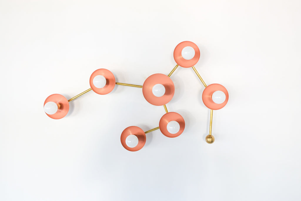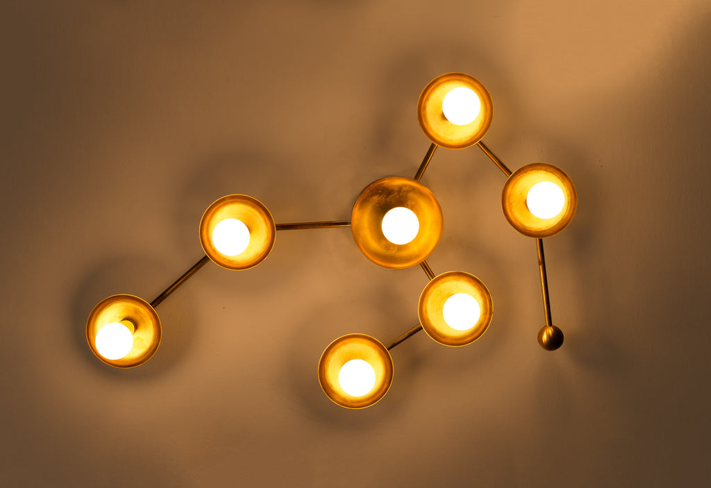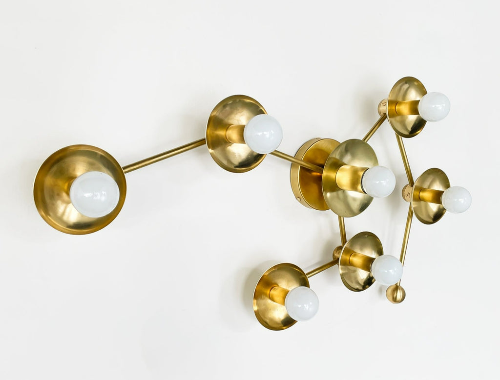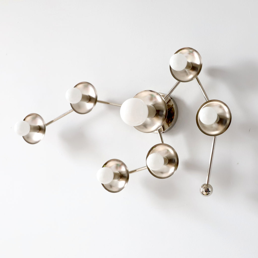 The Leo flushmount or sconce is designed to look like the Leo astrological constellation. It uses a combination of socket and disc sizes to look like small and large stars. The fixture is made of raw brass, chrome, or powdercoated steel components.