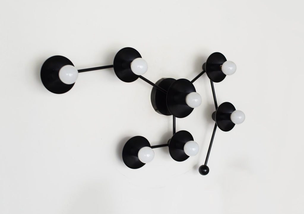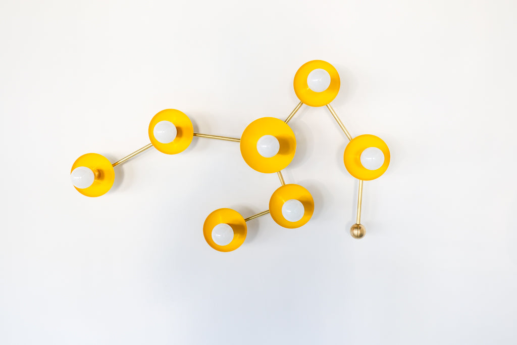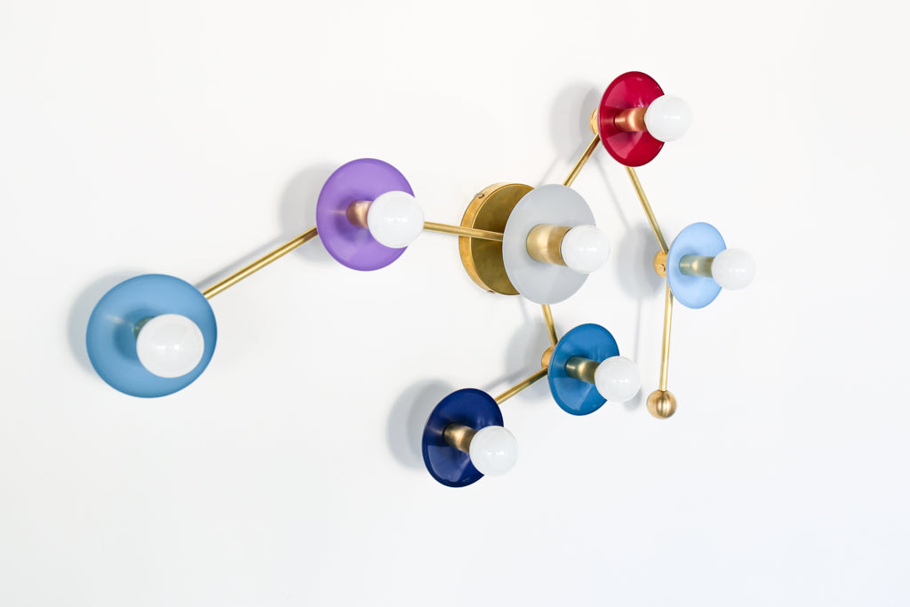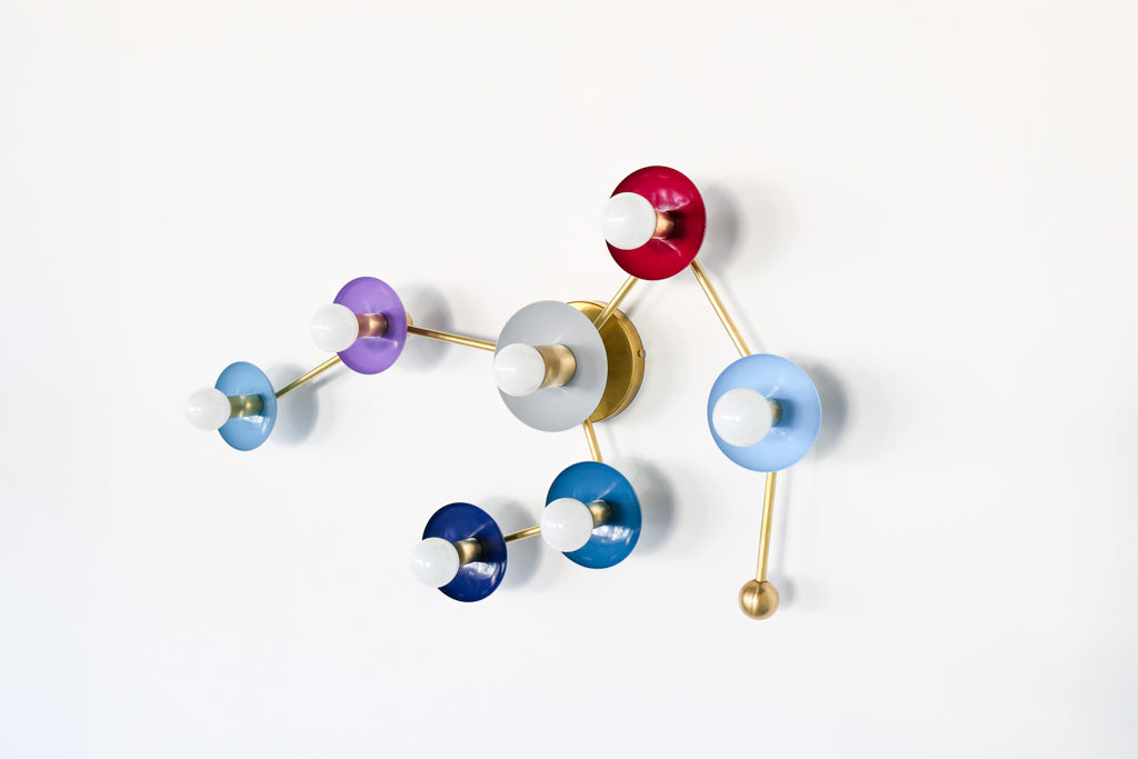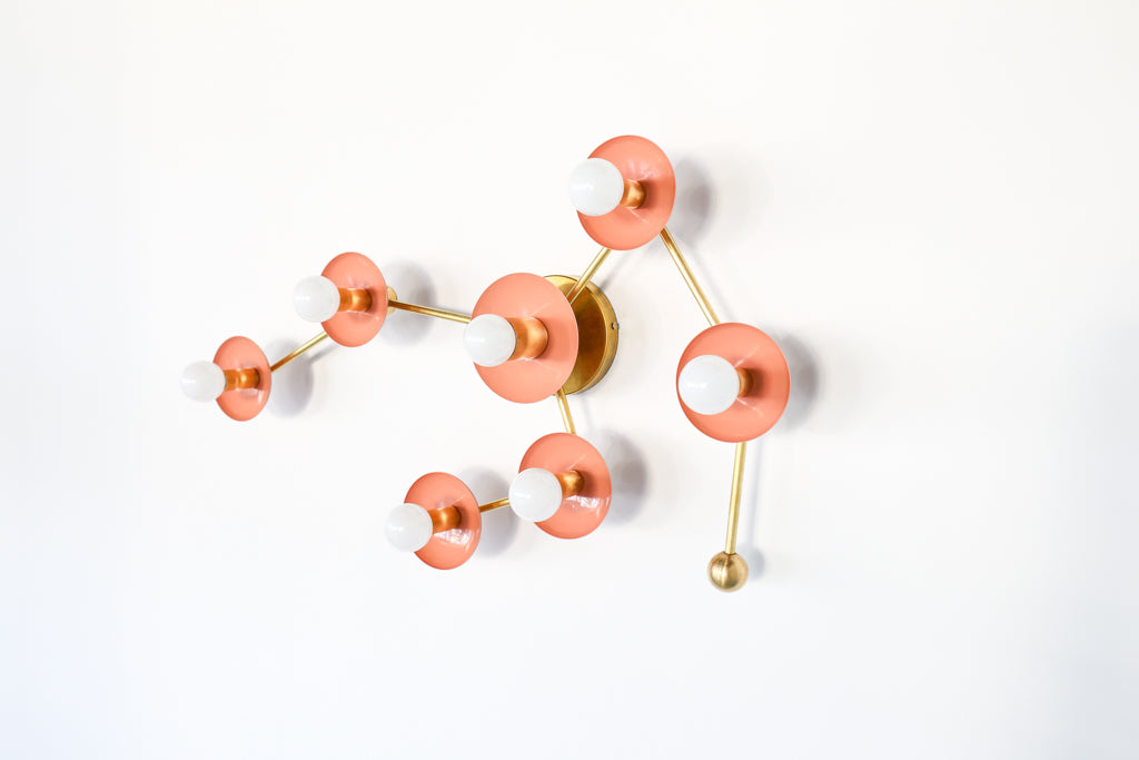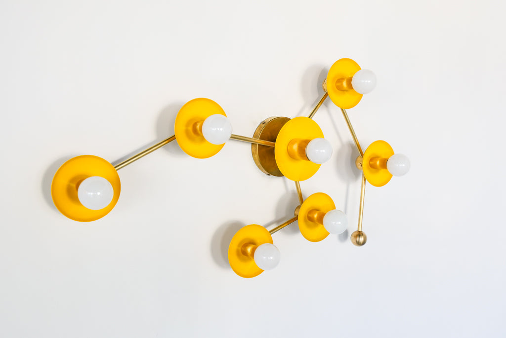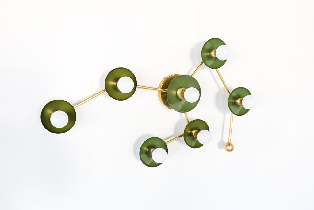 The Leo flushmount or sconce is designed to look like the Leo astrological constellation. It uses a combination of socket and disc sizes to look like small and large stars. The fixture is made of raw brass, chrome, or powdercoated steel components.