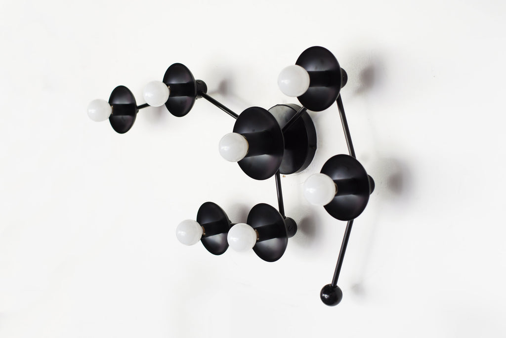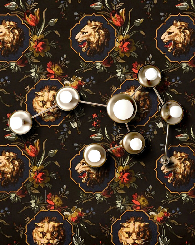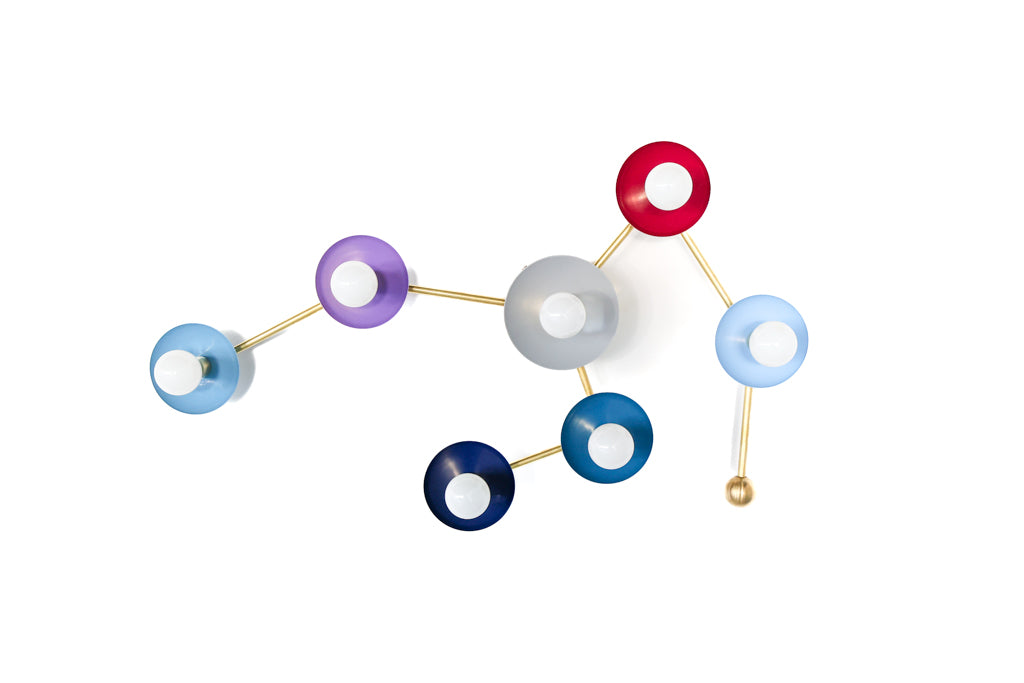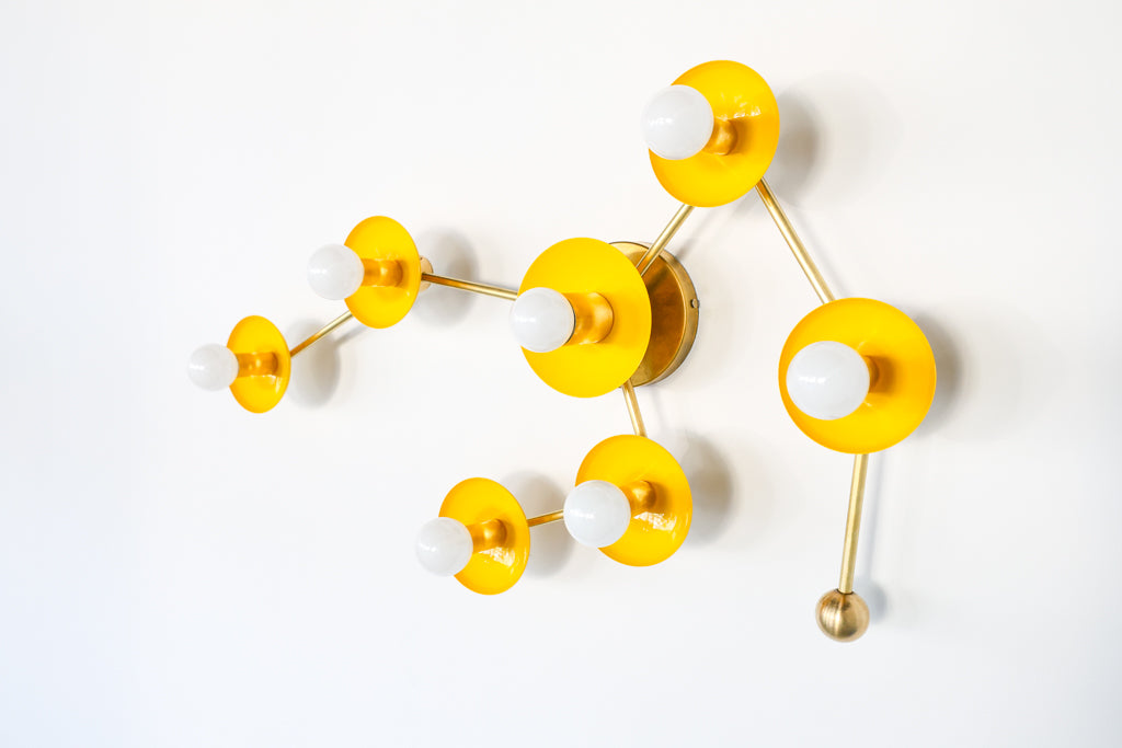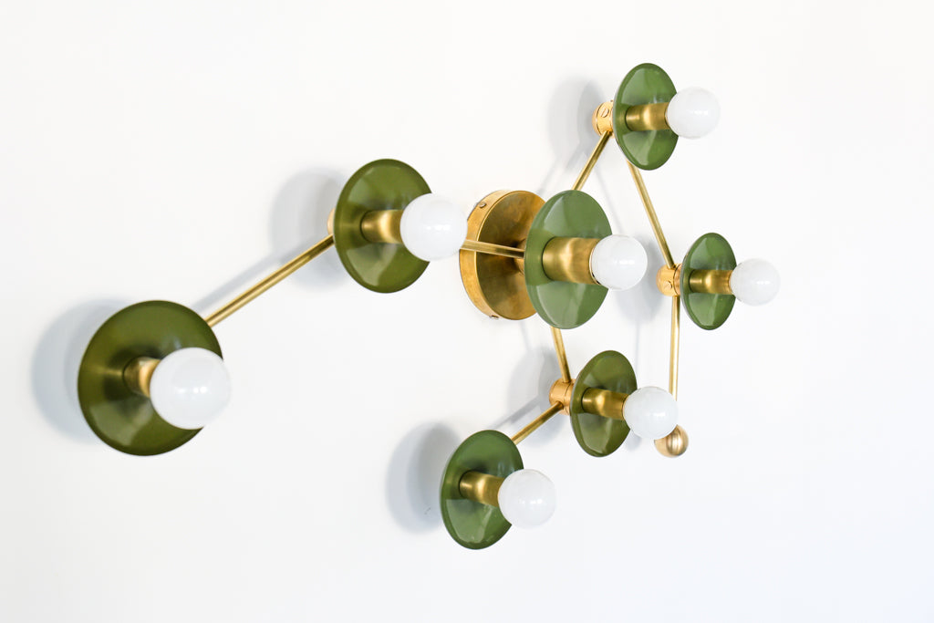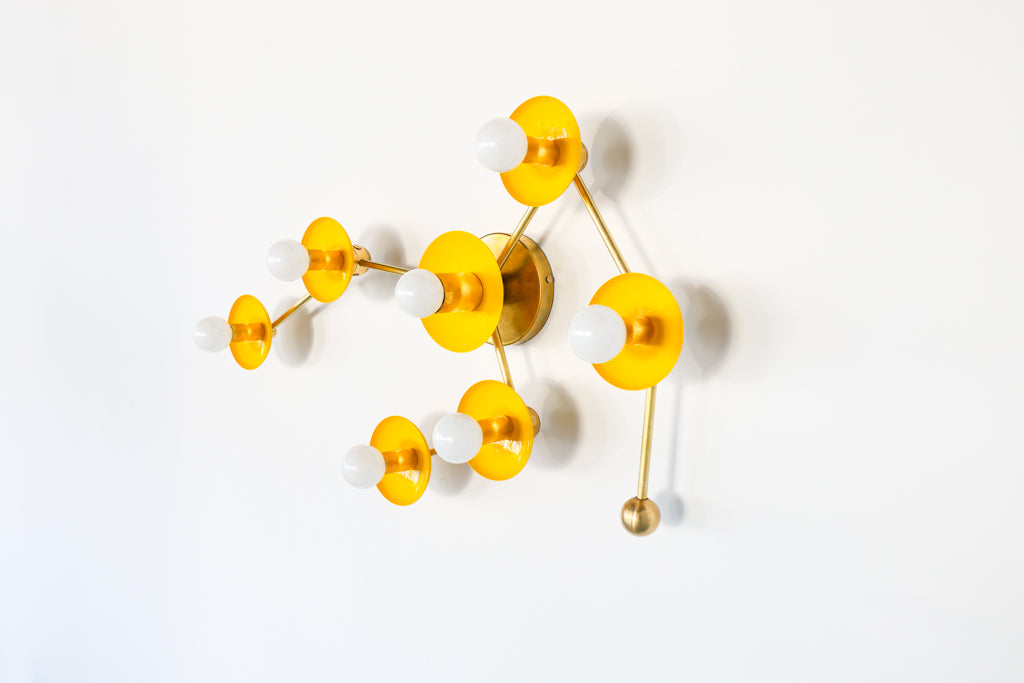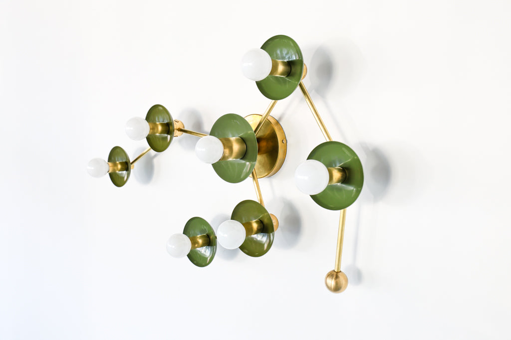 The Leo flushmount or sconce is designed to look like the Leo astrological constellation. It uses a combination of socket and disc sizes to look like small and large stars. The fixture is made of raw brass, chrome, or powdercoated steel components.