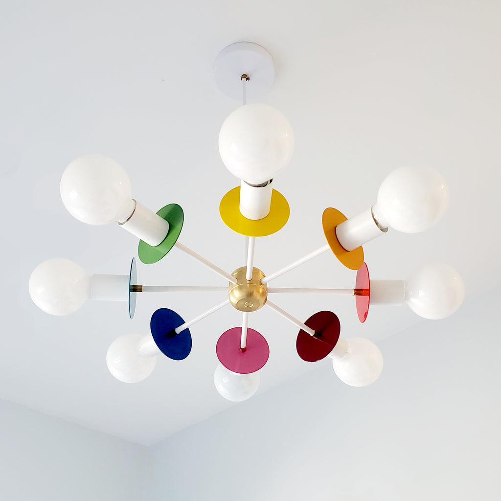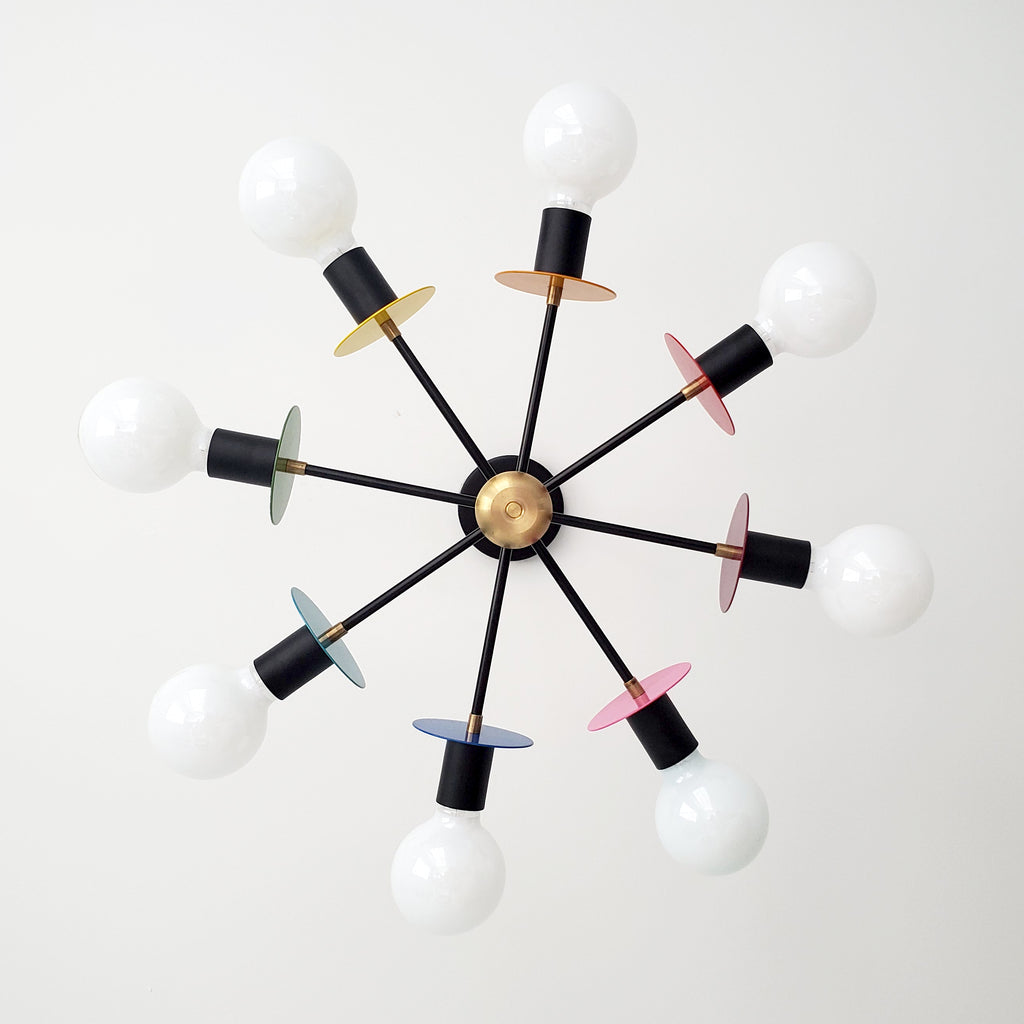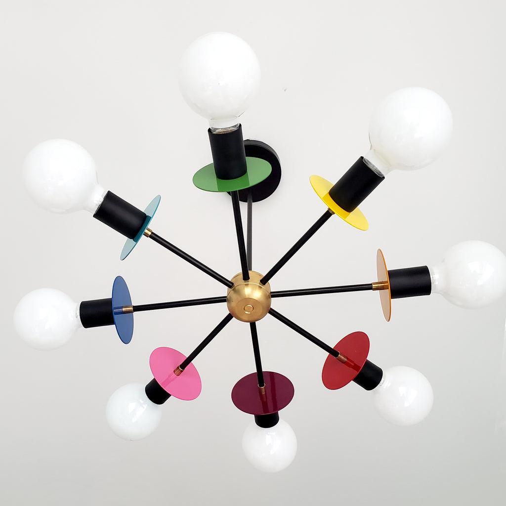 The Luz Chandelier is a playful chandelier with Mid Century Modern vibes. Portuguese for "light," the Luz chandelier has eight arms with different colored discs. Perfect for any room that needs a colorful pick-me-up.