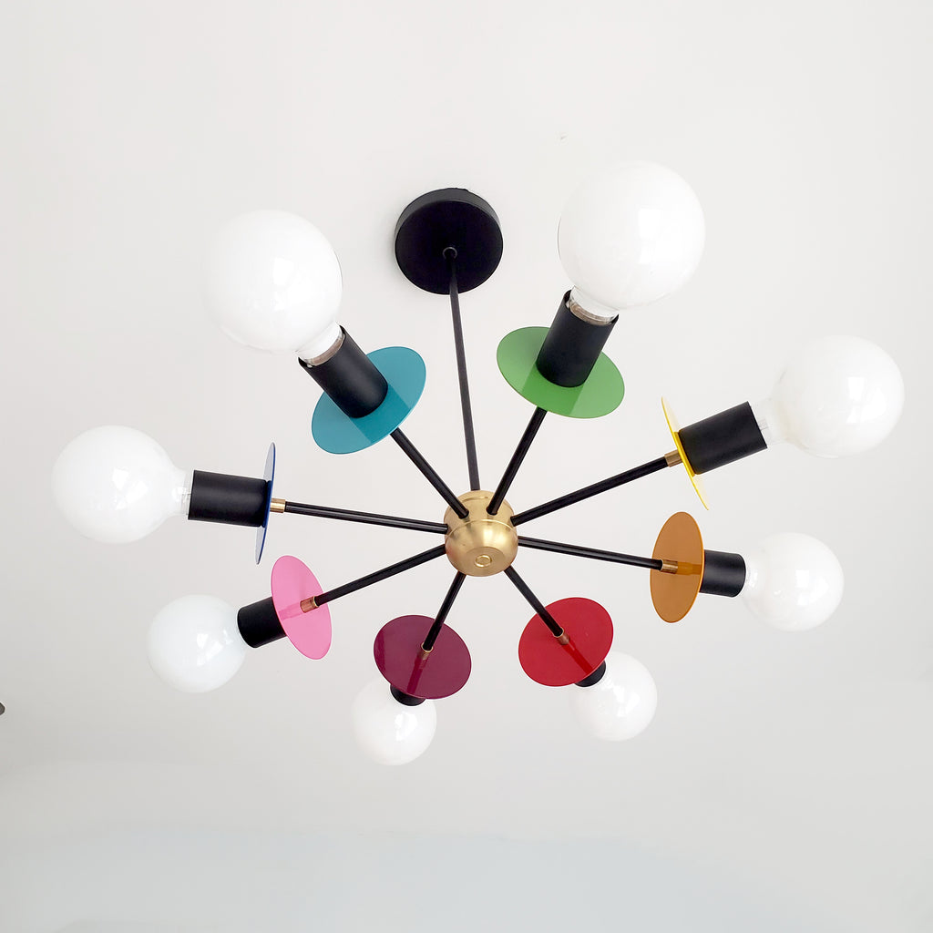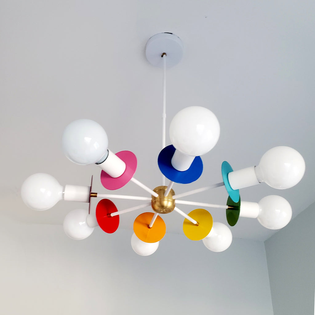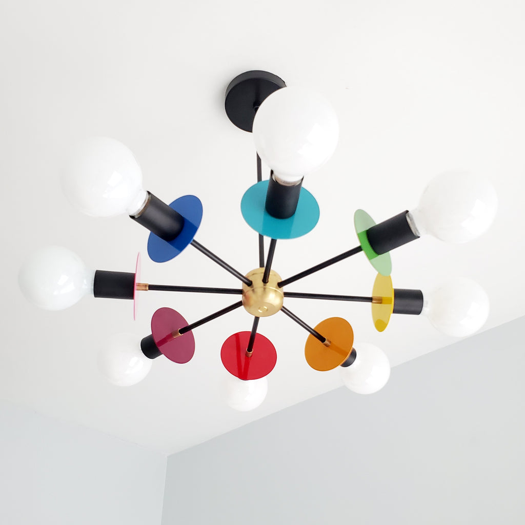 The Luz Chandelier is a playful chandelier with Mid Century Modern vibes. Portuguese for "light," the Luz chandelier has eight arms with different colored discs. Perfect for any room that needs a colorful pick-me-up.