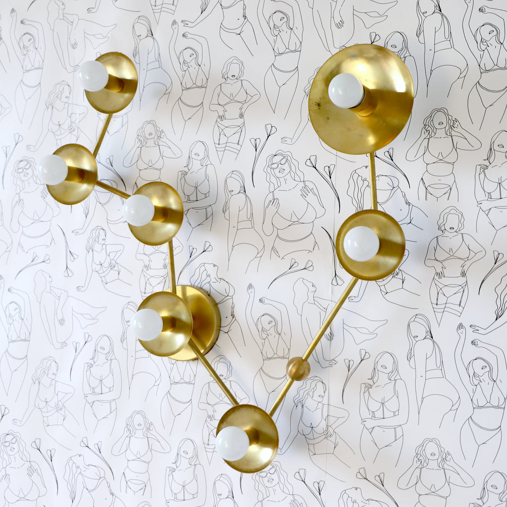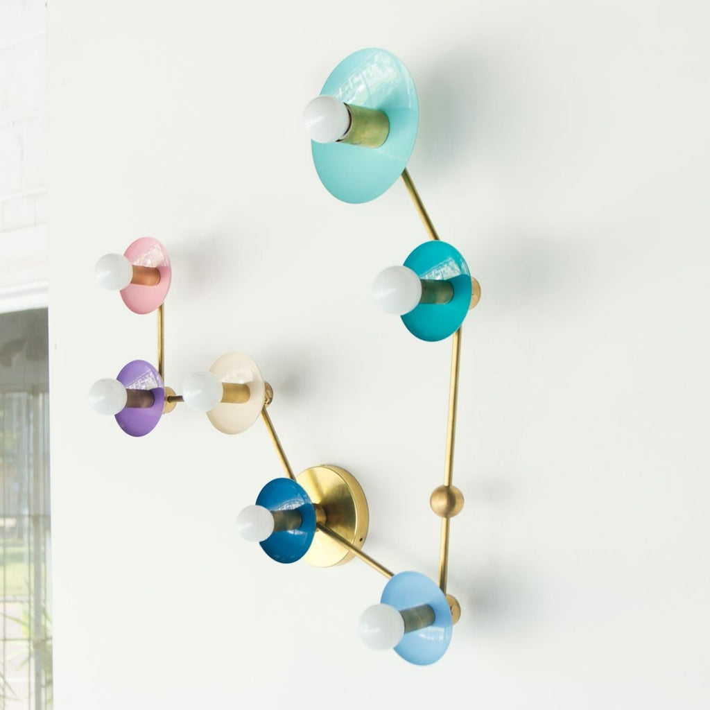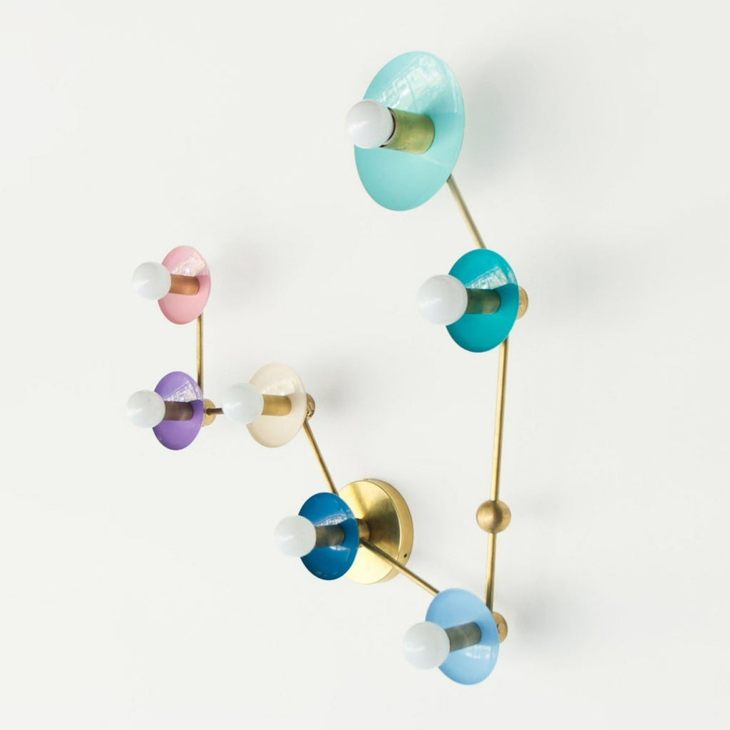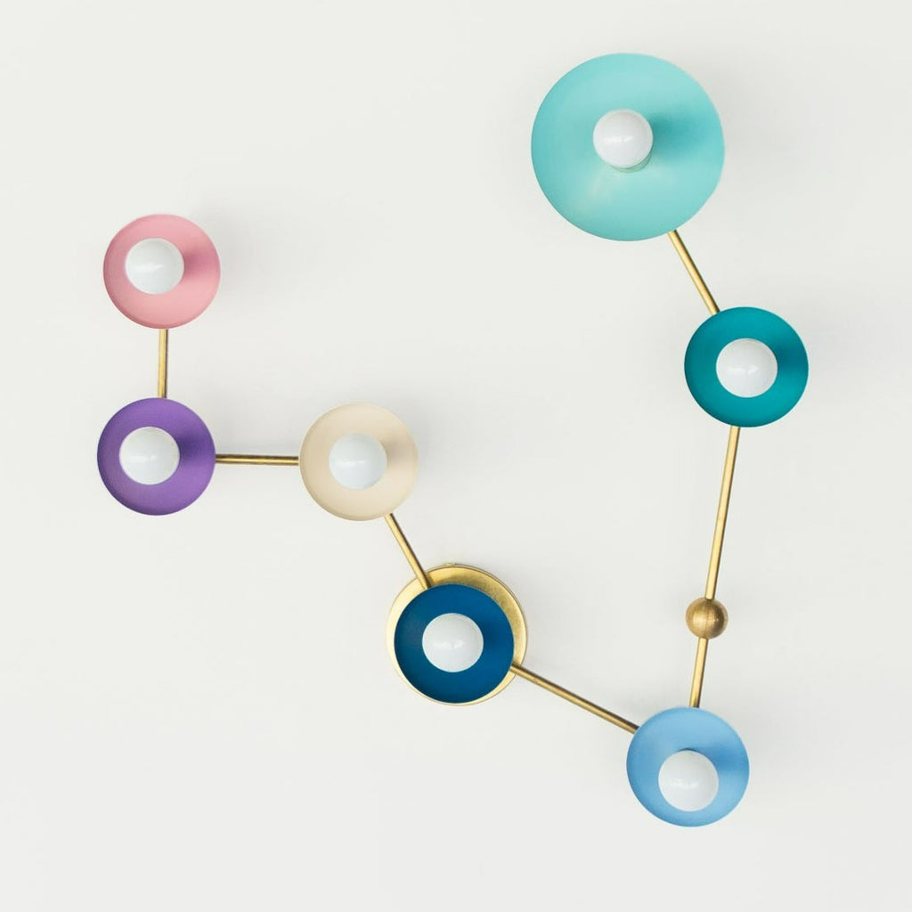 The Pisces flushmount or sconce is designed to look like the Pisces astrological constellation. It uses a combination of socket and disc sizes to look like small and large stars. The fixture is made of raw brass, chrome, or powdercoated steel components.