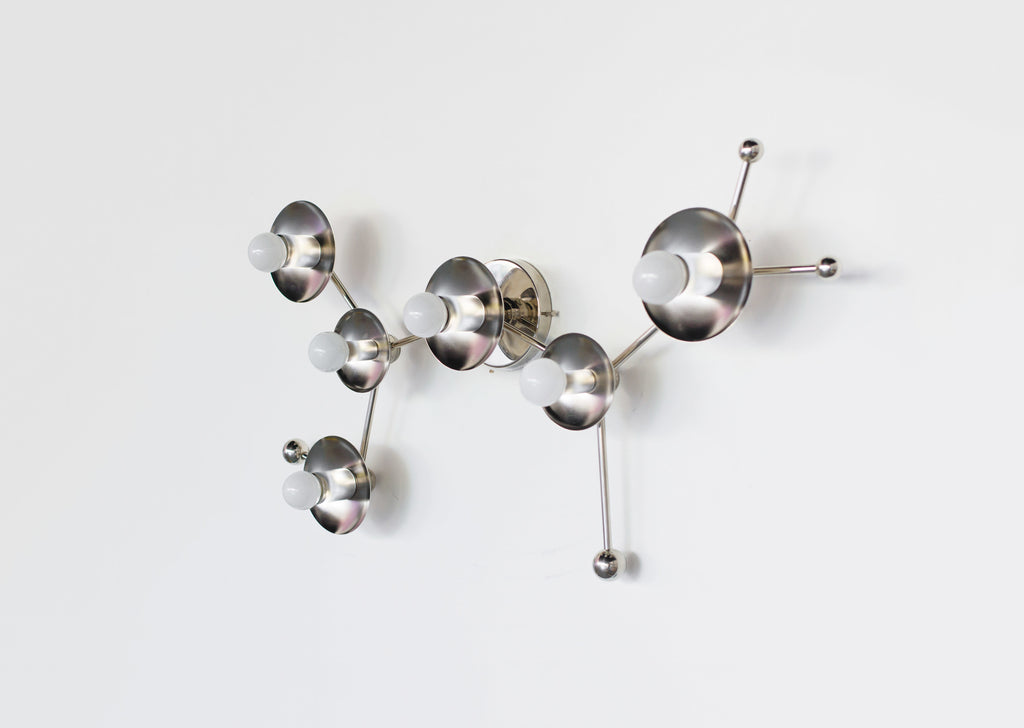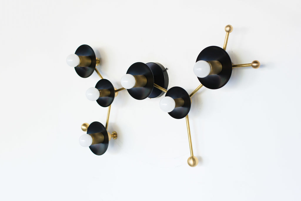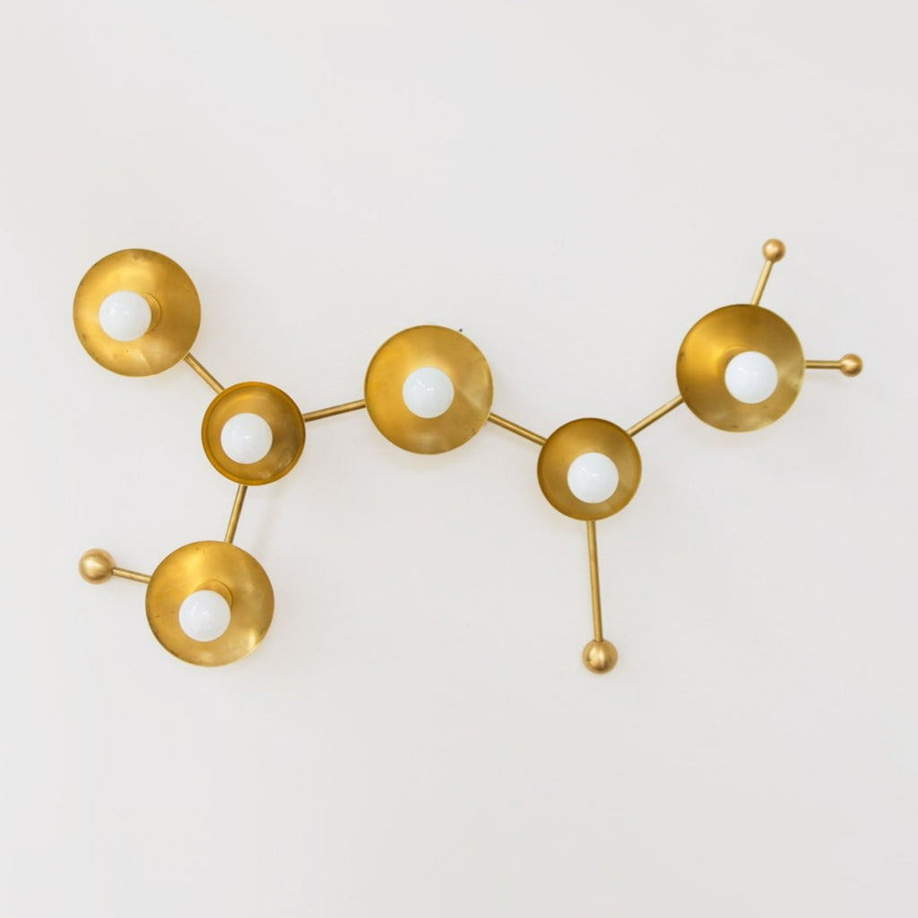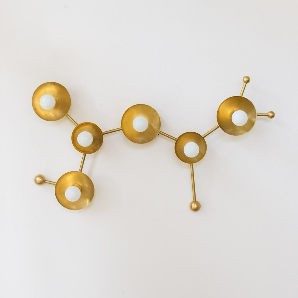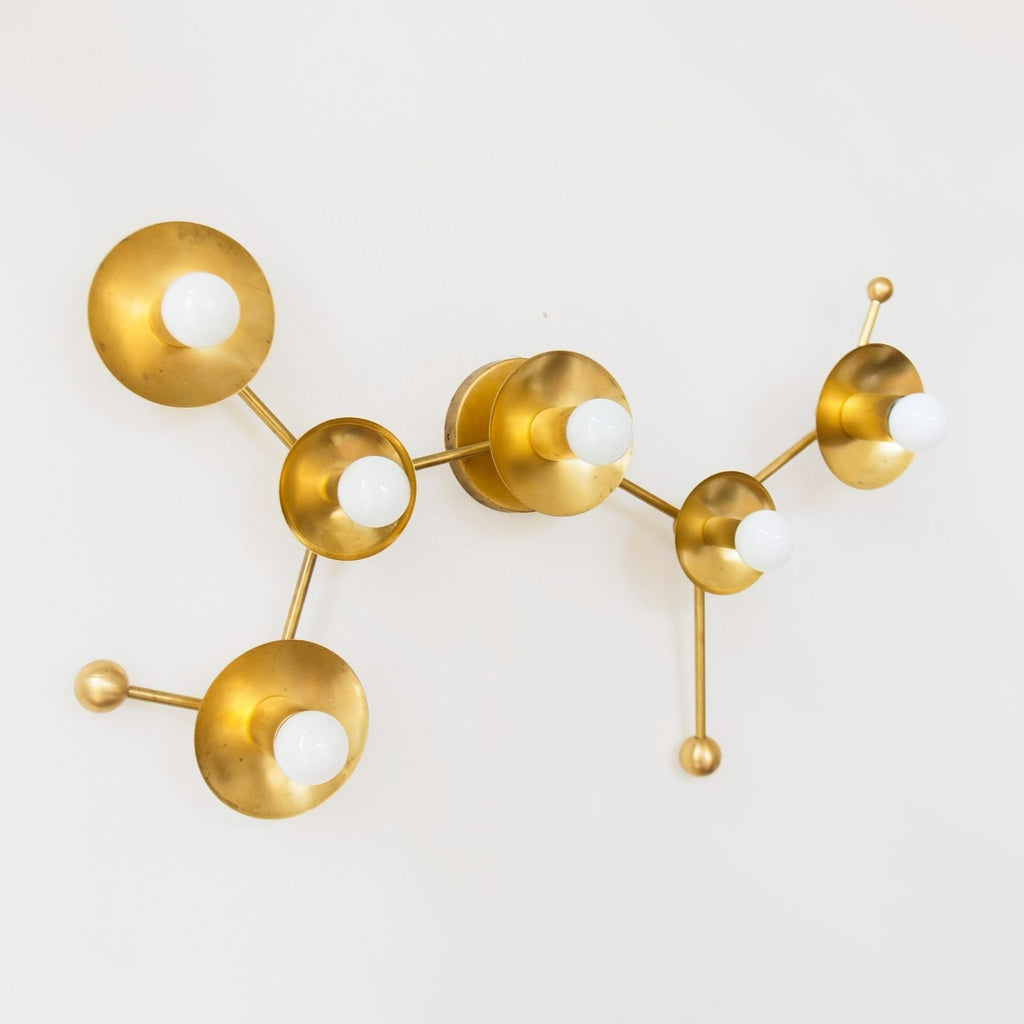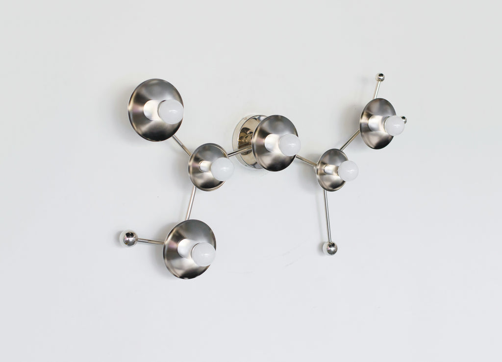 The Sagittarius flushmount or sconce is designed to look like the Sagittarius astrological constellation. It uses a combination of socket and disc sizes to look like small and large stars. The fixture is made of raw brass, chrome, or powdercoated steel components.