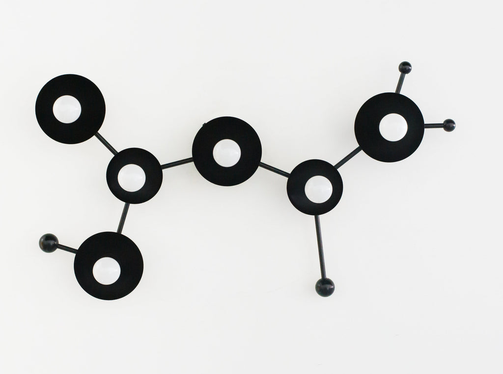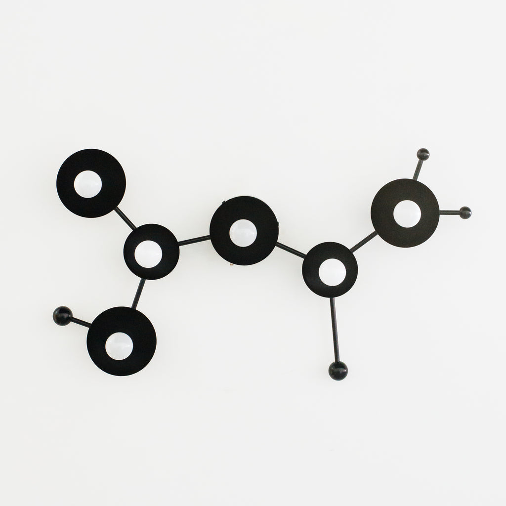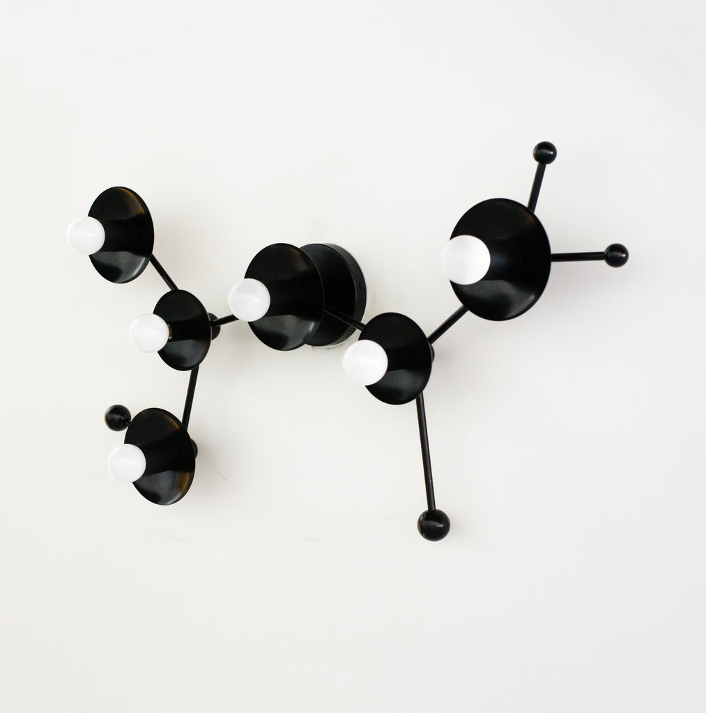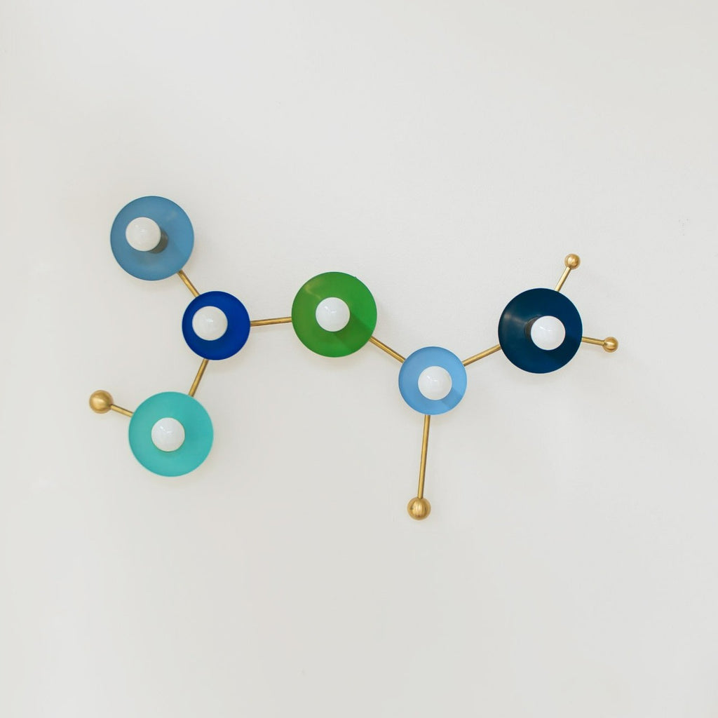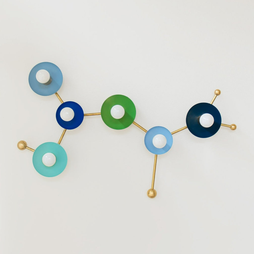 The Sagittarius flushmount or sconce is designed to look like the Sagittarius astrological constellation. It uses a combination of socket and disc sizes to look like small and large stars. The fixture is made of raw brass, chrome, or powdercoated steel components.
