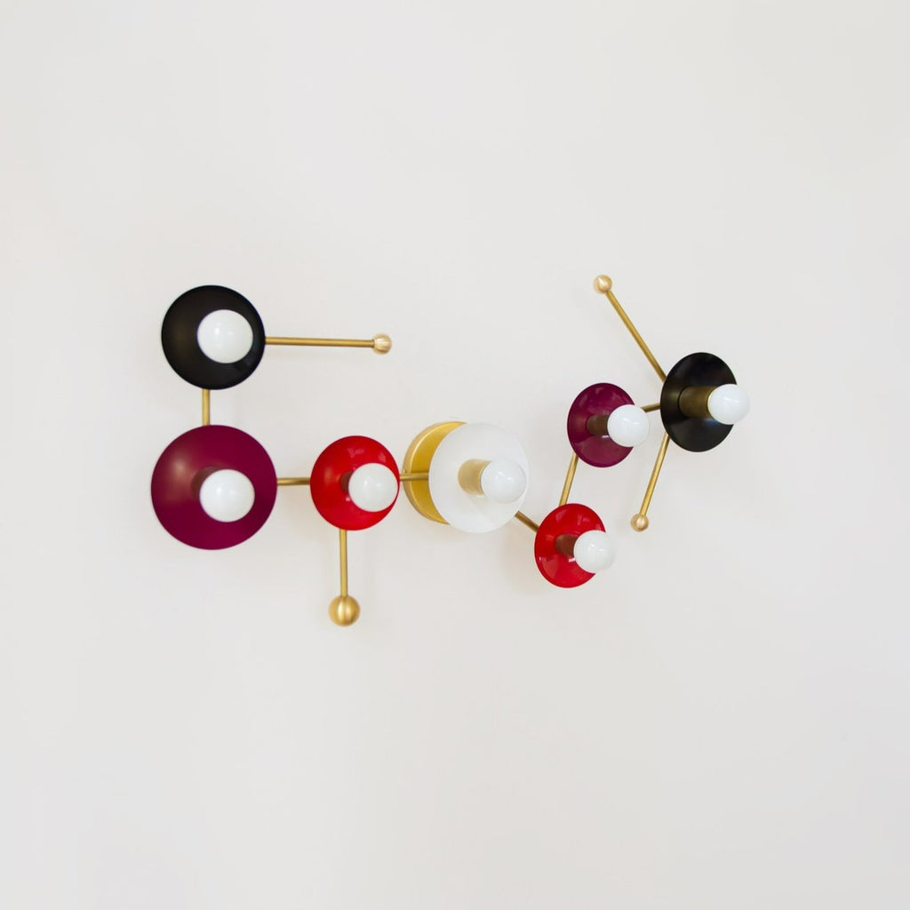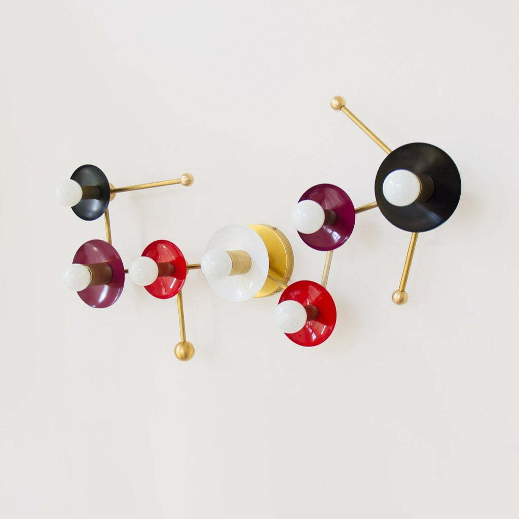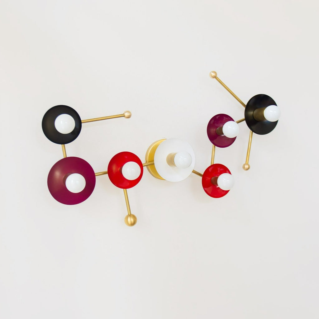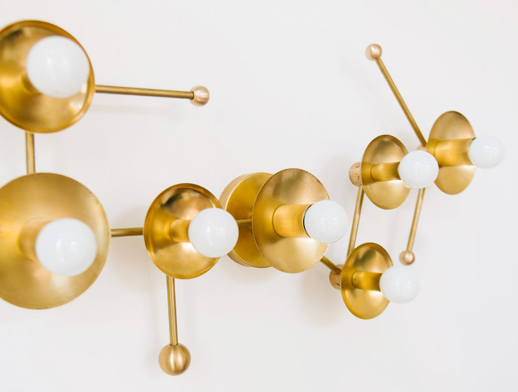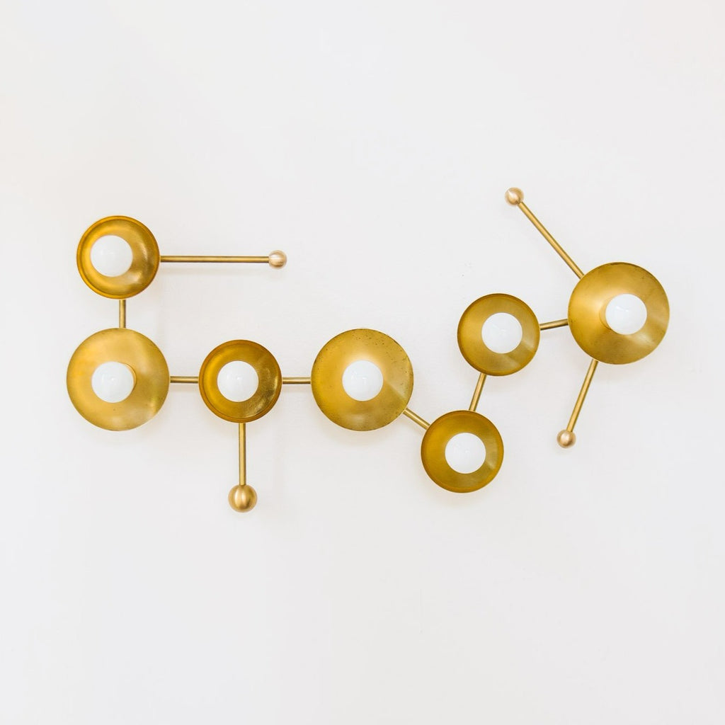 The Scorpio flushmount or sconce is designed to look like the Scorpio astrological constellation. It uses a combination of socket and disc sizes to look like small and large stars. The fixture is made of raw brass, chrome, or powdercoated steel components.