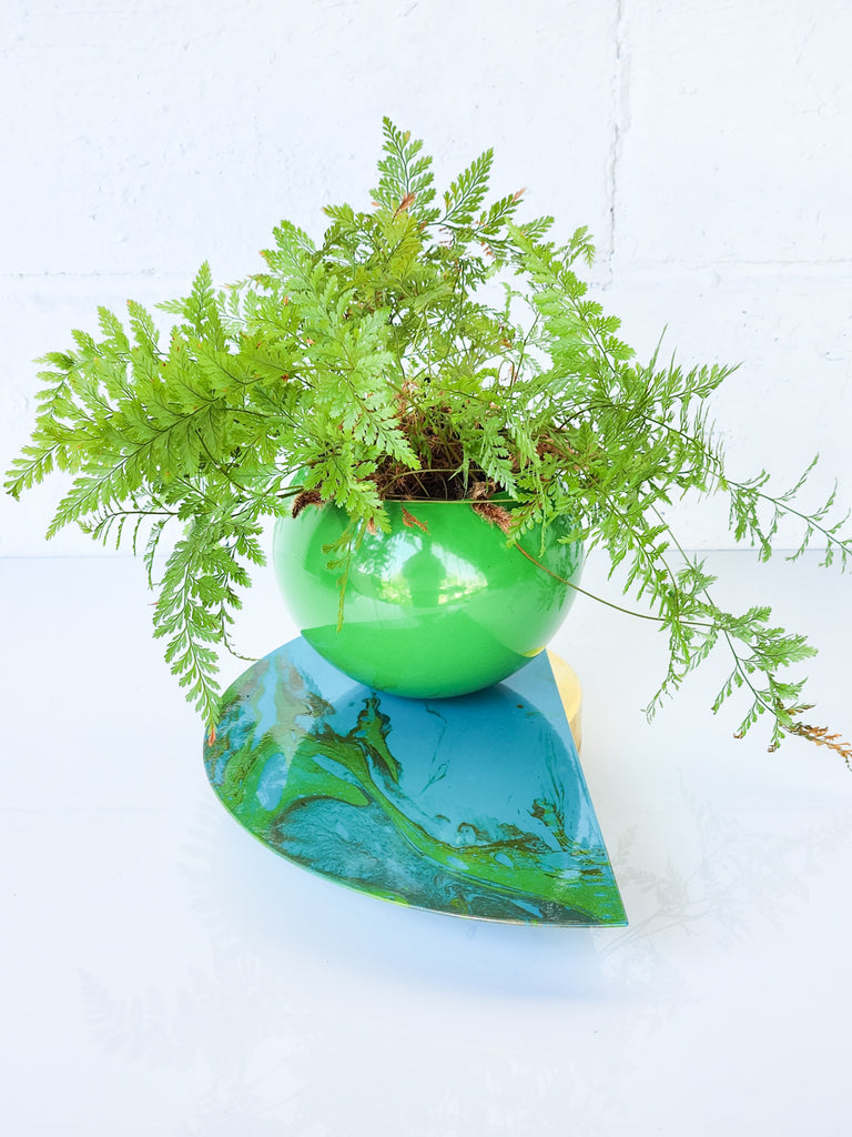 A modern, minimal planter in a teal finish with teal and green marbling. The base is brass. The marbling is protected with a clear coat of powdercoating. You can style it with a plant or use it as a vase. Due to the unique nature of painting, no two planters are alike.