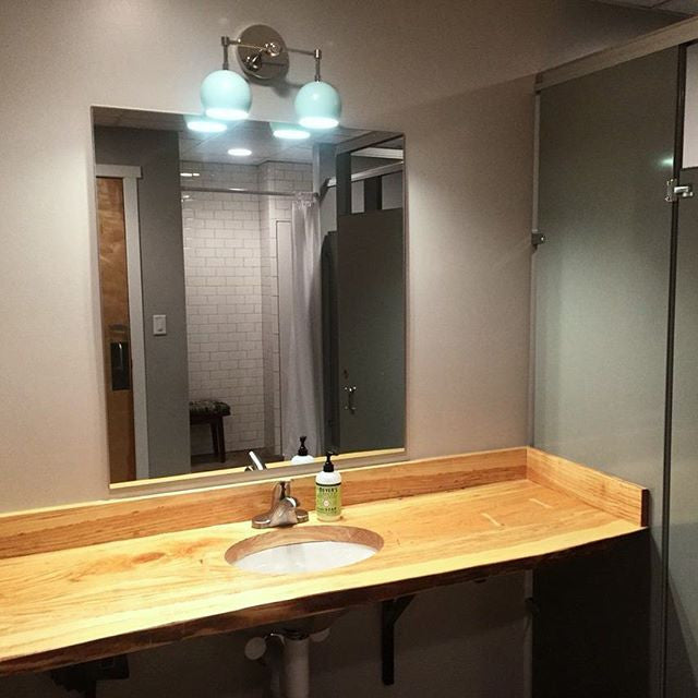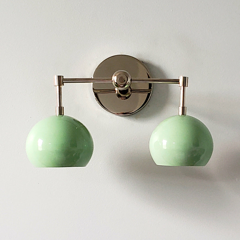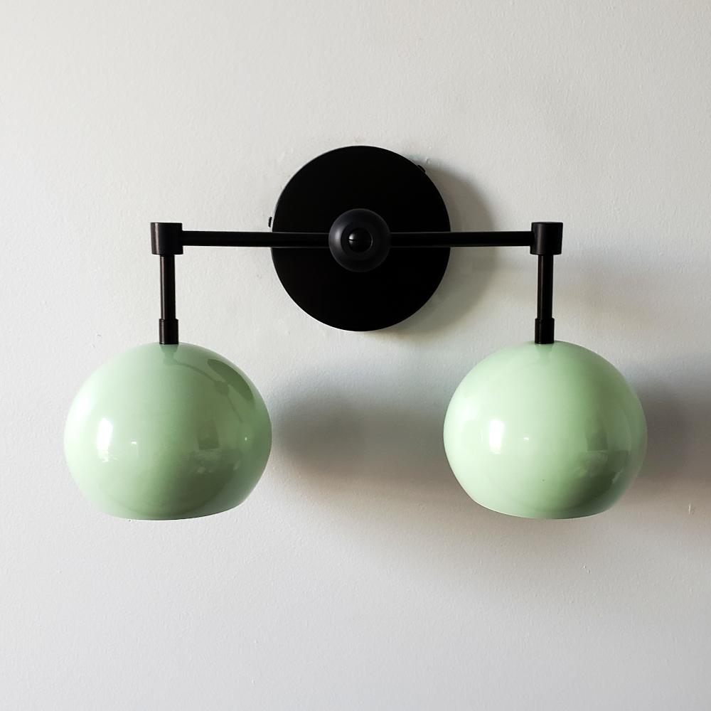 The Double Loa Sconce has a simple, minimalist design that can be fun or modern. Either way, it is bound to garner loads of compliments. This fixture is a two-light version of our single Loa sconce. The shades are steel shades covered in a mint colored enamel.
