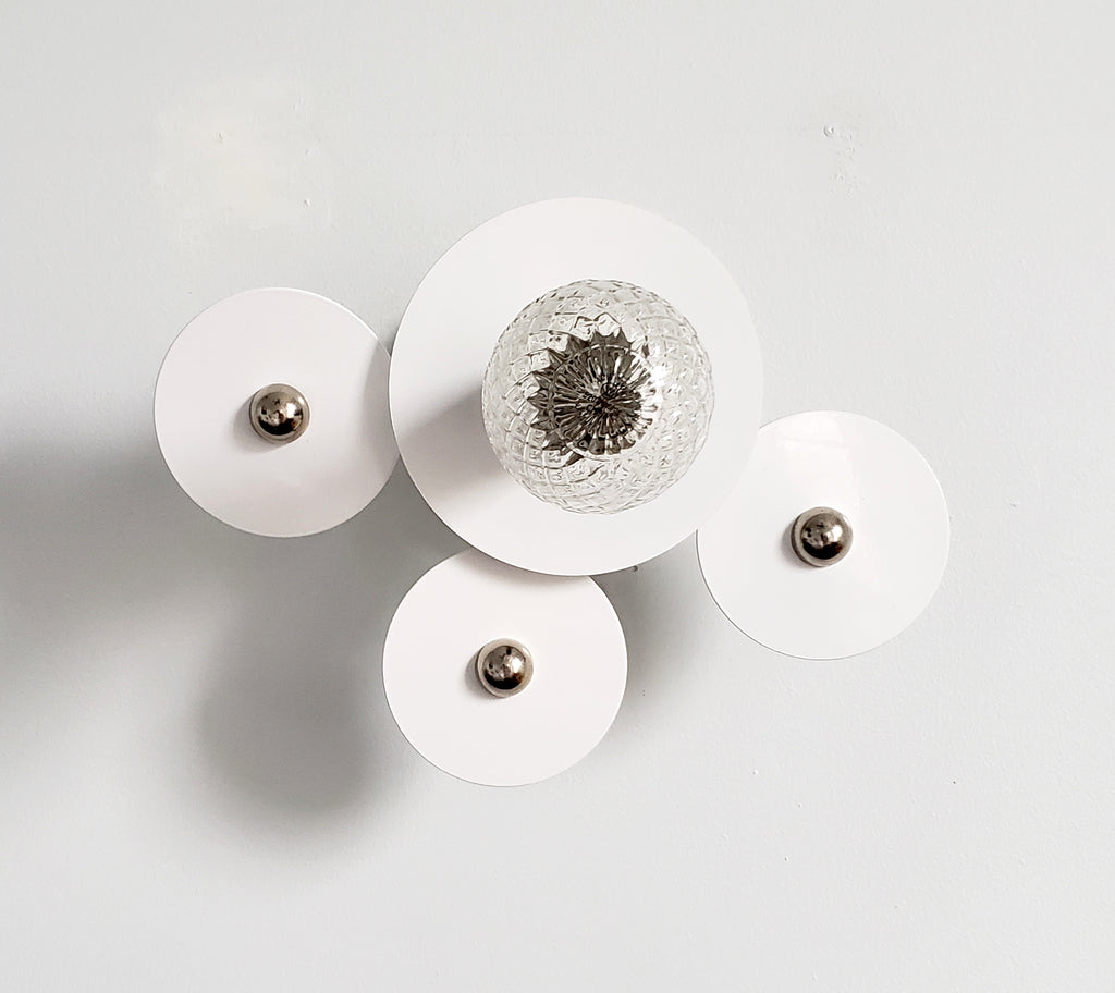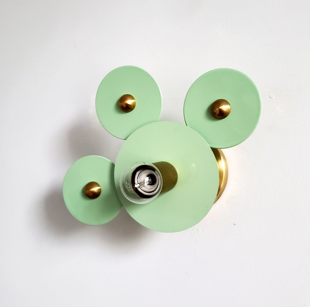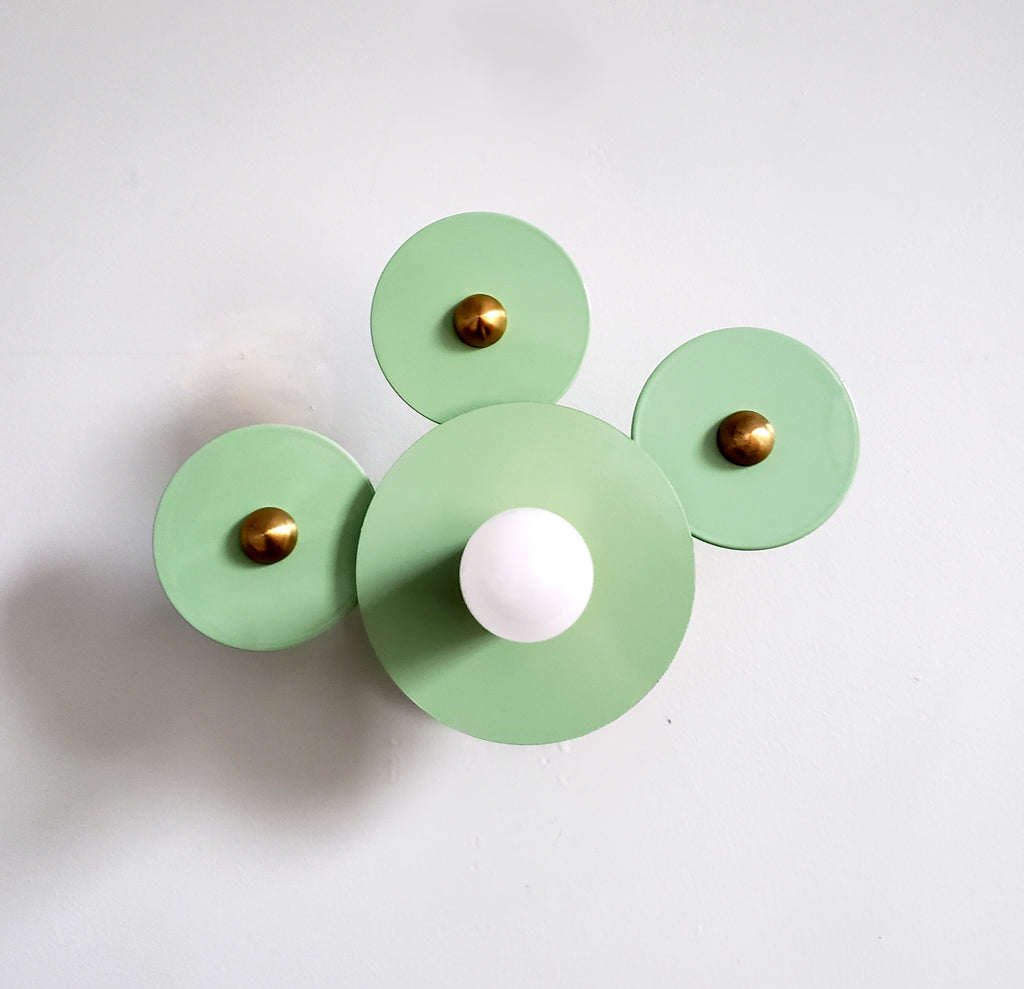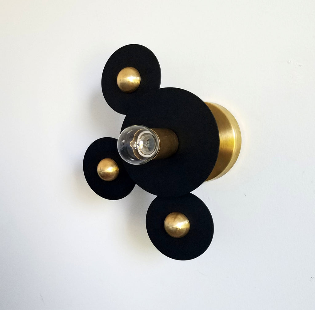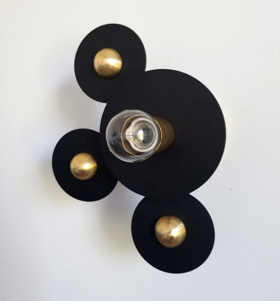 A little asymmetry mixed with matte black and gold discs spotlight a single bulb. This simple sconce or flushmount can highlight the beauty of the bulb chosen or can stand on its own with a simple bulb choice.