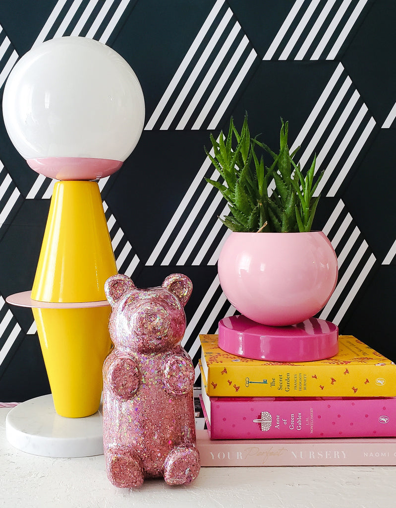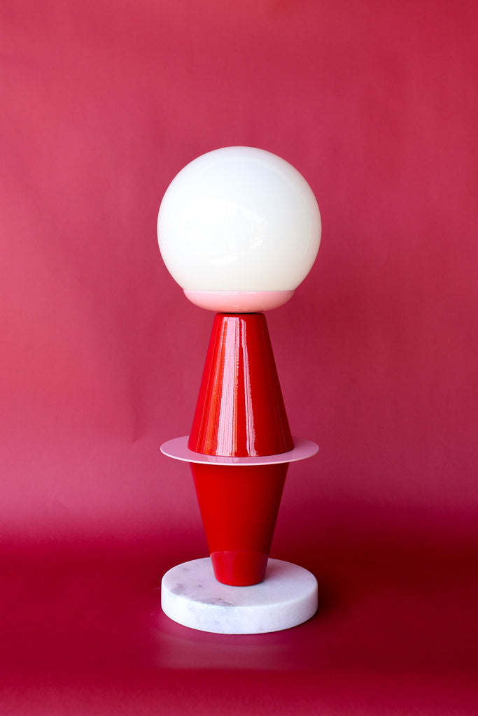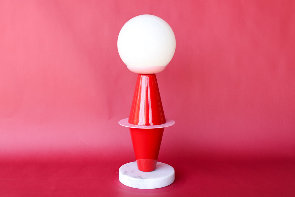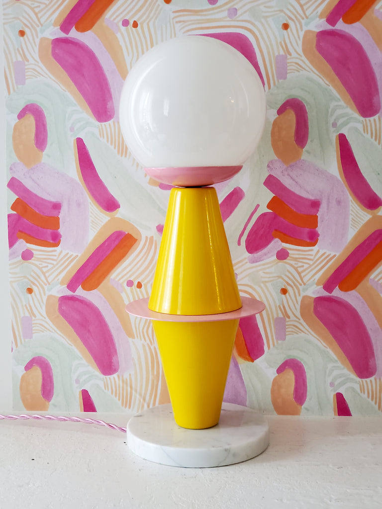 Equal parts quirky and cute, the Totem Lamp by Sazerac Stitches provides ambient lighting to add interest to boring areas. Inspired by equal parts Mid Century modern and the Memphis movement, the Totem Lamp has one glass globe, and colorful column with a marble base.