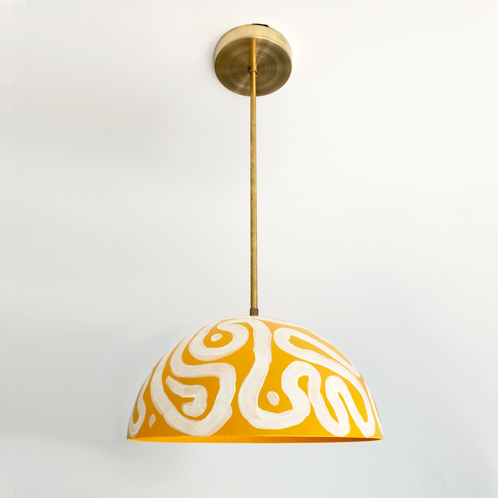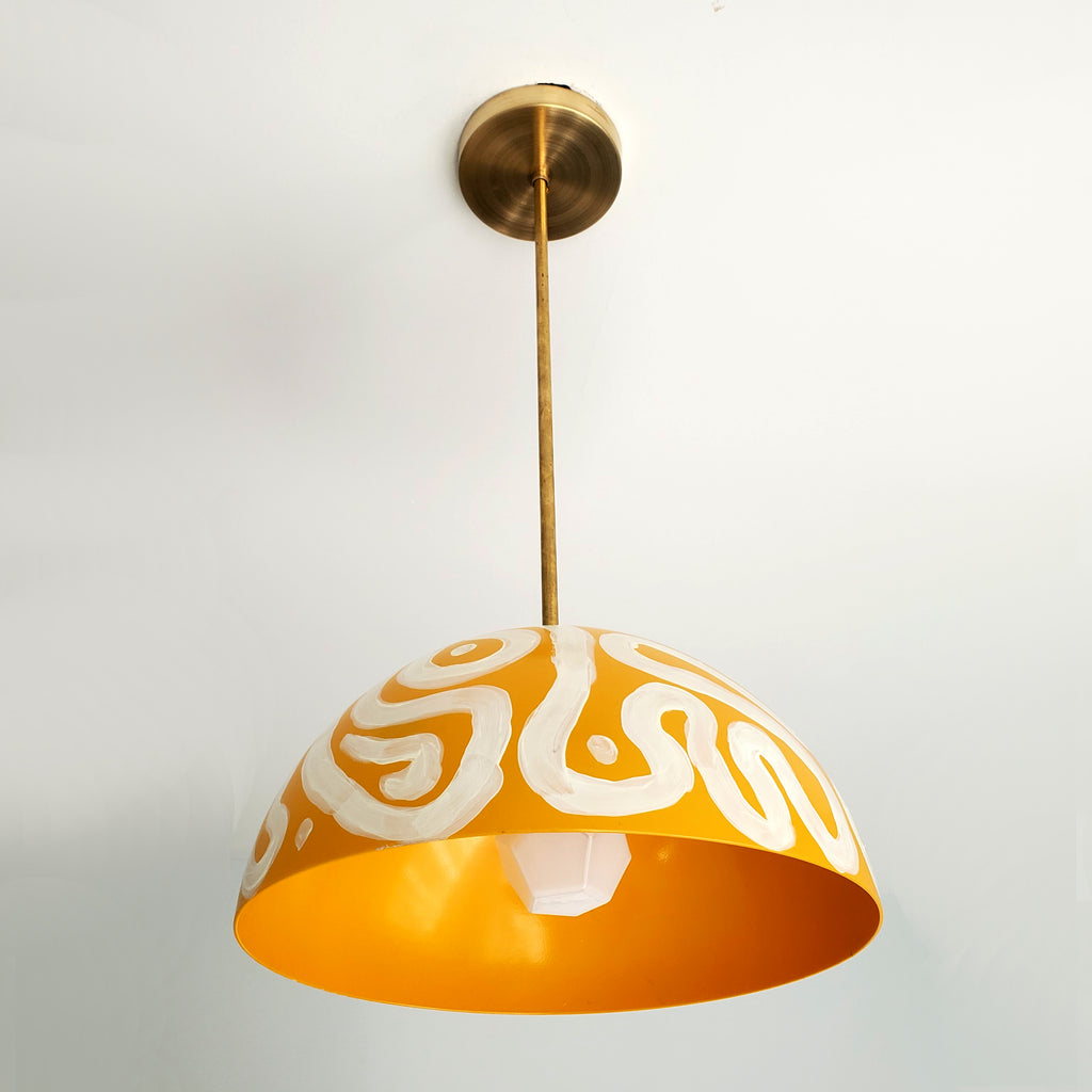 The Noma Pendant is a simple Dome shaped pendant in mustard that has been hand painted and sealed in clear powdercoating for durability.  The hand-painted pendant comes with three downrod options: 24 inches, 18 inches, and 12 inches. If a specific length is needed instead, contact us.