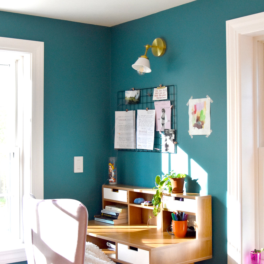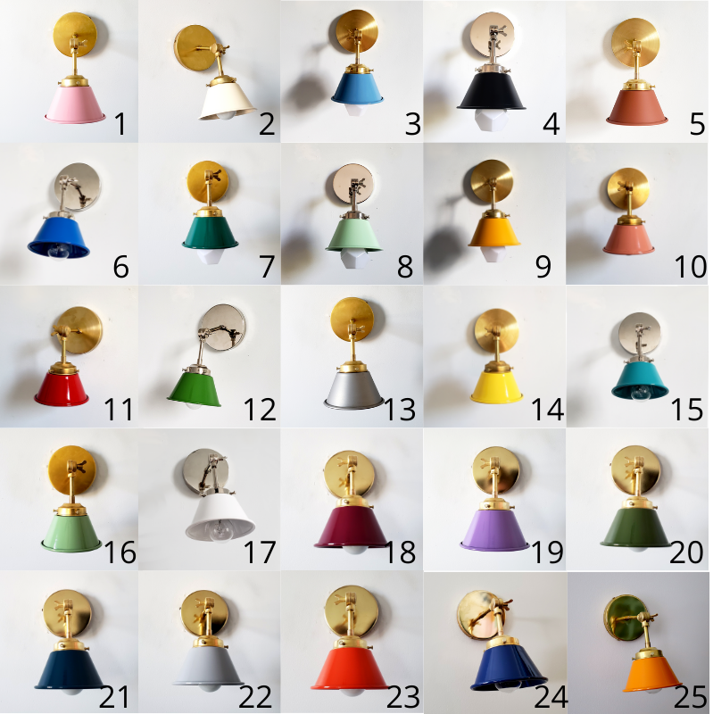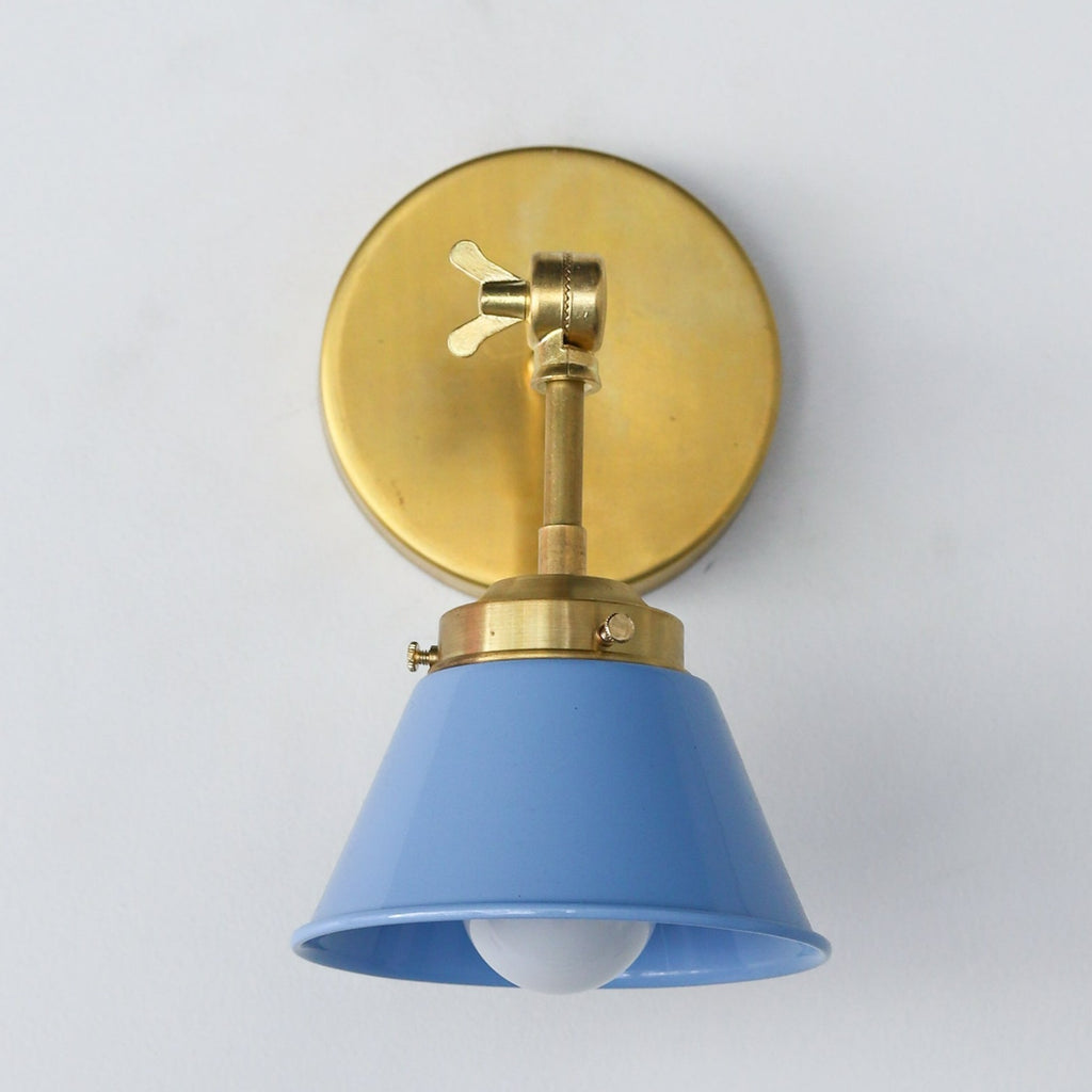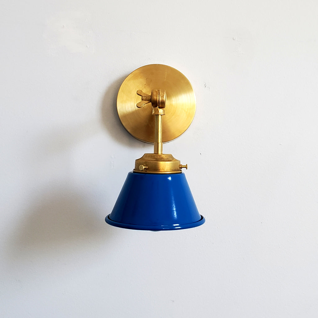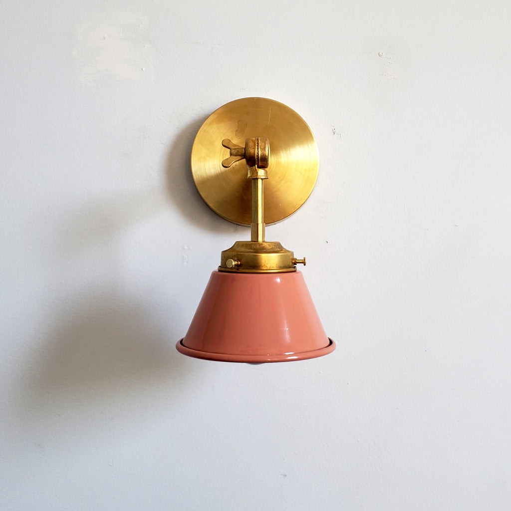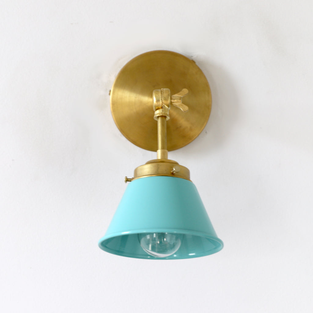 The Adjustable Kelly sconce is playful little sconce with a colored cone shade adjustable keyed swivel. It has one E26/medium base socket. The raw brass will develop a patina over time or can be polished occasionally to retain it's beautiful brassy sheen. We love these sconces above open shelving, as a bedside reading lamp, or as accent lighting. The fixture can be installed with the cone facing up or down.