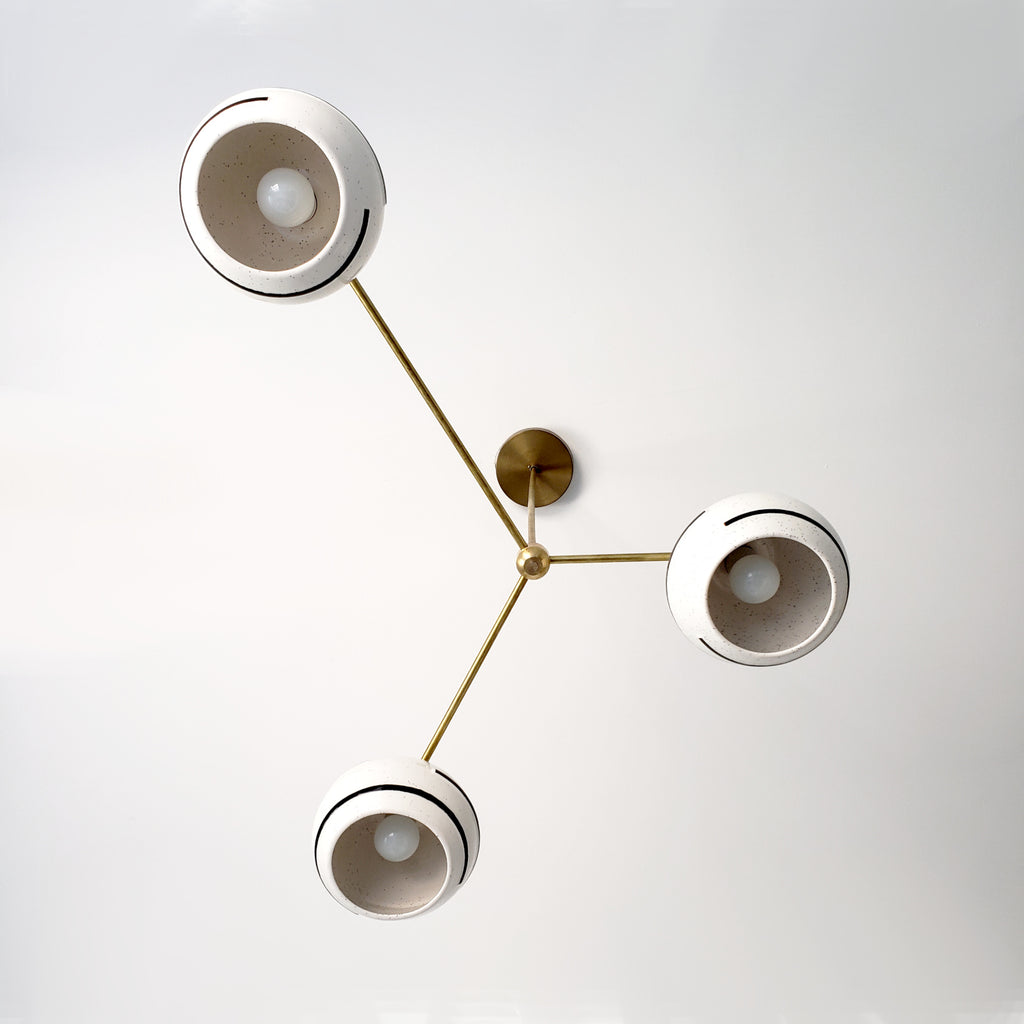 There are three E26/medium base sockets, one for each of the non-translucent ceramic shades. The arms are at asymmetric lengths for interest. Unsealed, unlacquered brass accents and hardware.