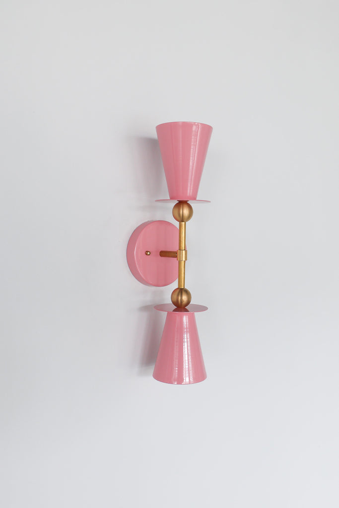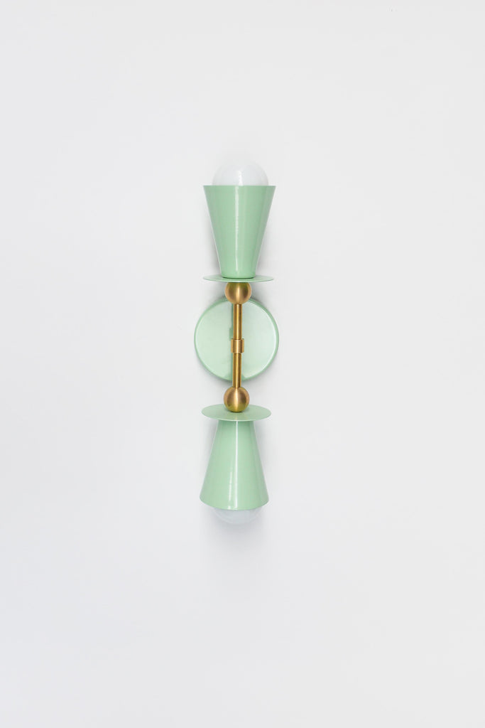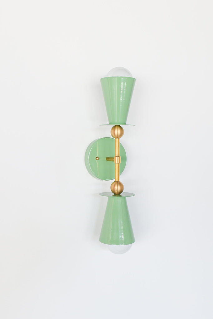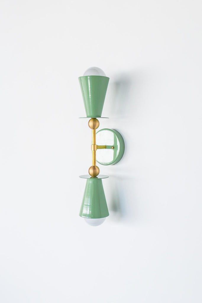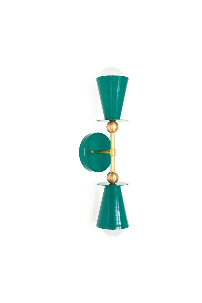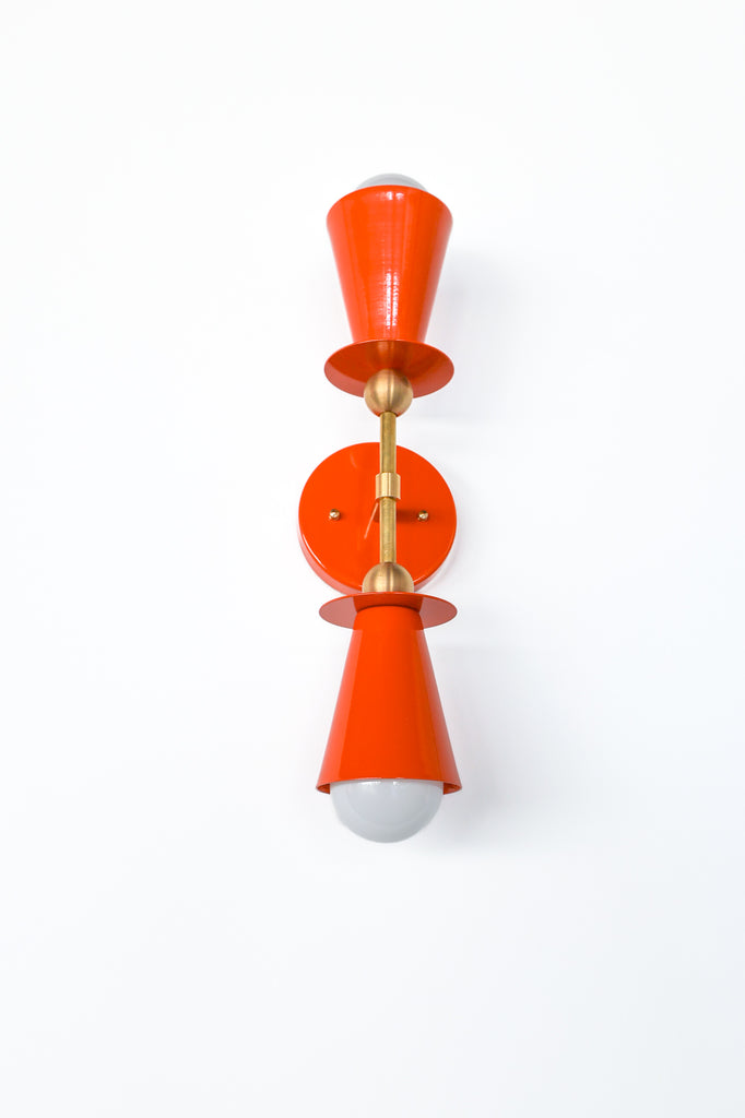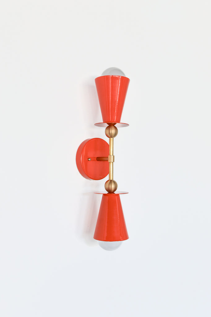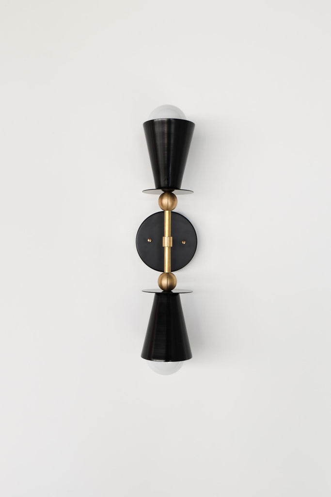 Janus Sconce is a bold, architectural two-light wall sconce with a stacked, geometric silhouette that feels equal parts brutalist and mid century modern. Two tapered cone shades and crisp disc details give it that structural, graphic look designers love, while the clean globe bulbs keep the light soft and usable. It’s a statement piece without being fussy, basically a little sculptural column for your wall.
