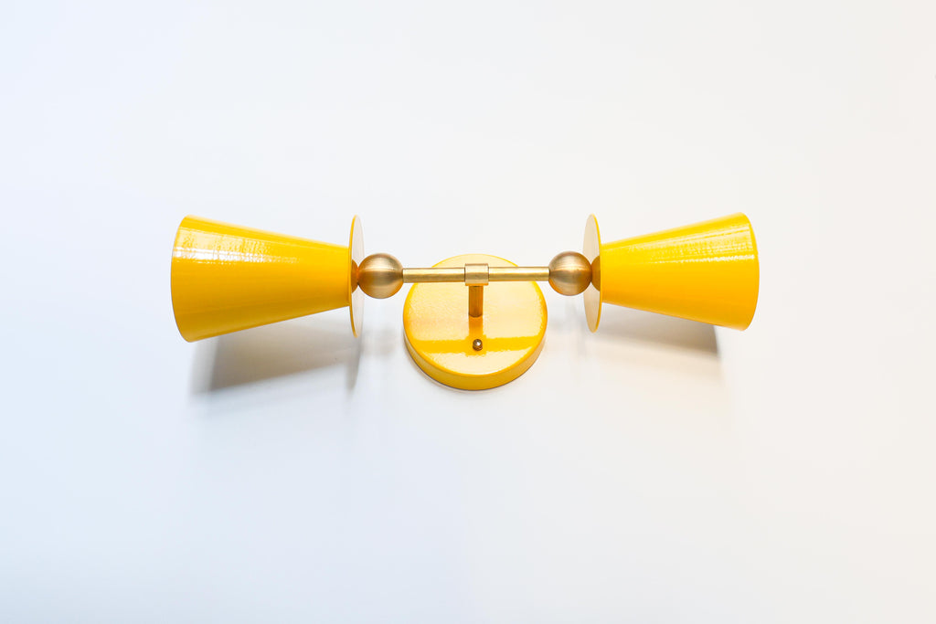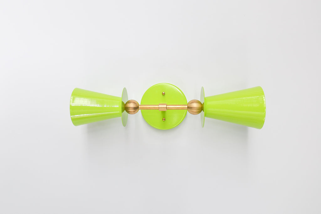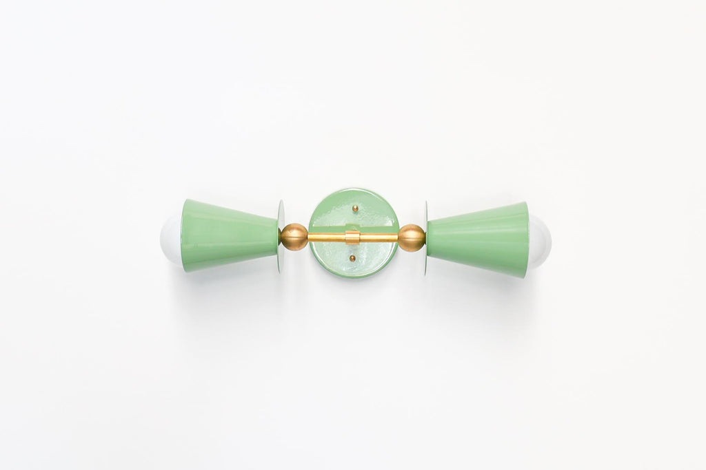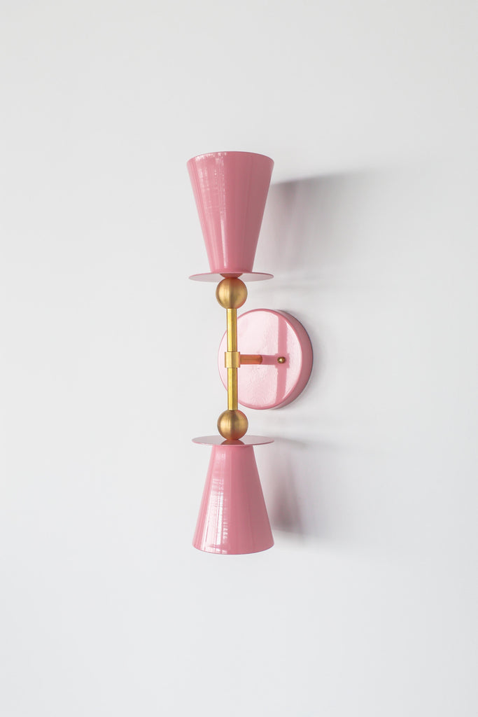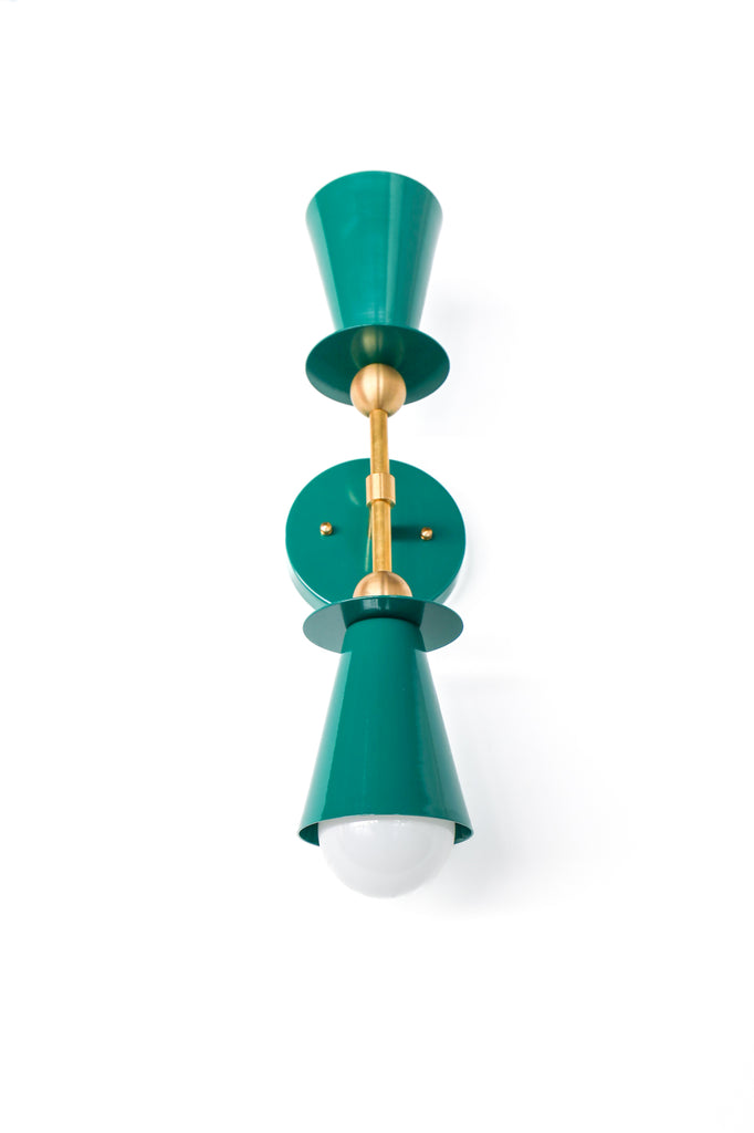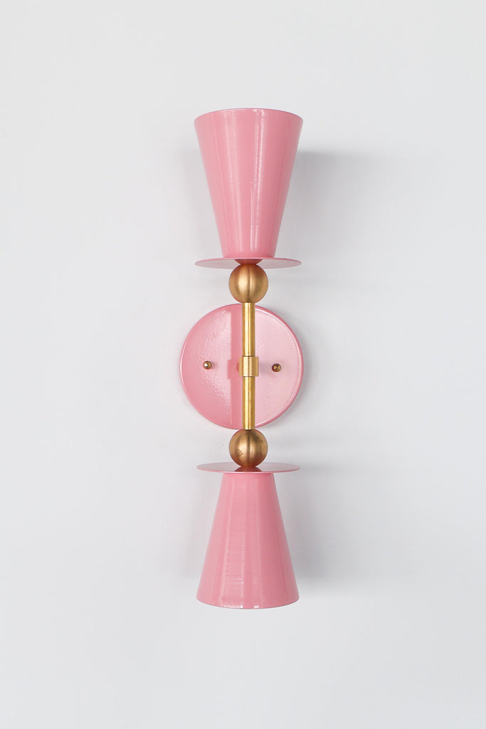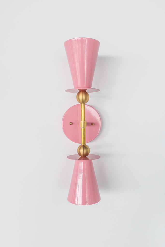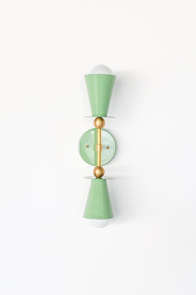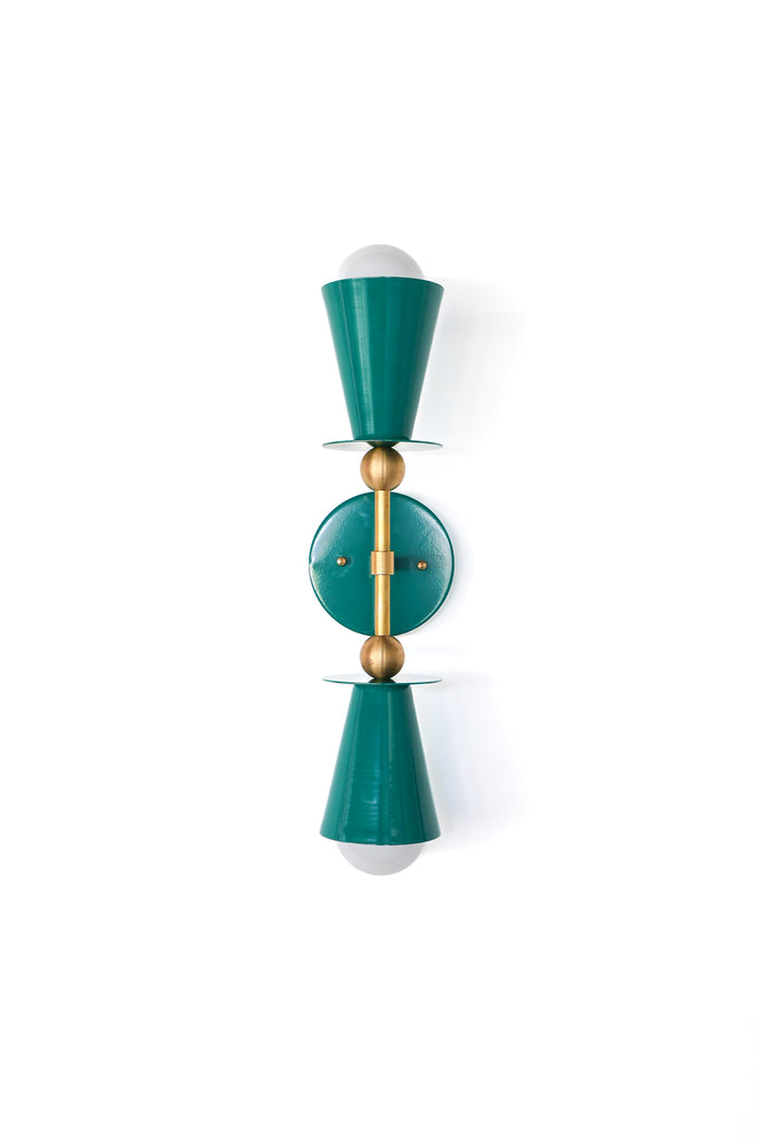 Janus Sconce is a bold, architectural two-light wall sconce with a stacked, geometric silhouette that feels equal parts brutalist and mid century modern. Two tapered cone shades and crisp disc details give it that structural, graphic look designers love, while the clean globe bulbs keep the light soft and usable. It’s a statement piece without being fussy, basically a little sculptural column for your wall.