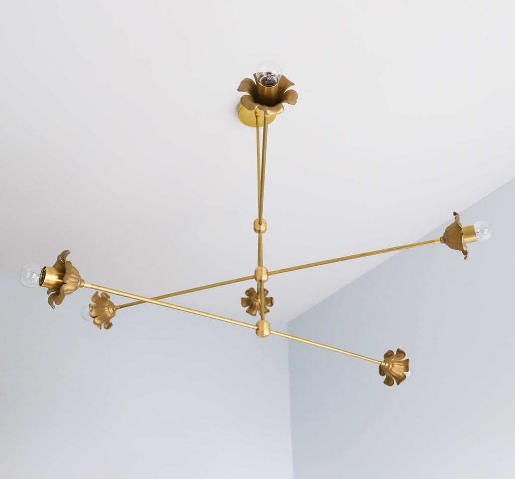 A geometric and slightly romantic large brass chandelier featuring 6 large floral cups.  Spanning about4 feet wide, this is the perfect fixture for a very large space.