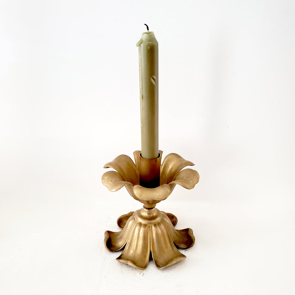 A unique hand-made brass floral taper candle holder. Features two large flowers stacked. The cup has a brass spike to help hold the candle in place. Measures 5.25 inches tall with a 4.5" diameter base. Candle not included.