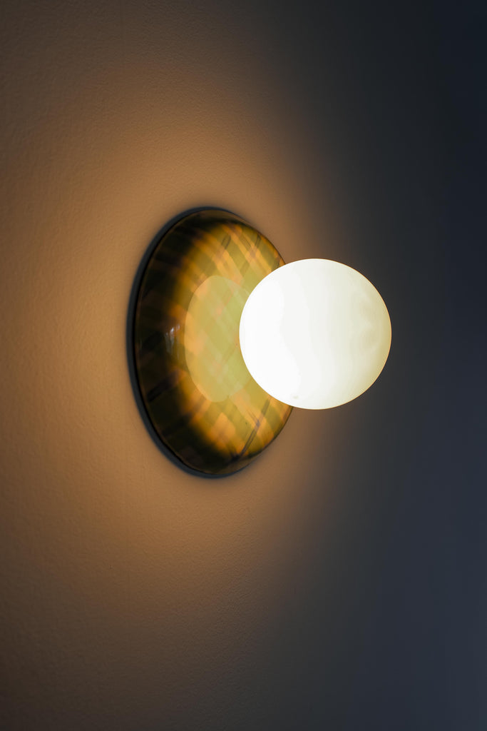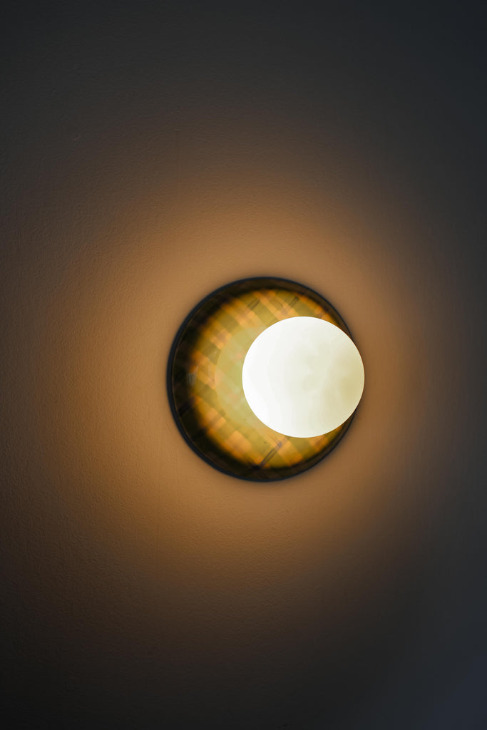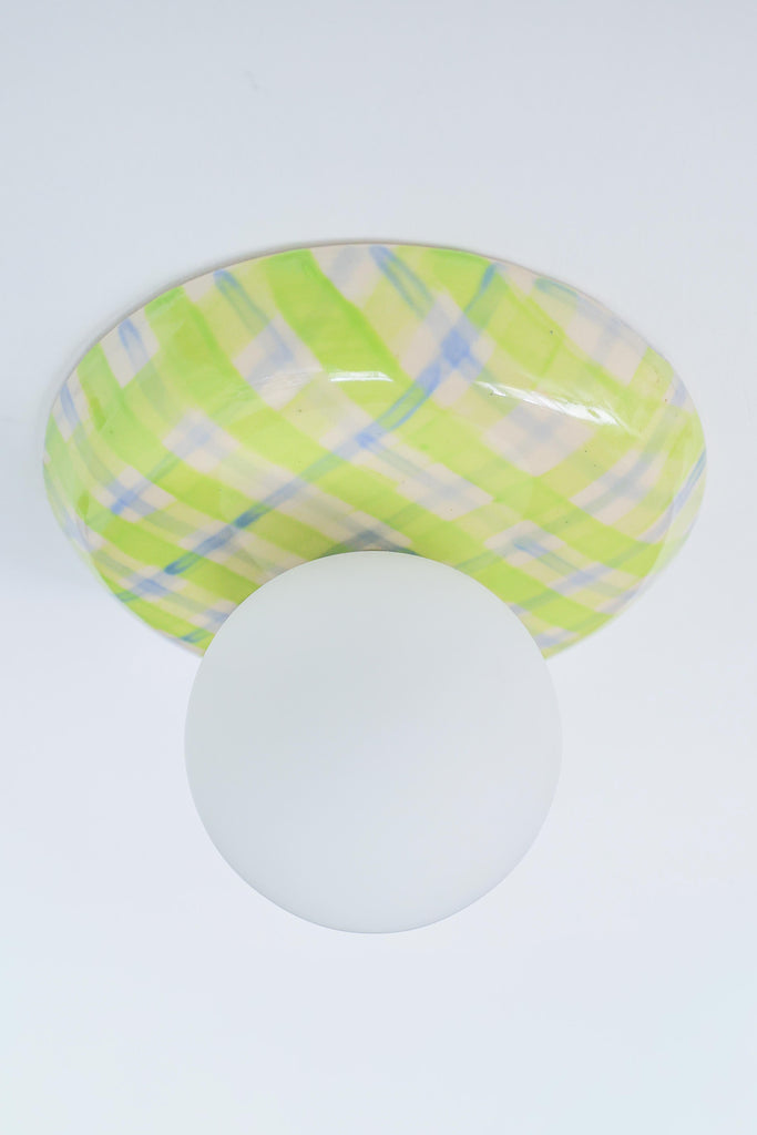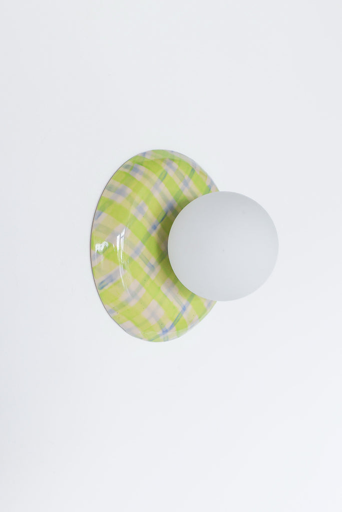 This one-of-a-kind globe sconce features a hand-glazed ceramic backplate finished in a soft, watercolor plaid. The pattern mixes juicy chartreuse with airy blue and pale blush tones, like a sun-faded picnic print that somehow reads both playful and polished. It is bright without being loud, and the brushy, layered look makes it feel more like a piece of art than a standard fixture.