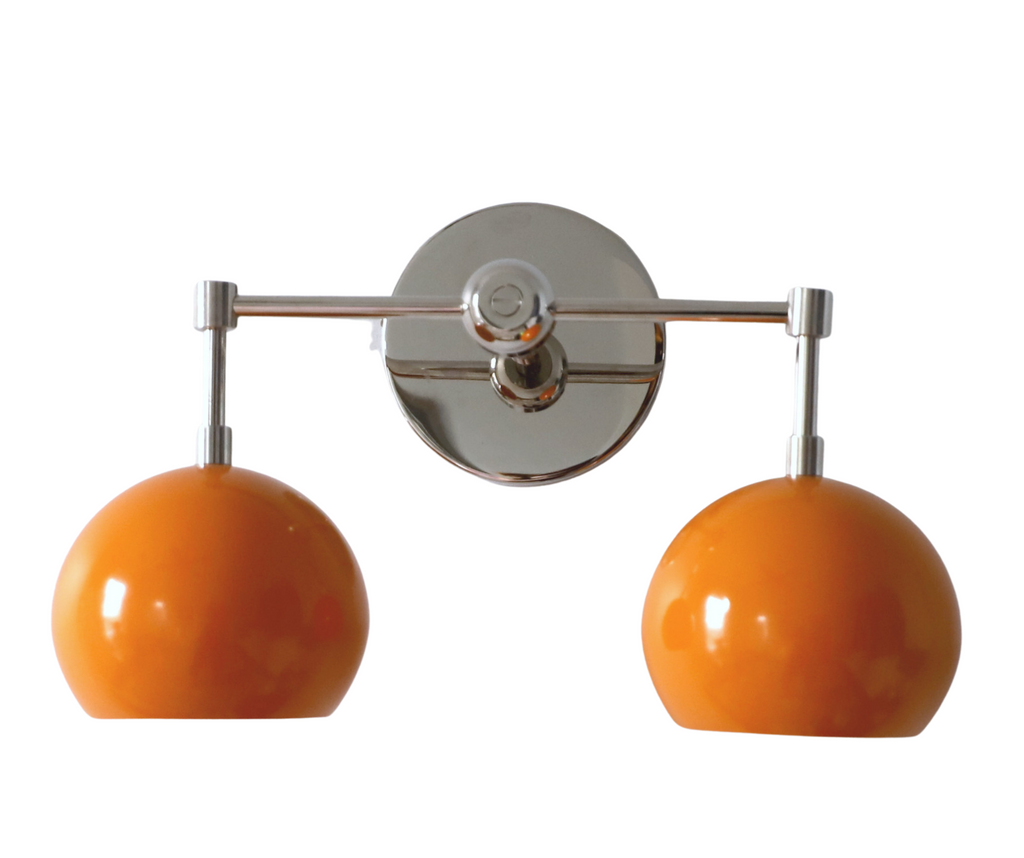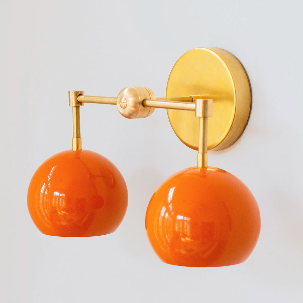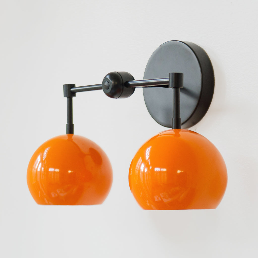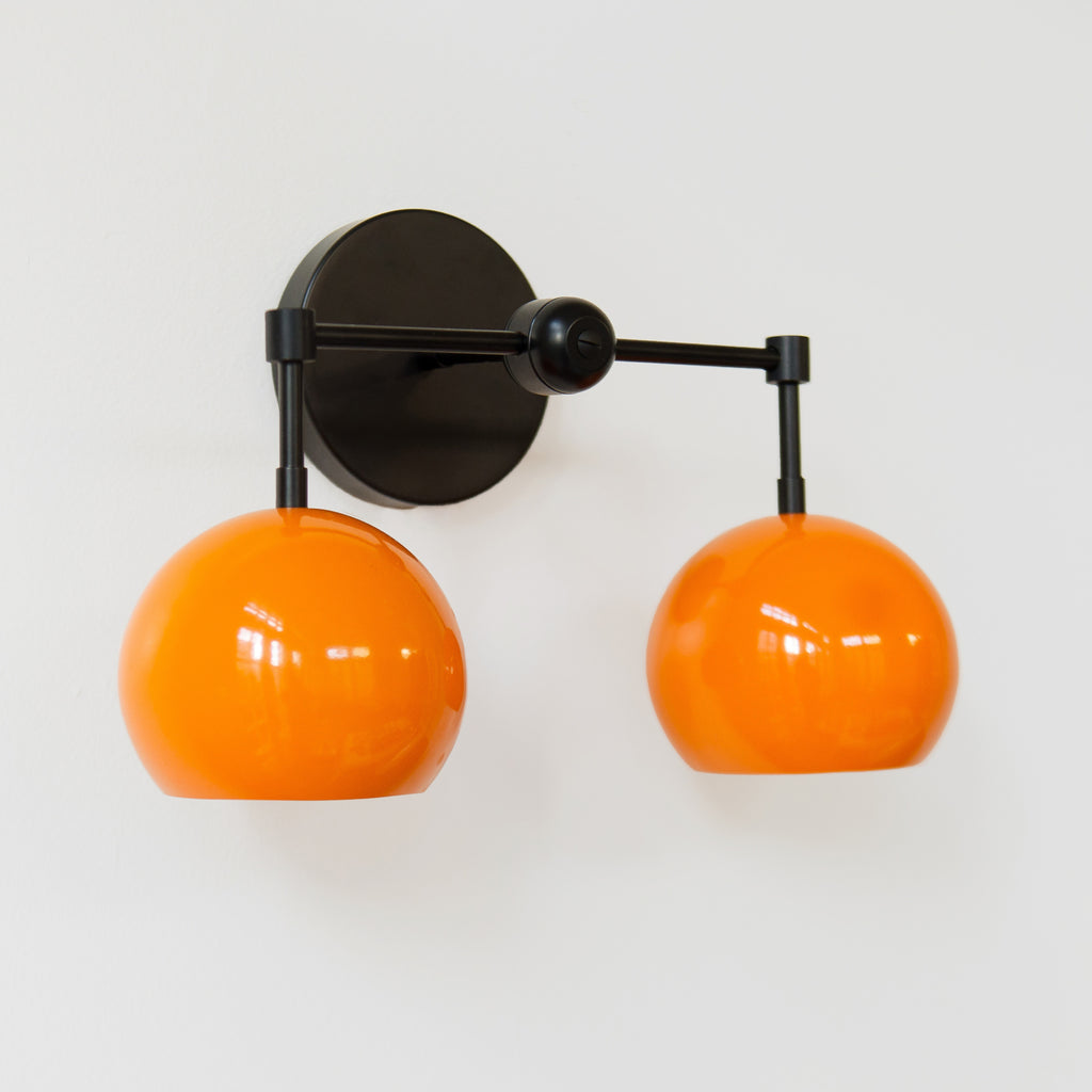 The Double Loa Sconce has a simple, minimalist design that can be fun or modern. Either way, it is bound to garner loads of compliments. This fixture is a two-light version of our single Loa sconce. The shades are globe-shaped and powdercoated in a bright orange color.